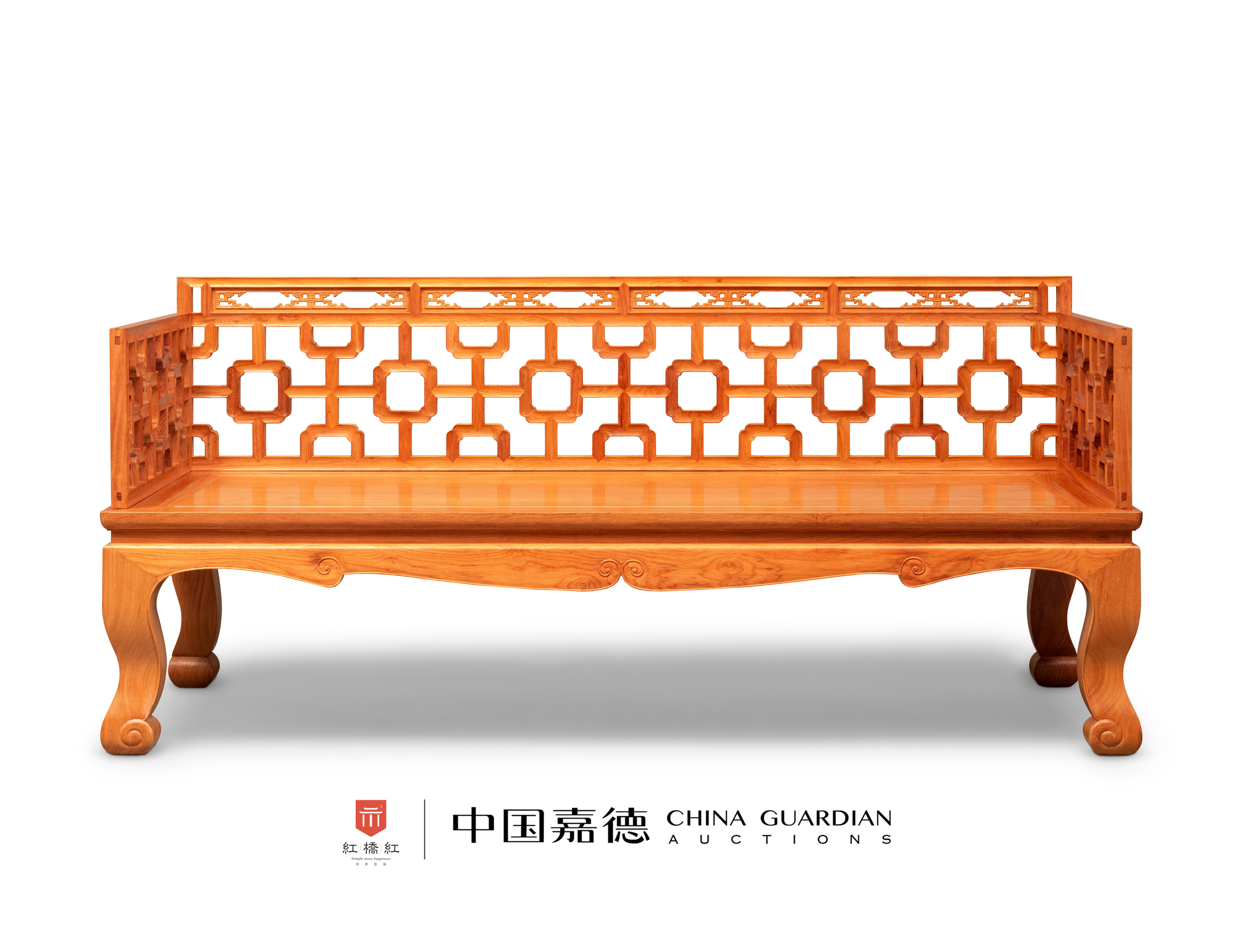 这张罗汉床以缅甸花梨制,简约的床体配三块十字连方棂格纹围板,中间围板略高,两侧略矮,玲珑雅致。围板以攒斗法制成,攒接、斗簇的技法来源于建筑工艺,而所用图案大多来源于建筑的栏杆、窗棂,通过有规律的排列组成床围,图案对称重复排列,极具形式美,攒斗式视觉效果像透雕一样,华丽空灵,倭角的曲线更是为整块围板增添了变幻追逐之美感。床面硬屉,有束腰,牙板沿边起细致的阳线,三弯腿,足端为卷云纹。