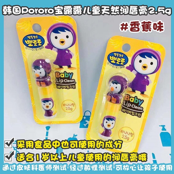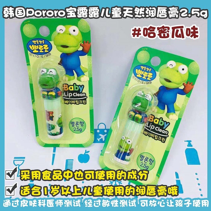 韩国Pororo宝露露儿童天然润唇膏2.5g#草莓味/#哈密瓜味/#香蕉味/#葡萄味👍适合1岁以上儿童使用的润唇膏哦👼,采用食品中也可使用的成分✅,温和滋润💦,可安心用于儿童唇部肌肤👅~有助于预防和改善儿童唇部肌肤干燥开裂等现象🧐,保持滋润。膏体柔滑☁,涂抹舒适。👉本产品根据贝亲婴儿化妆品标准研制而成的哦,通过皮肤科医师测试🏥,经过敏性测试,可放心让孩子使用😇!