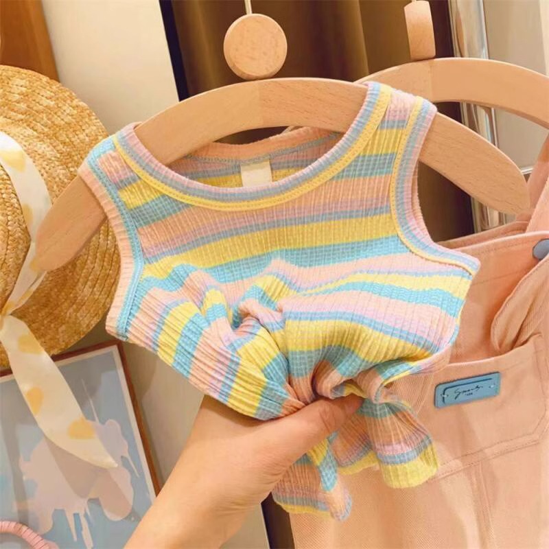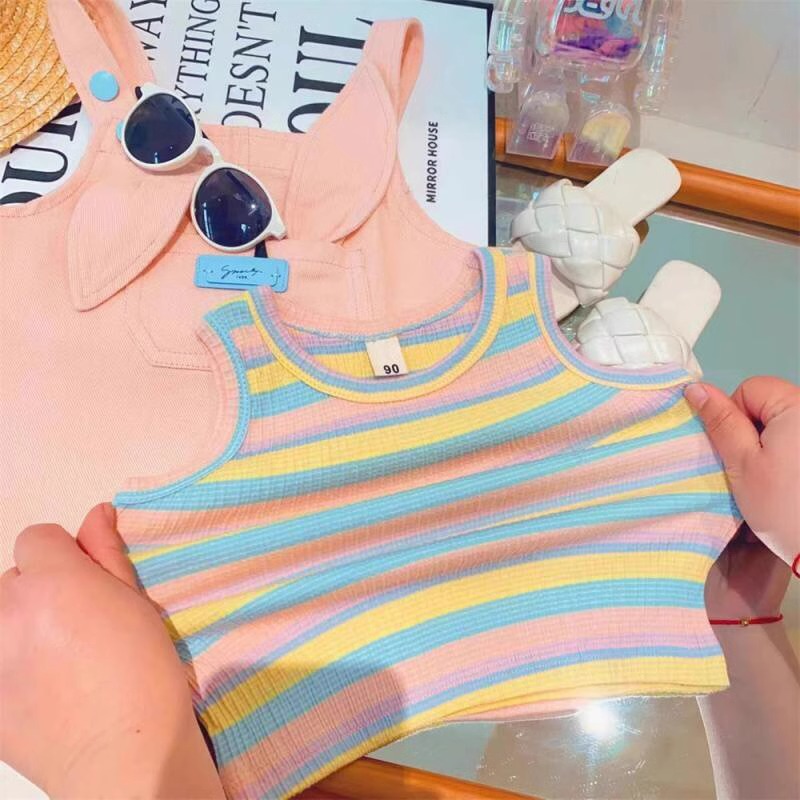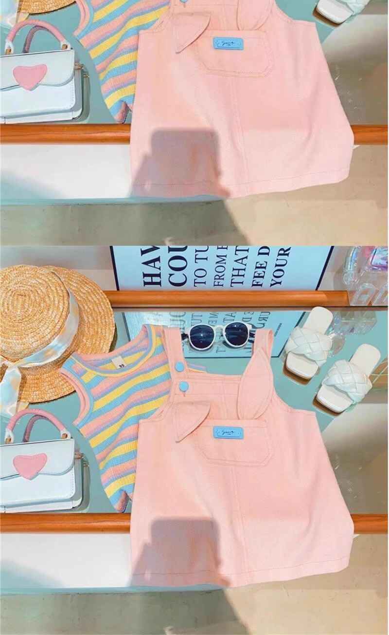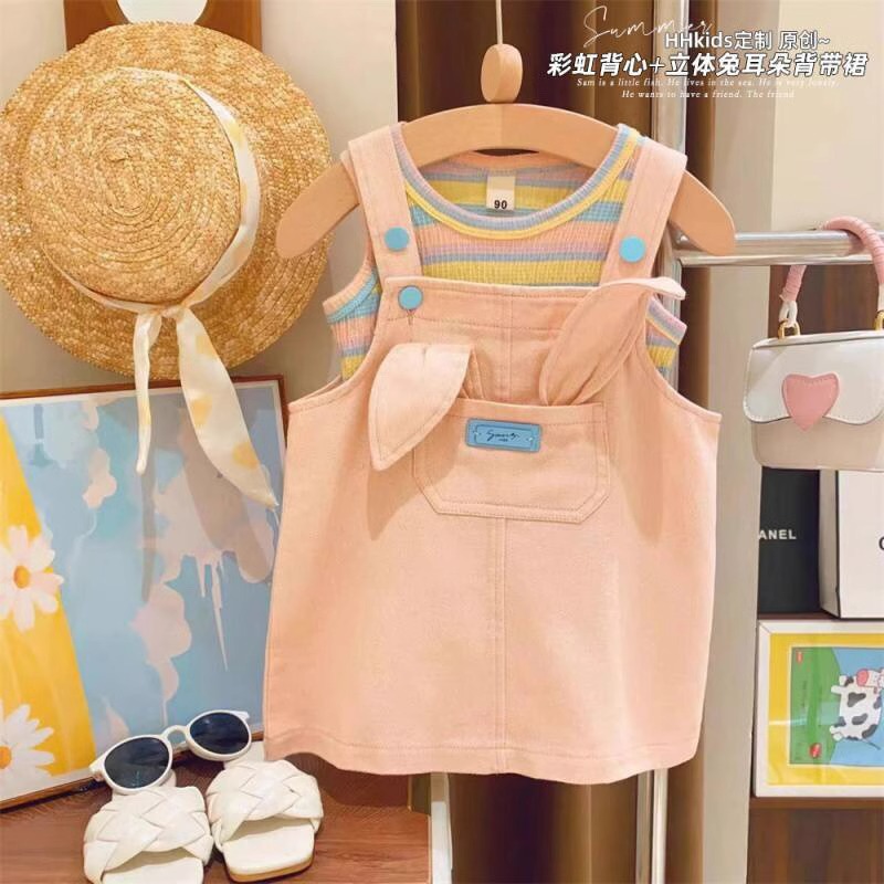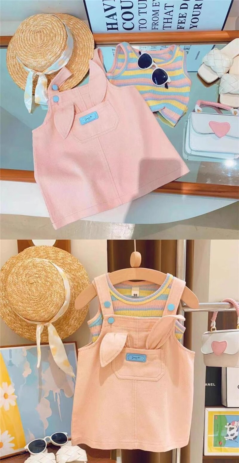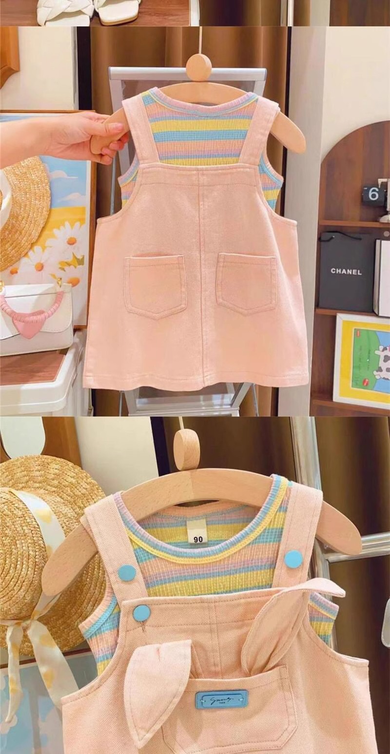 【女童多巴胺穿搭套装,小兔条纹T恤+韩版洋气背带裙,清新可爱又时尚】女童多巴胺穿搭夏背带裙套装 韩版洋气宝宝可爱小兔条纹T恤两件套-QQ