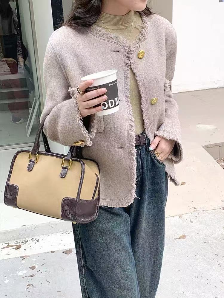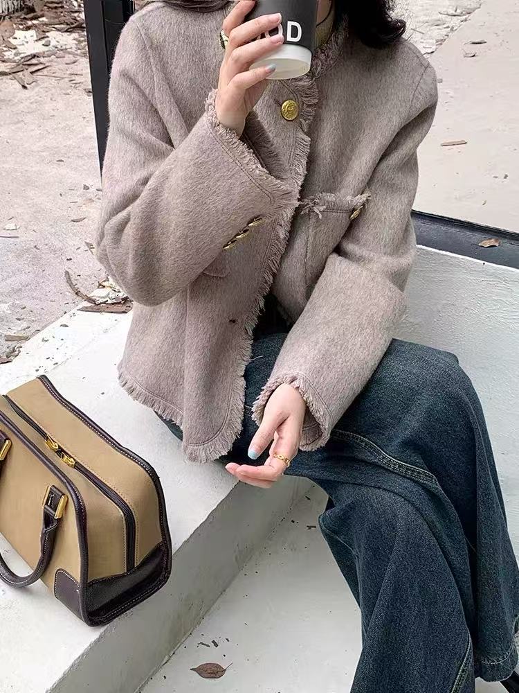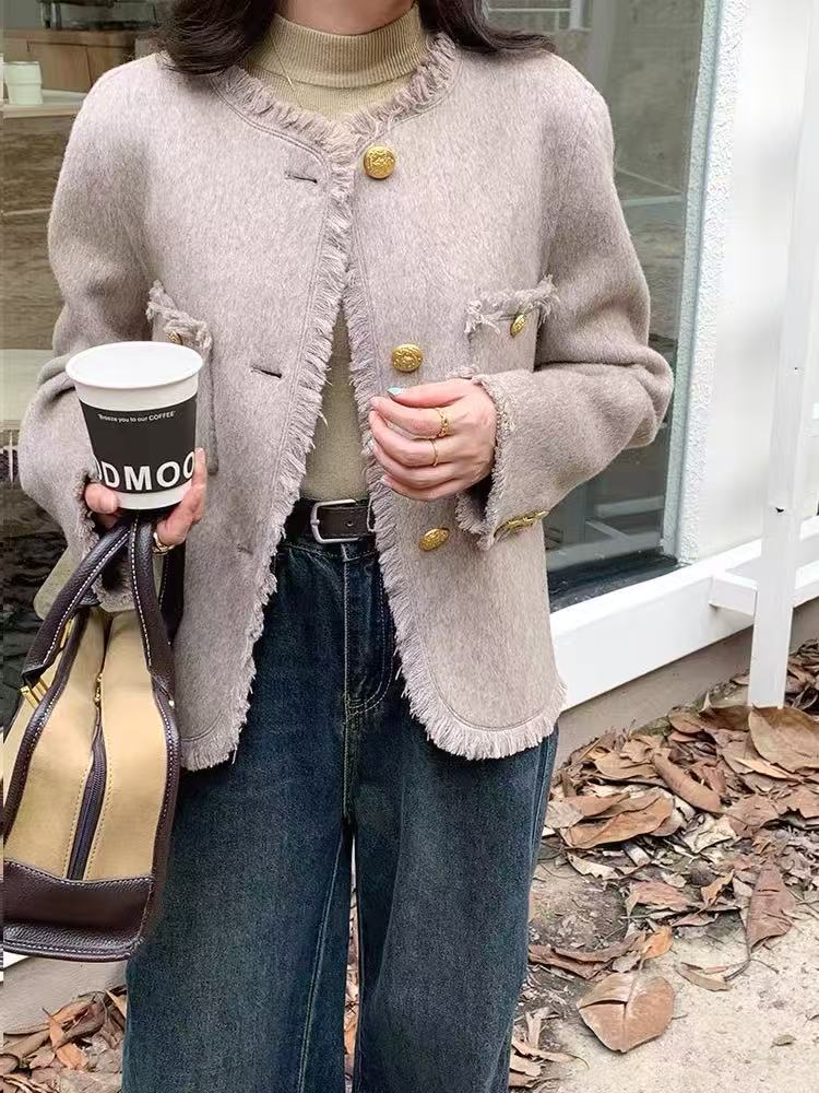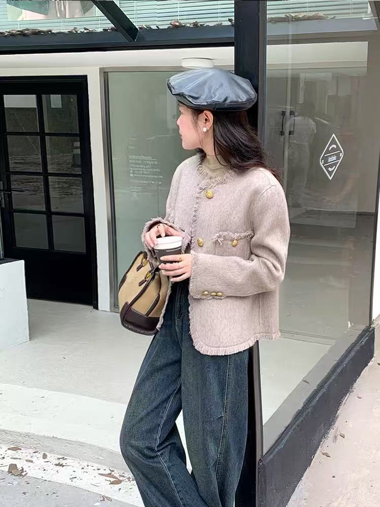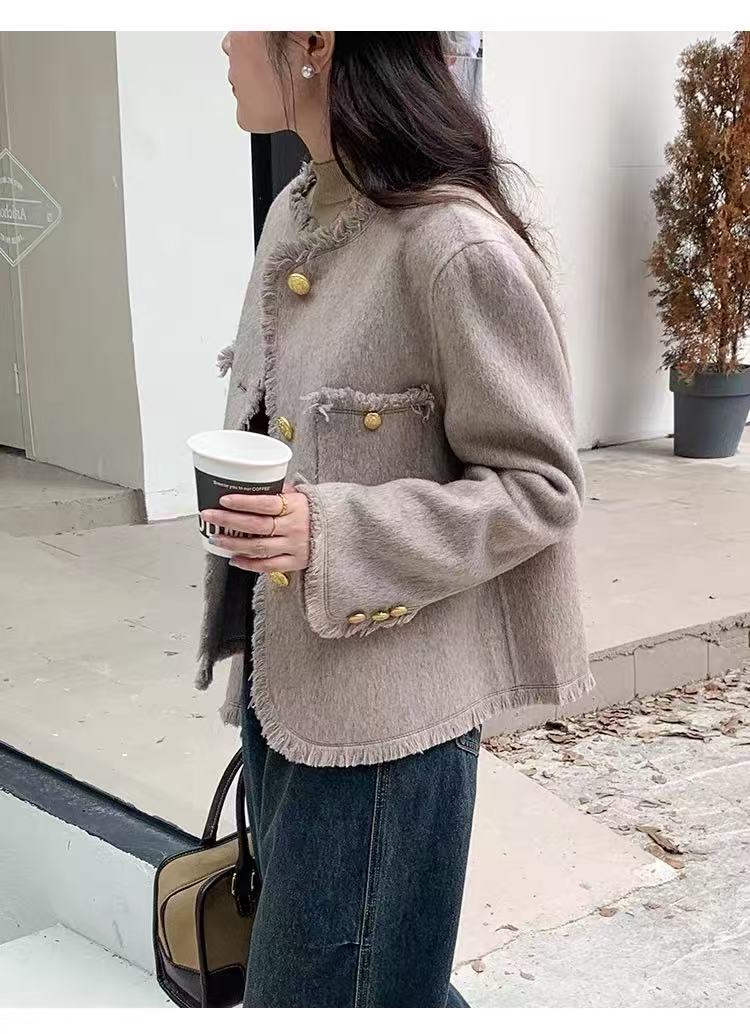 【高端系列】手工定制2319款70%绵羊毛短款流苏小香风双面尼外套-喜出