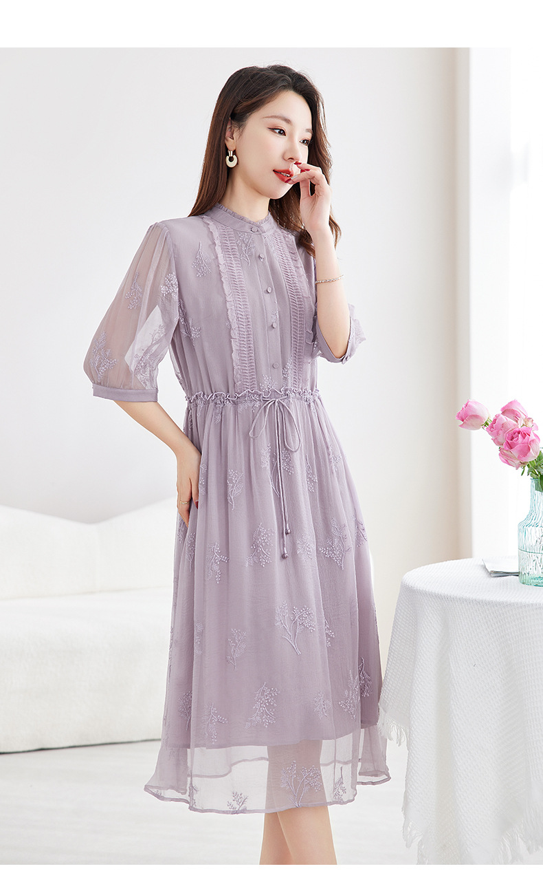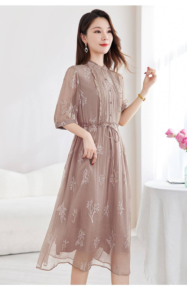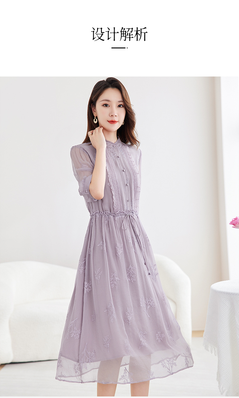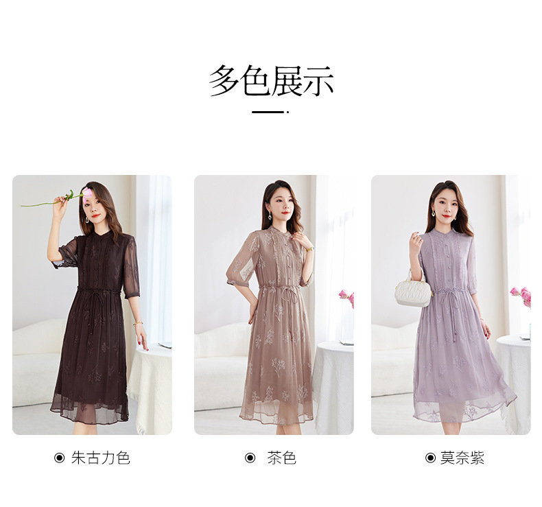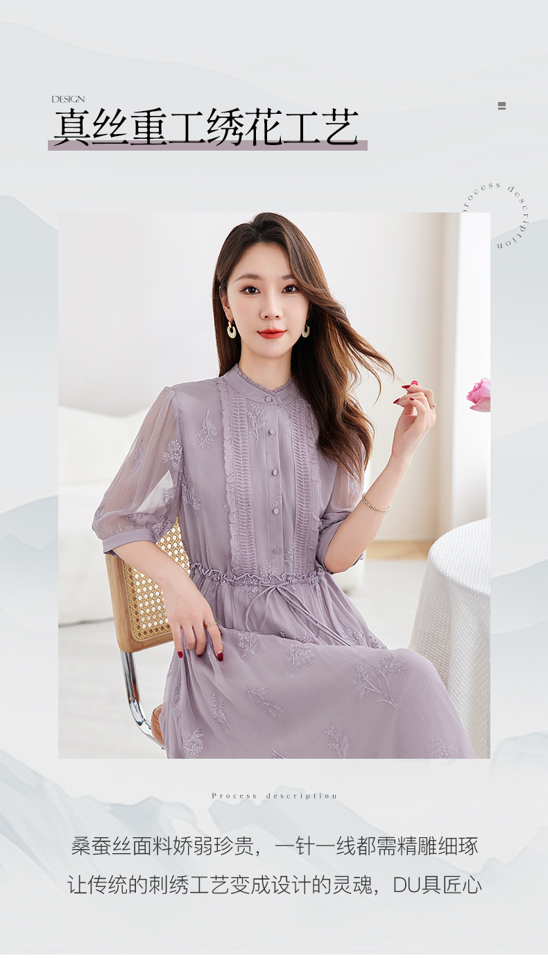 QS-82599098真丝顺宇重工绣花立领中长裙子调节腰显瘦气质桑蚕丝连衣裙女9098