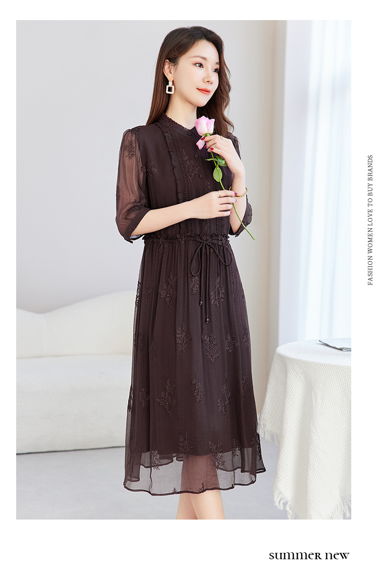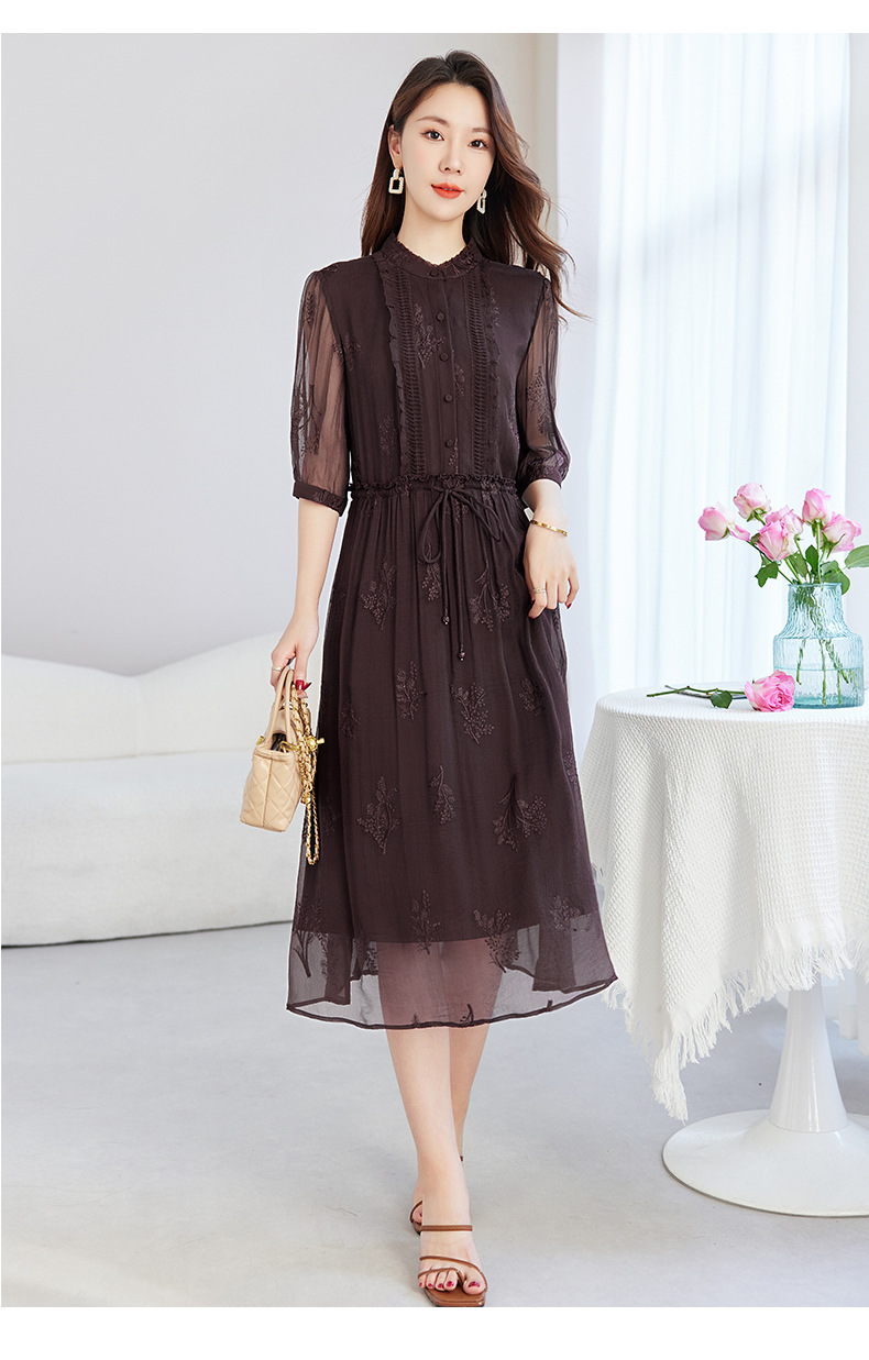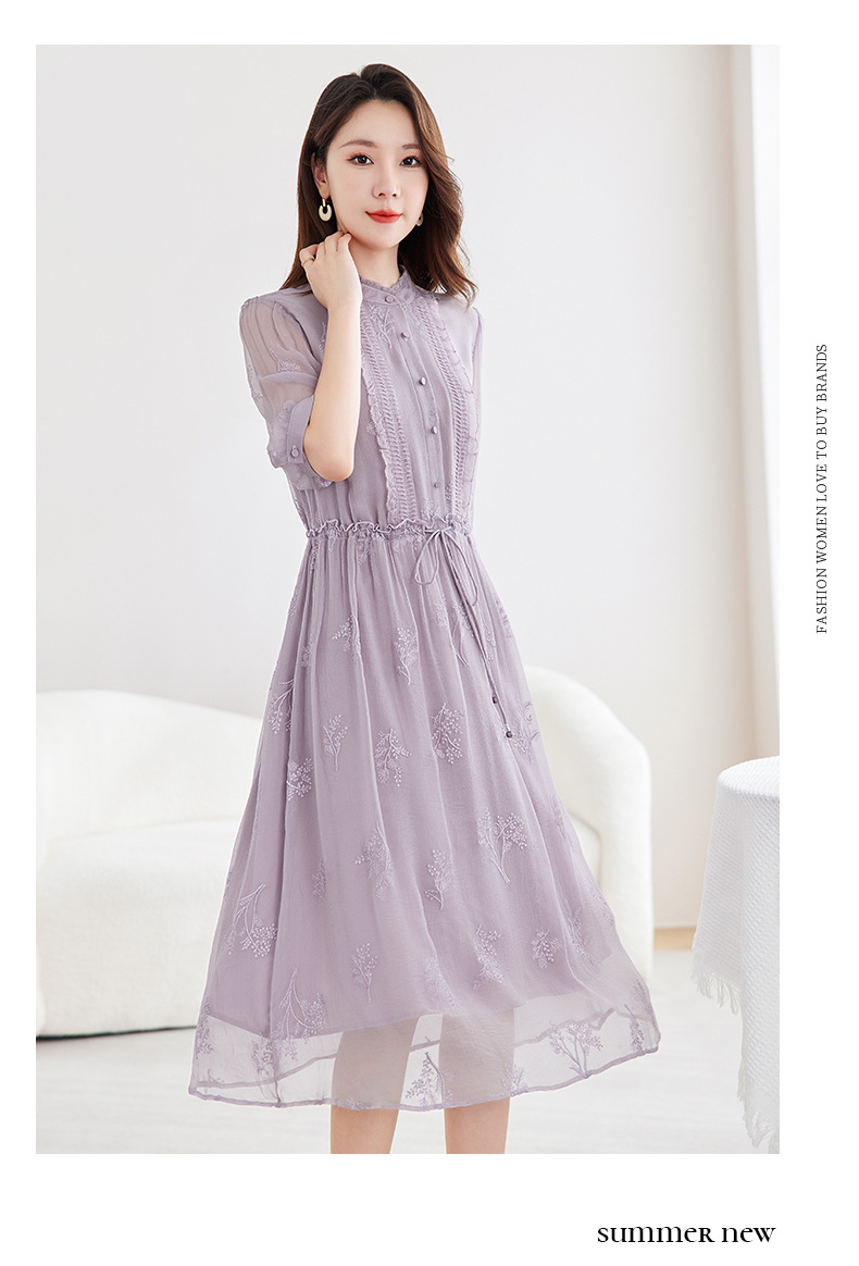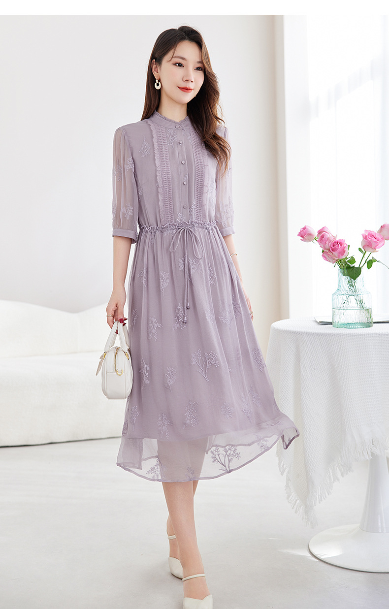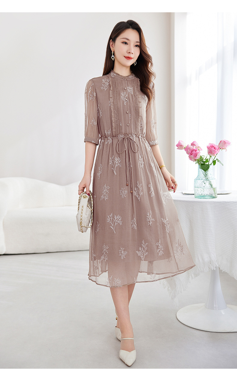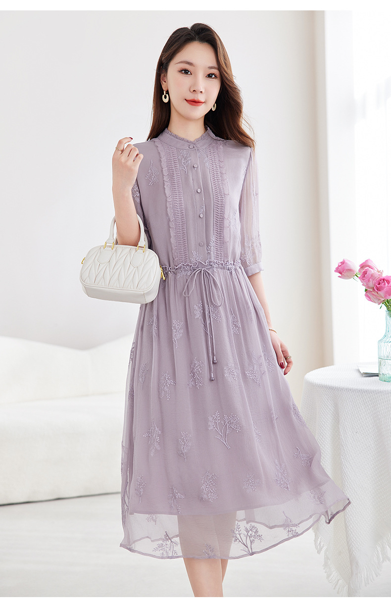 QS-82599098真丝顺宇重工绣花立领中长裙子调节腰显瘦气质桑蚕丝连衣裙女9098
