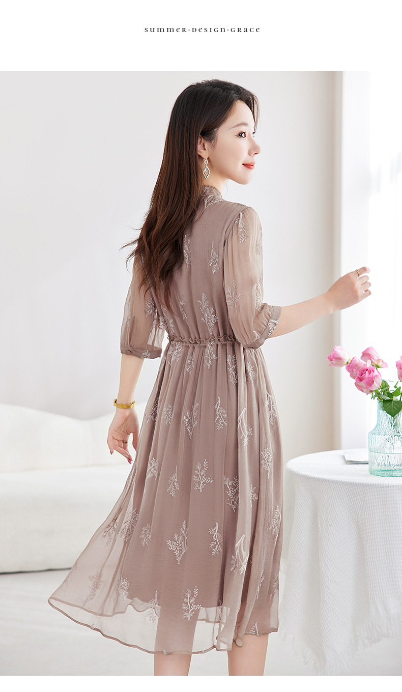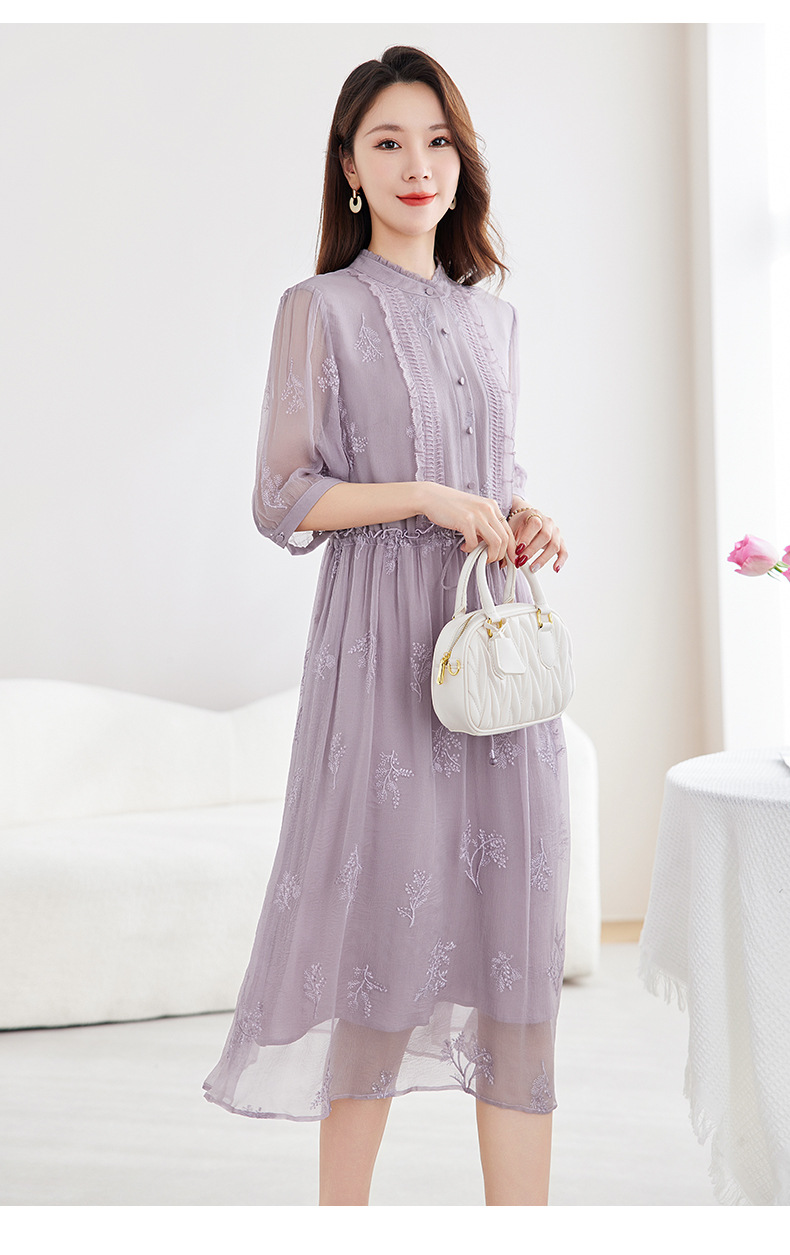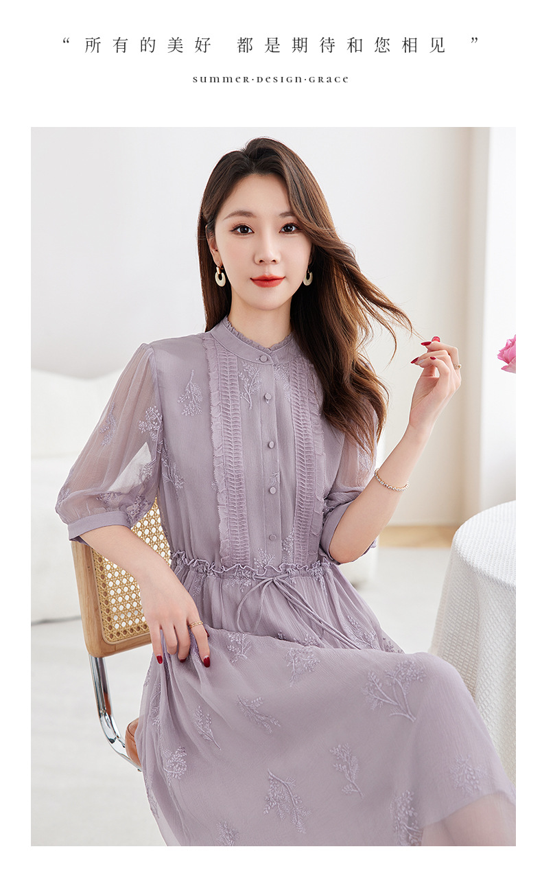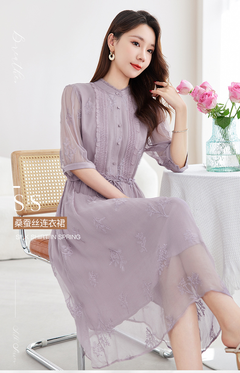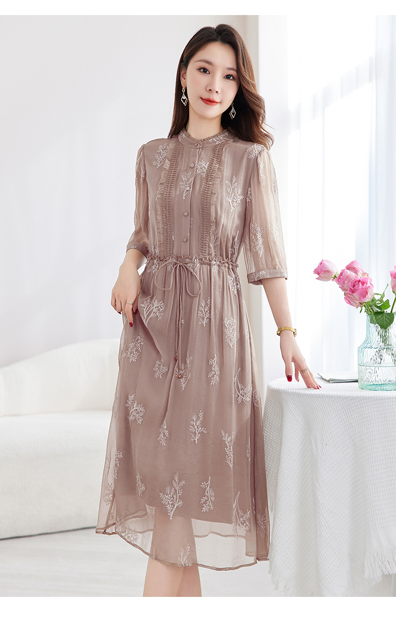 QS-82599098真丝顺宇重工绣花立领中长裙子调节腰显瘦气质桑蚕丝连衣裙女9098