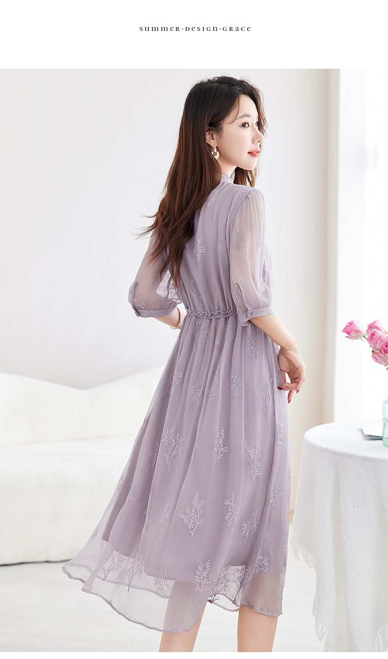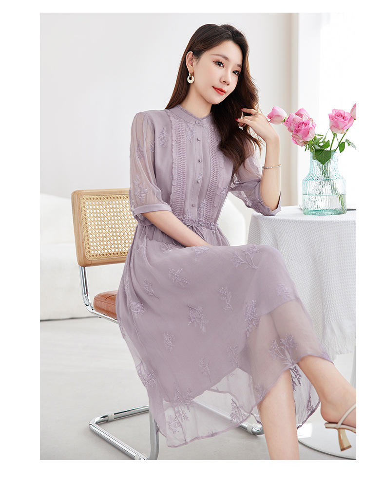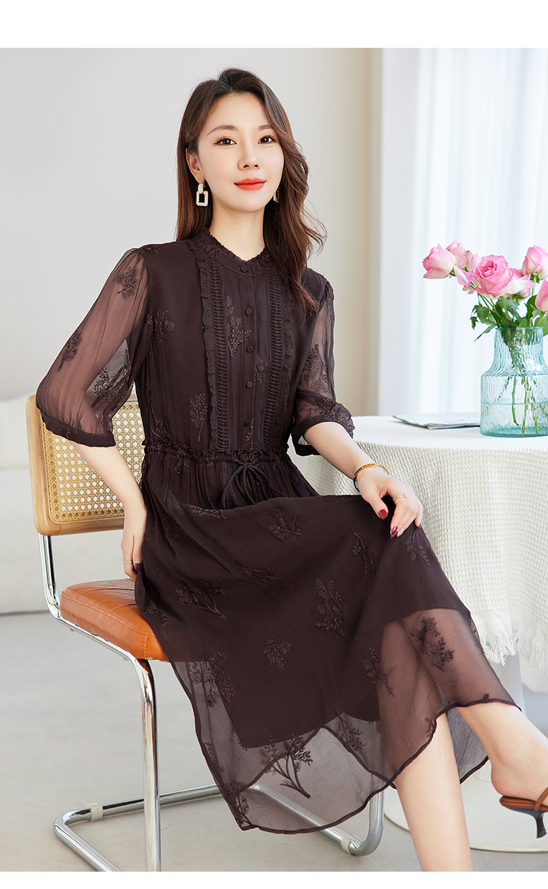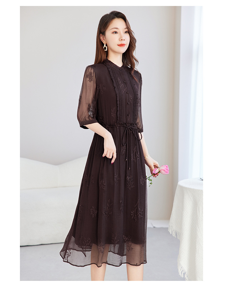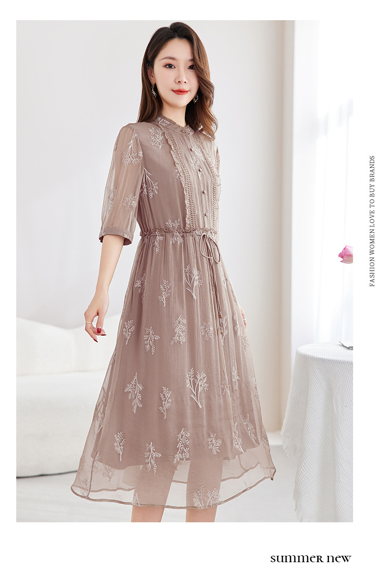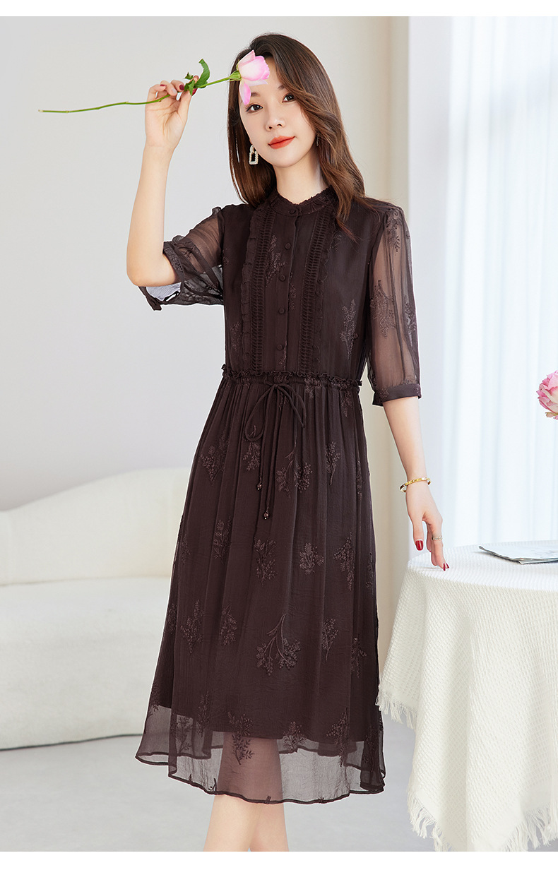 QS-82599098真丝顺宇重工绣花立领中长裙子调节腰显瘦气质桑蚕丝连衣裙女9098