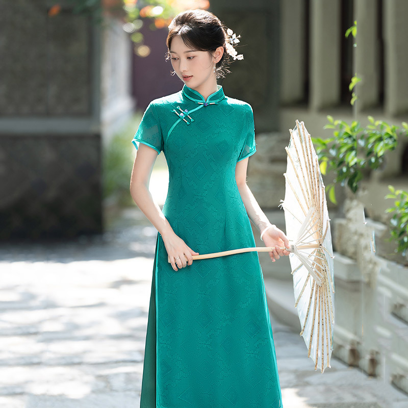 SC21819 2025春夏新款剪花奥黛复古长旗袍文艺风改良新中式优雅女修身国风