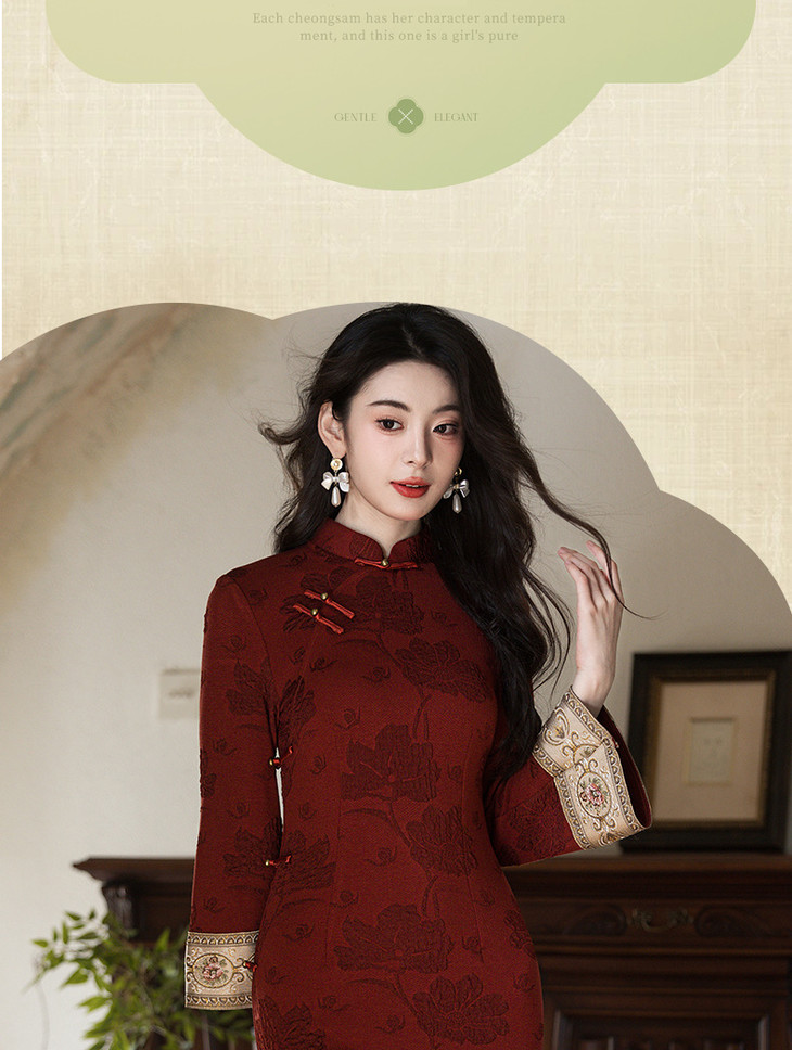 新中式酒红色复古倒大袖旗袍弹力珠光棉订婚礼服敬酒服旗袍JLM6220