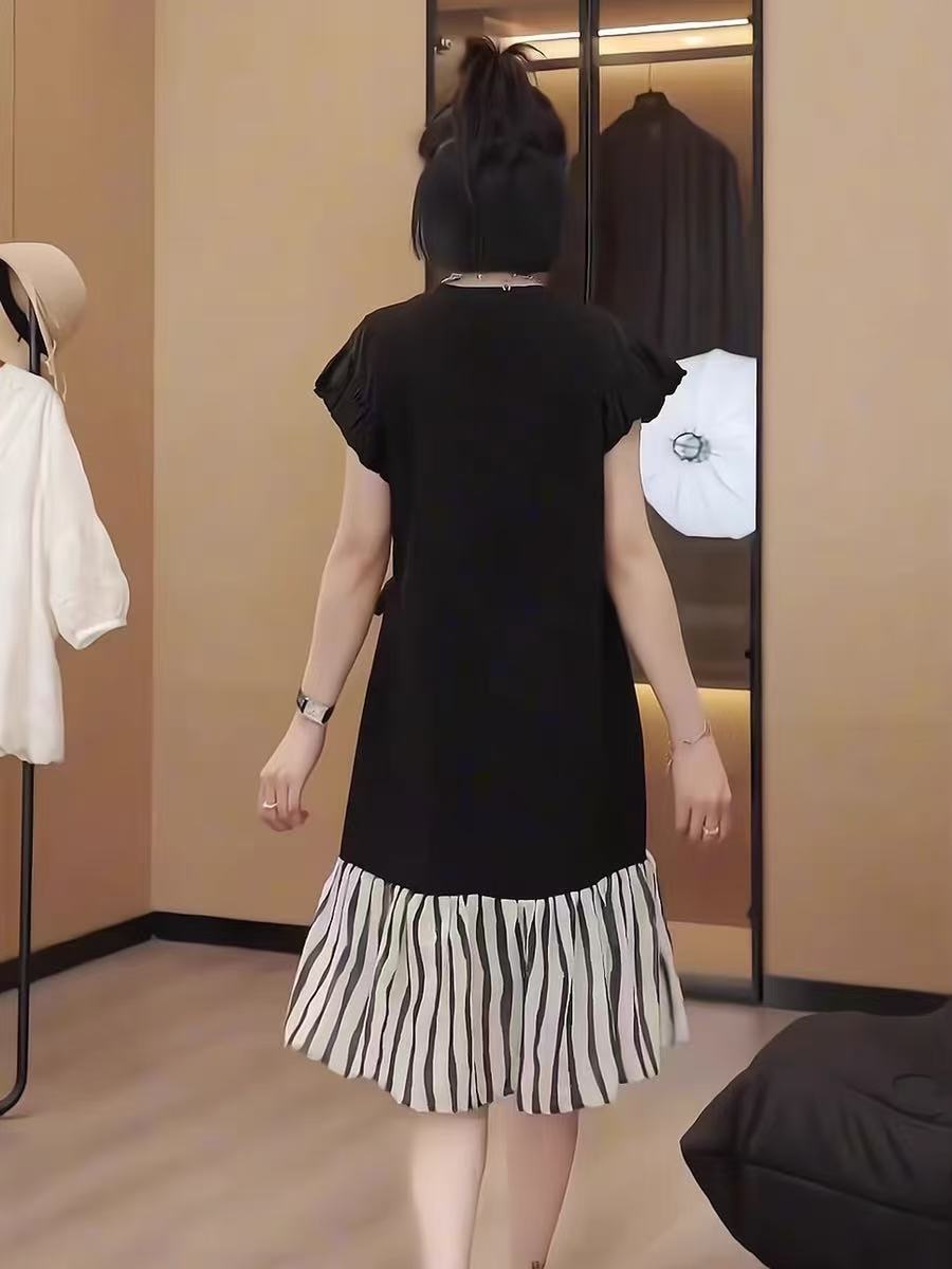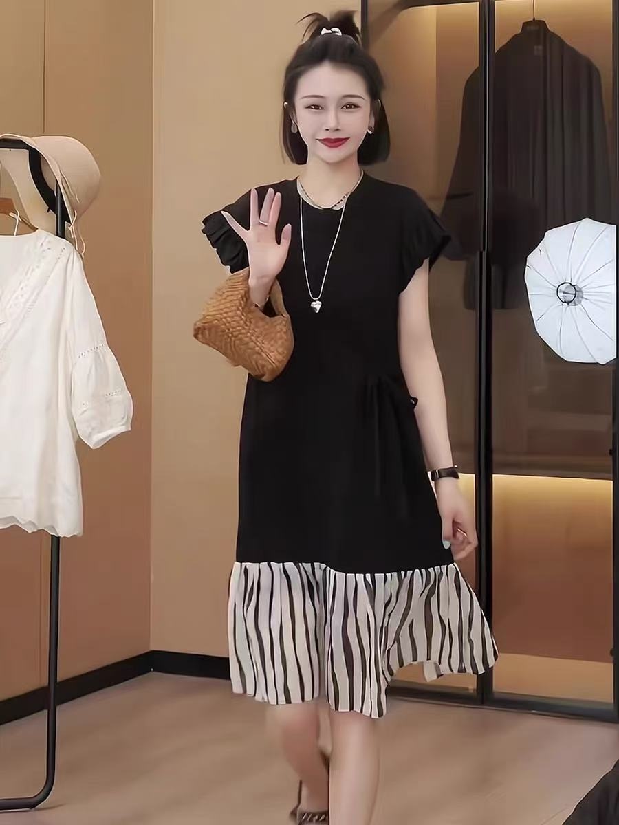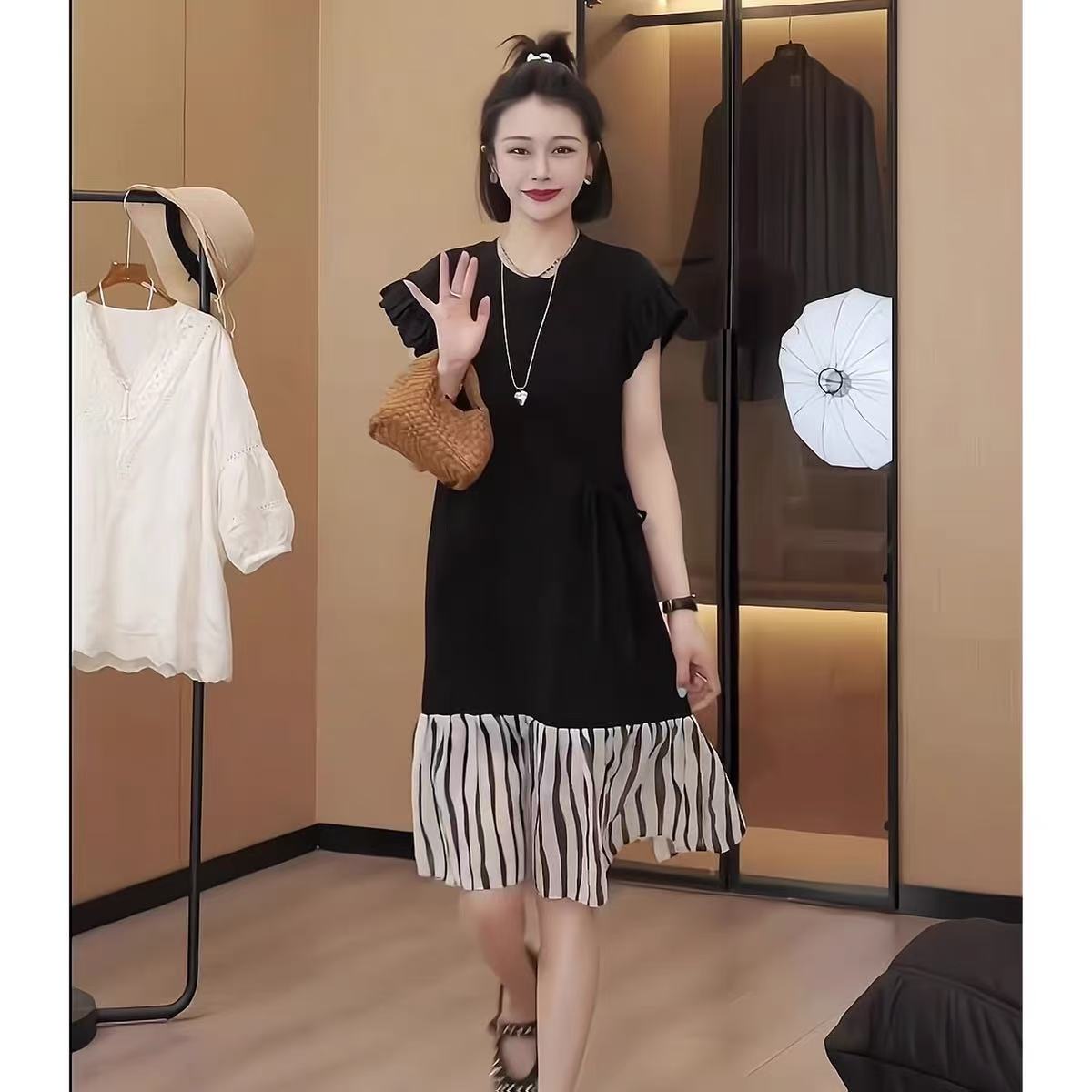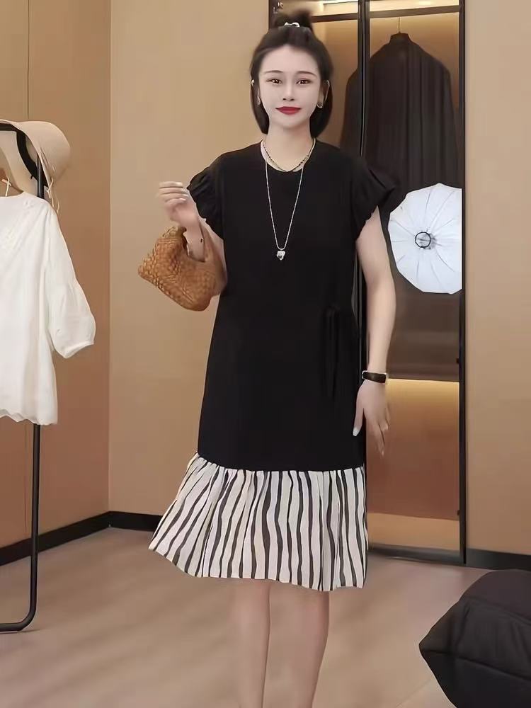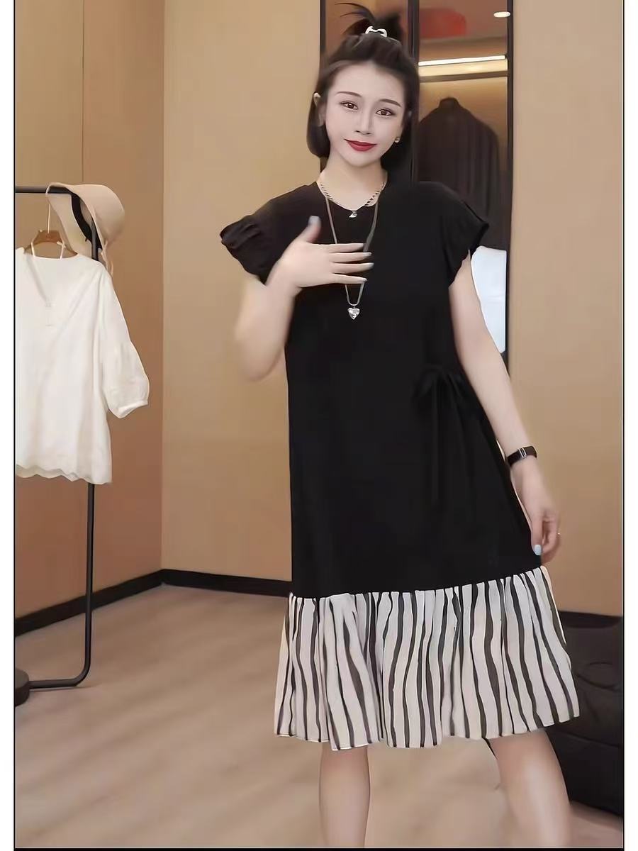 【MYBL】8651珠地网眼拼接条纹下摆系带连衣裙-喜出