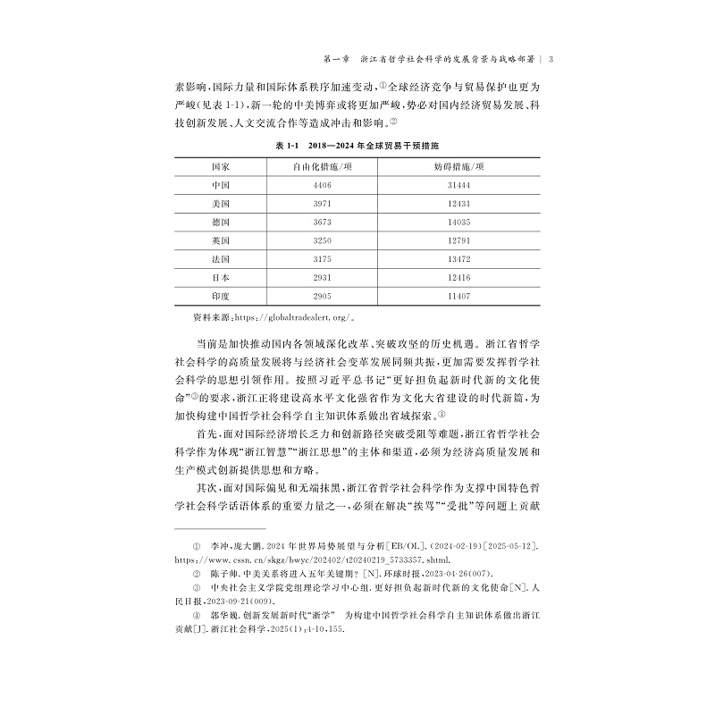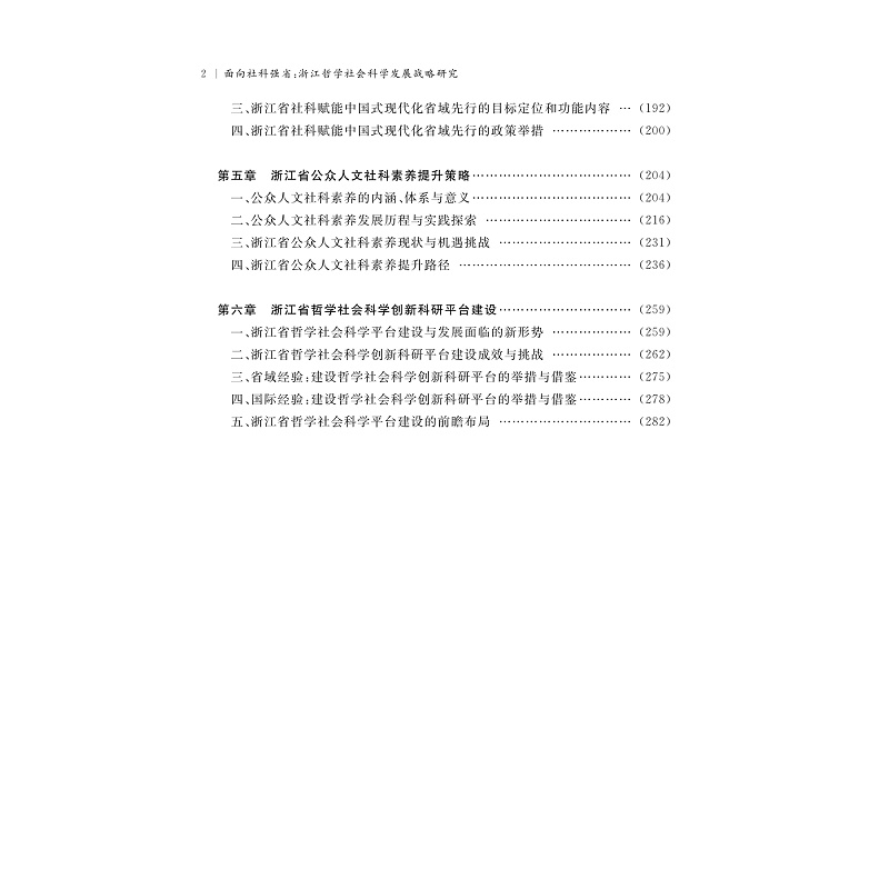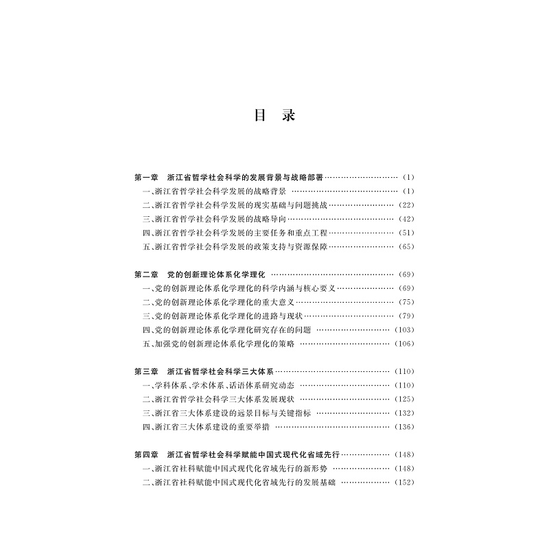 本书针对浙江哲学社会科学创新科研平台展开研究,旨在提升浙江公众人文社会科学素养, 书稿共分六章,重点从研究动态、发展现状、关键指标分析、重点举措等方面展开。第一章从整体上分析浙江哲学社会科学发展的战略背景、成效、问题与推进的工程项目及保障举措;第二章为党的创新理论体系学理化,重点研究核心要义、进路与现状、问题与不足、出路与展望;第三章为浙江哲学社会科学学科体系、学术体系和话语体系;第四章为重点围绕新形势新要求、经验分析、功能定位、政策举措等方面;第五章从面临形势、国际经验、典型做法、问题挑战、重点任务及推进路径等方面;第六章从成效与挑战、兄弟省份及国外的举措与借鉴、前瞻布局等方面入手剖析。