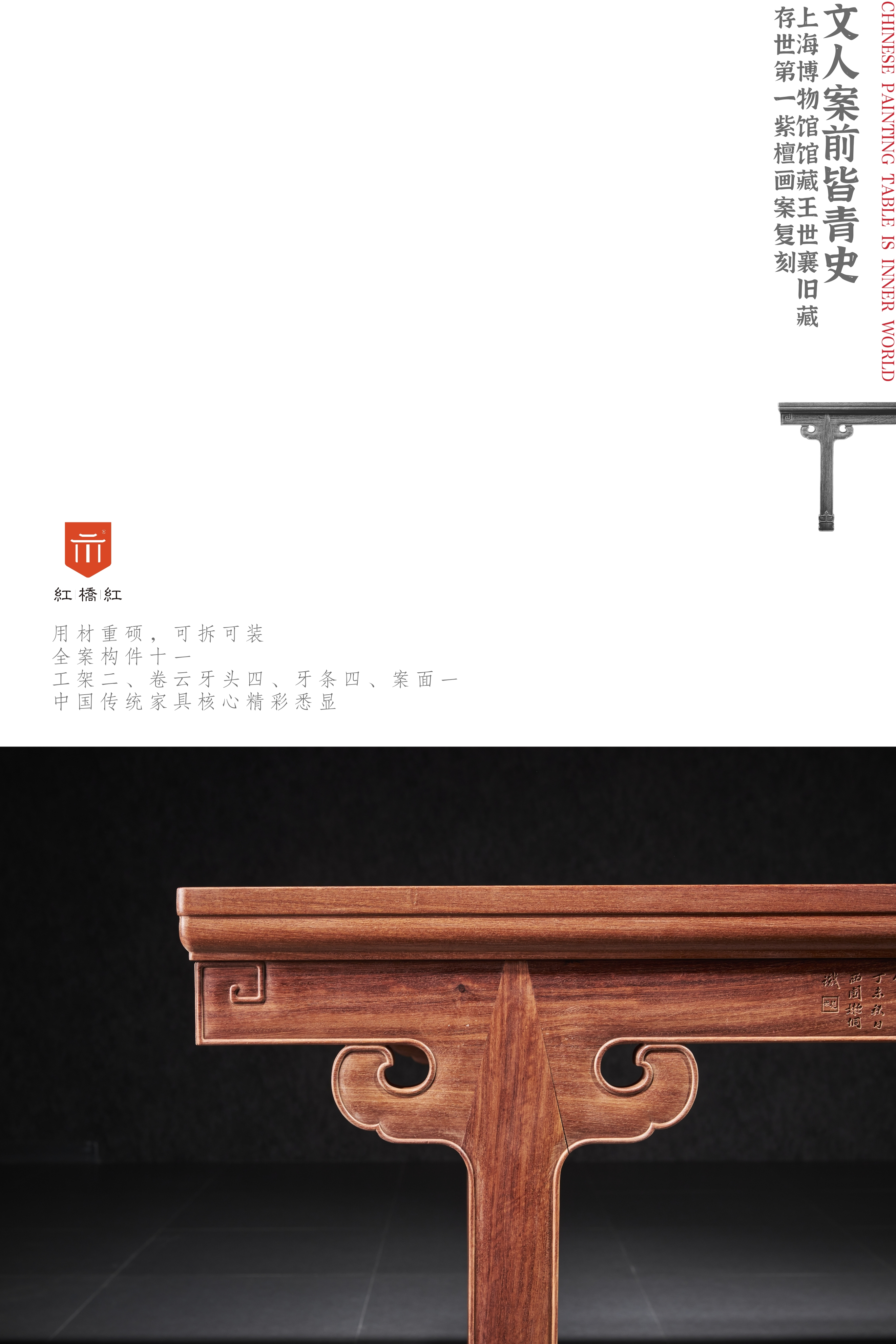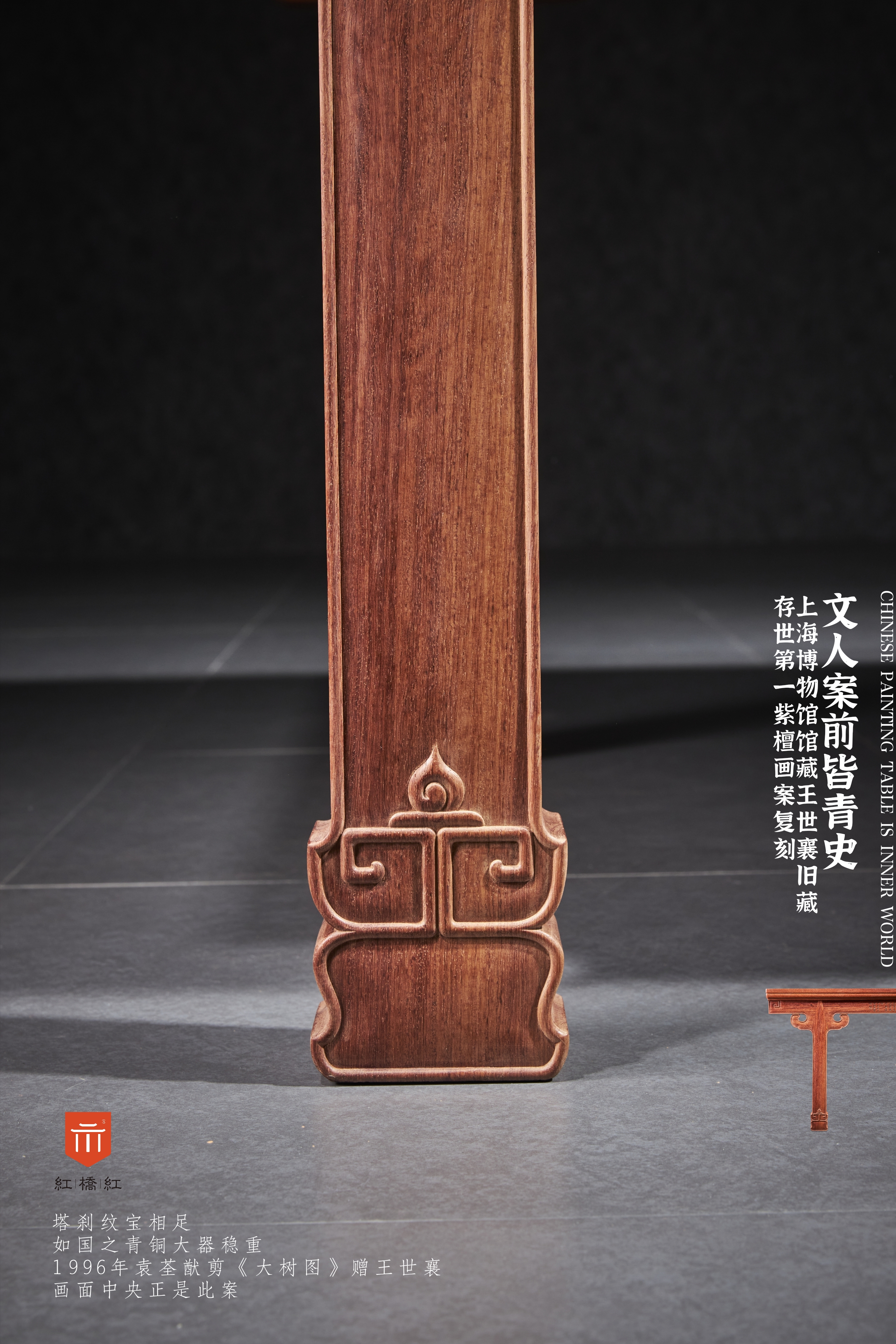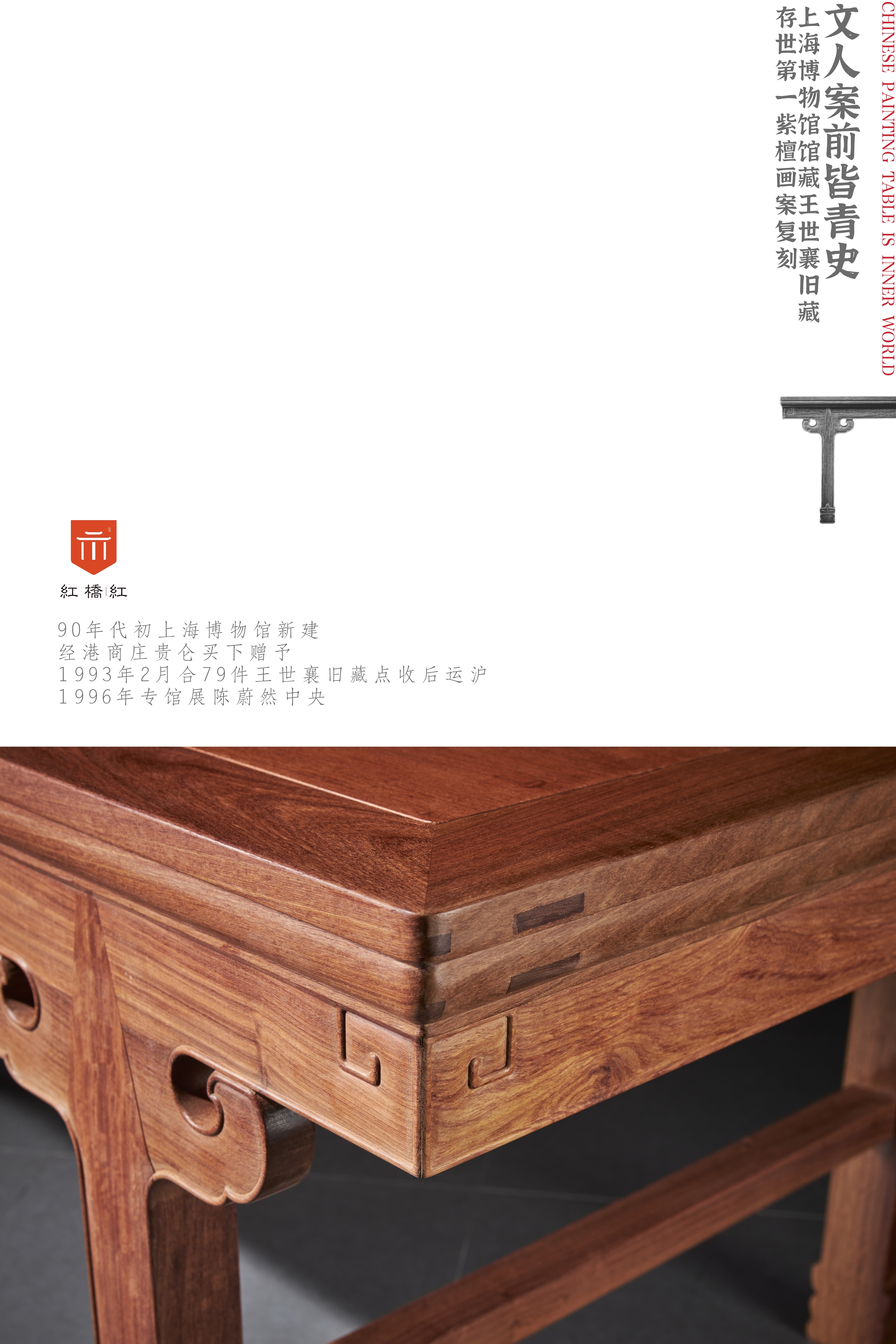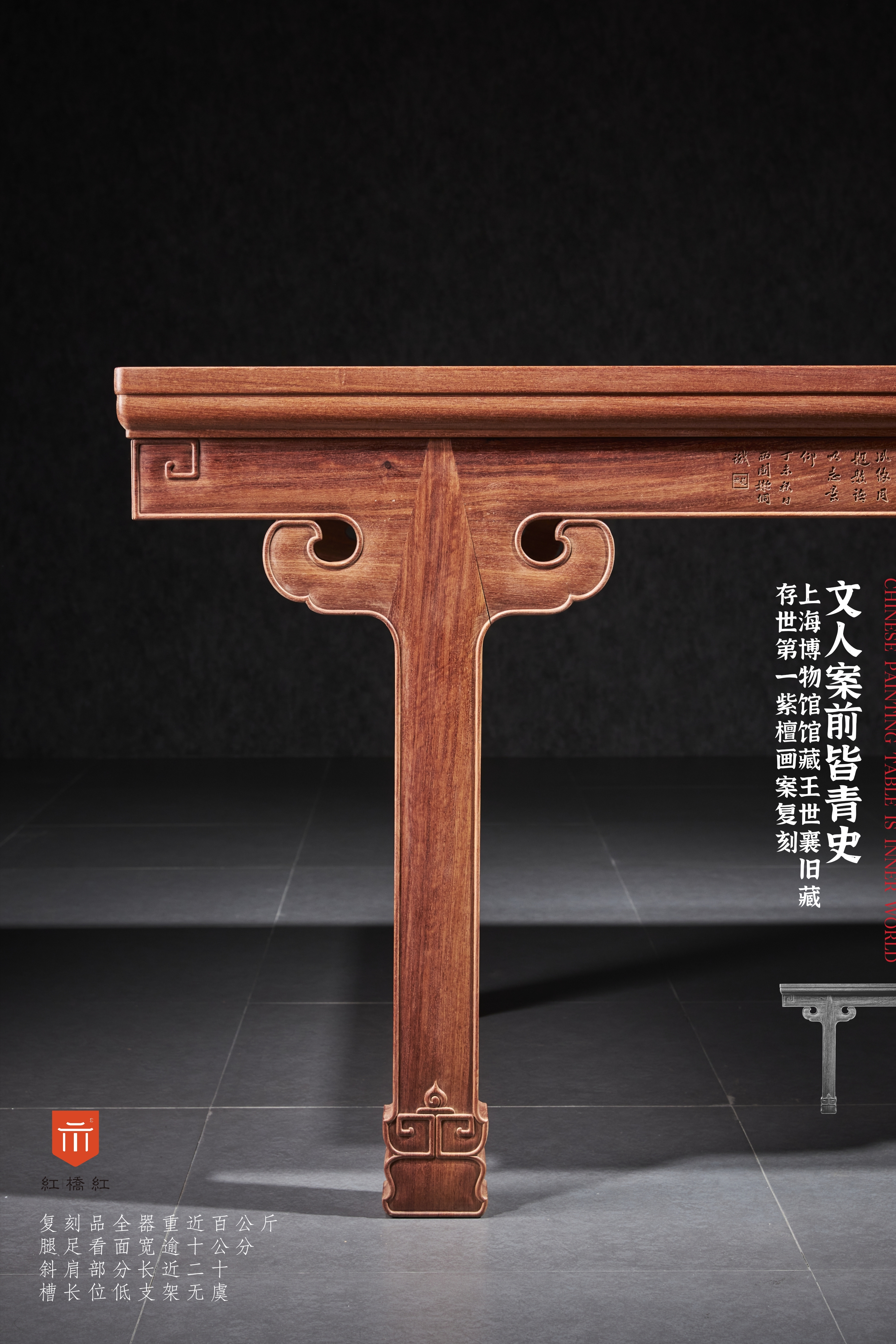原型为上海博物馆明清家具馆王世襄先生旧藏紫檀插肩榫大画案,是目前所见国内外最大的一件,被明清家具研究界公认为重器中的重器,因画案形制巨大,且出自名门望族之家,向来被推为“存世第一紫檀画案”。