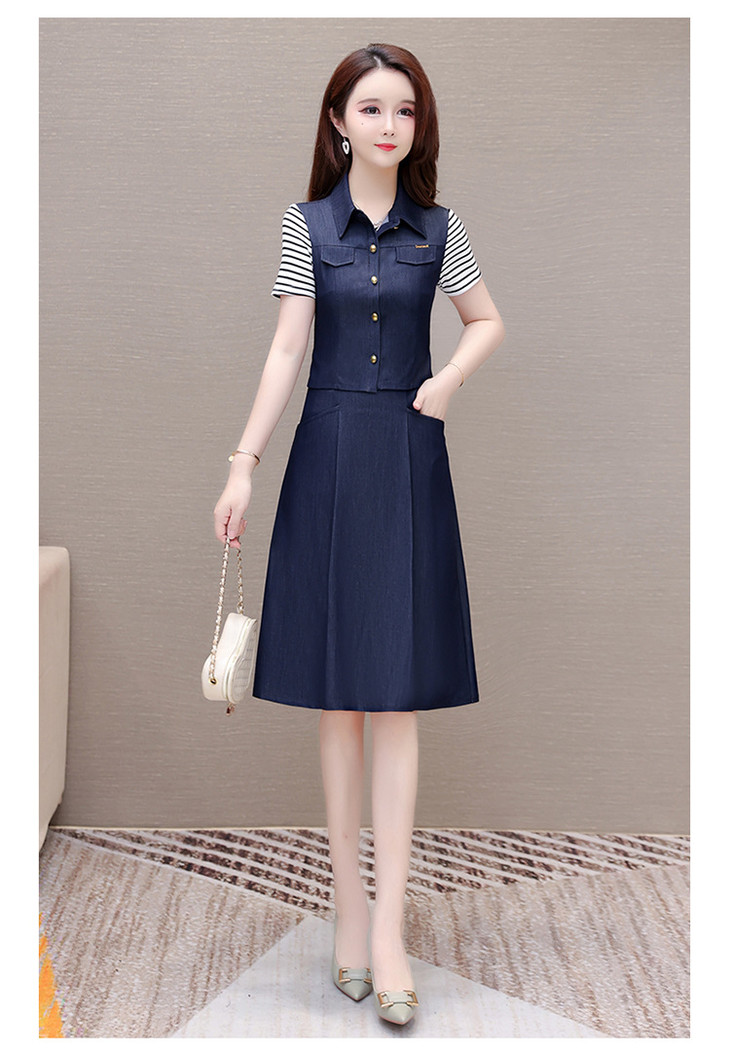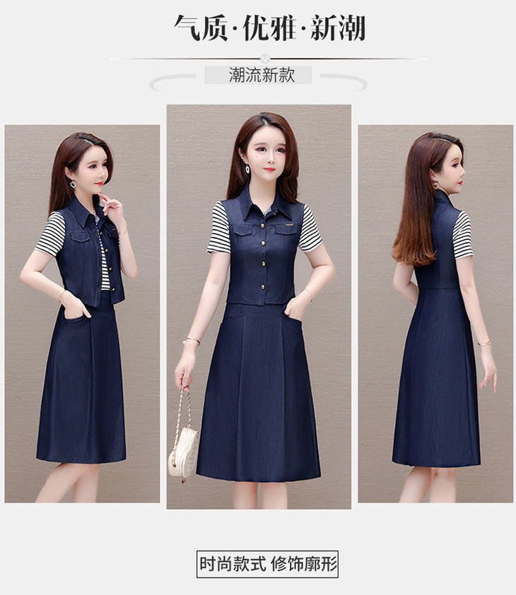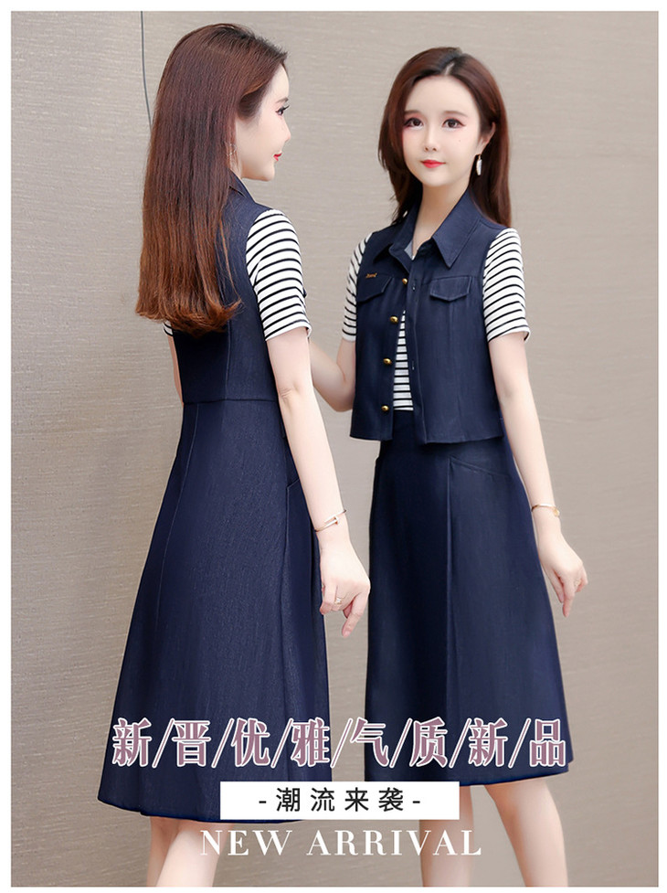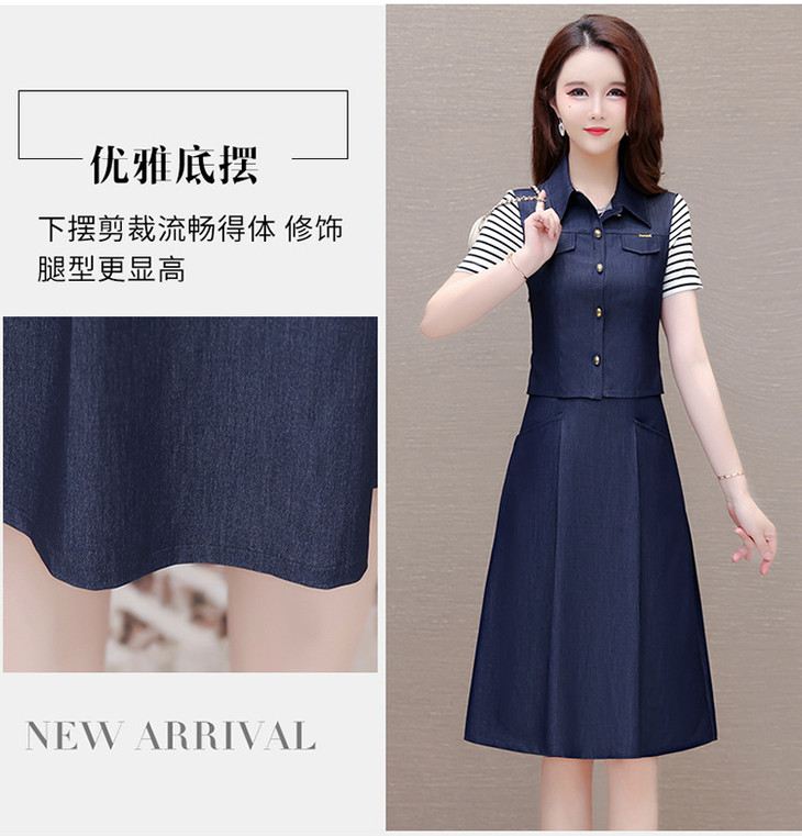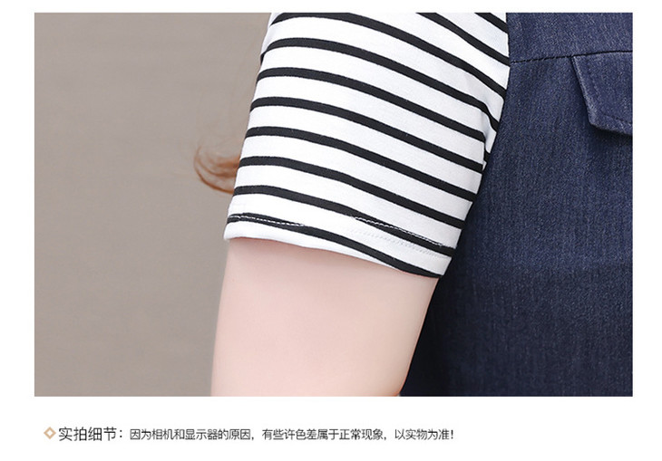QYMOMS-YQA417-L-2024年夏款中长款条纹短袖拼接时尚连衣裙POLO领显瘦假两件A字裙