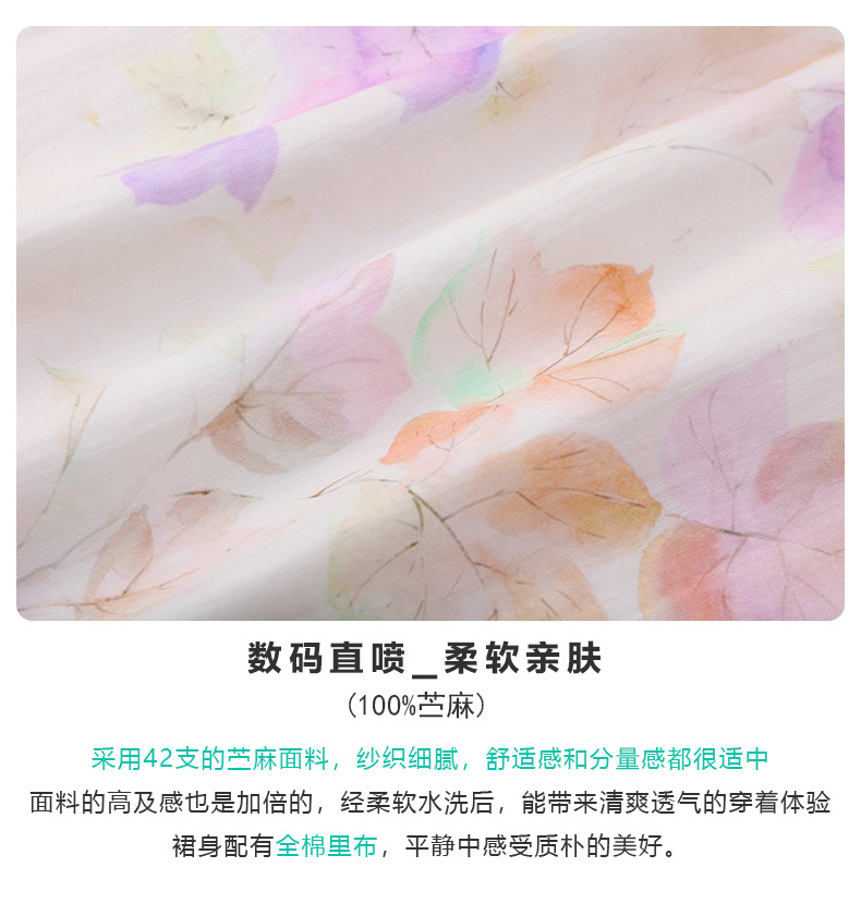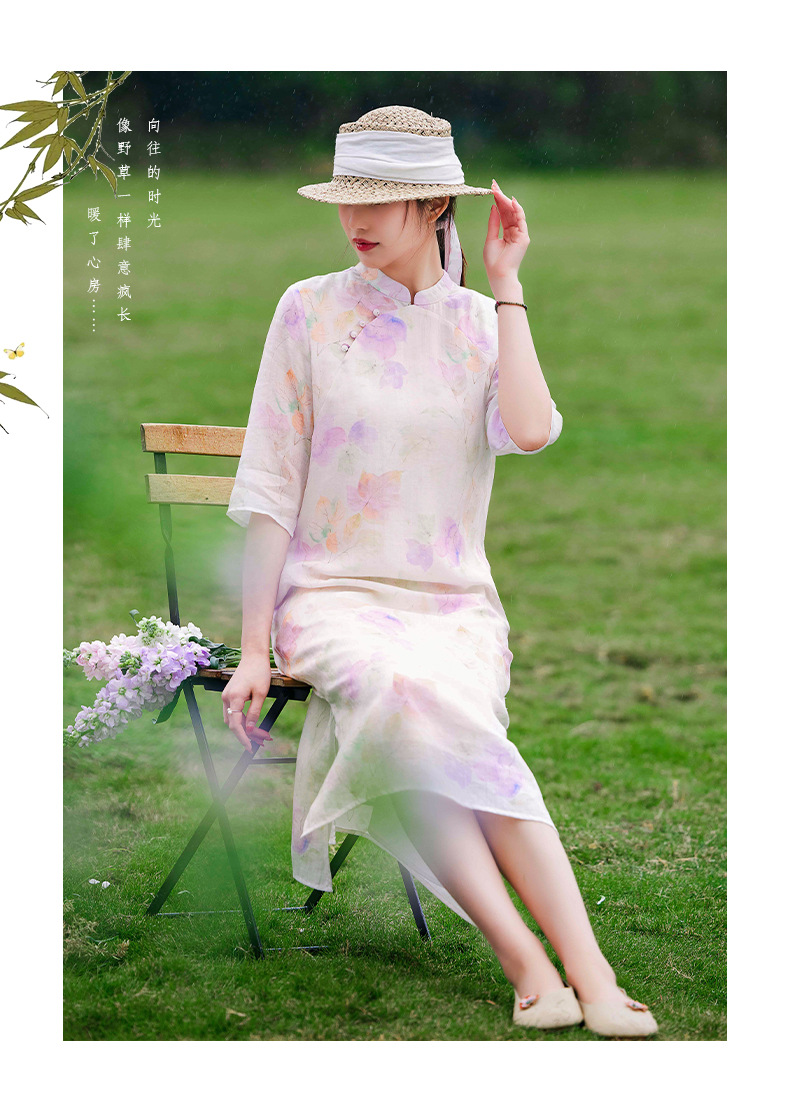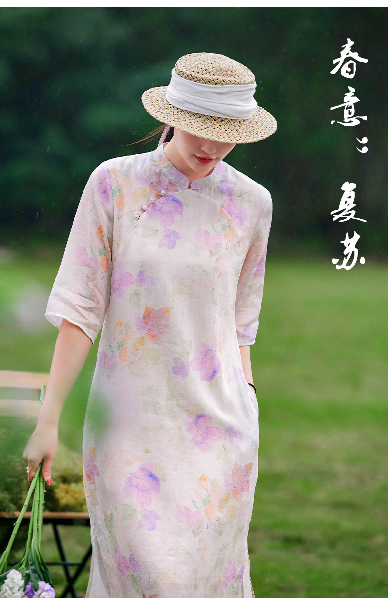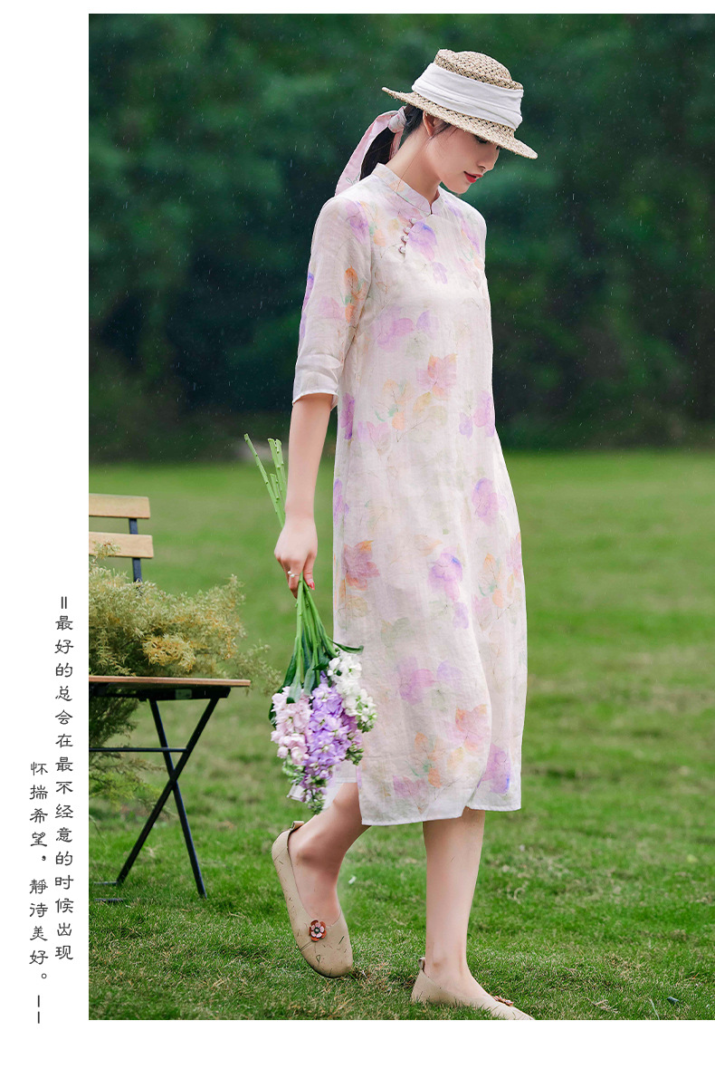 HM-S234-3春夏新款原创文艺立领苎麻印花改良旗袍侧开叉复古素雅连衣裙