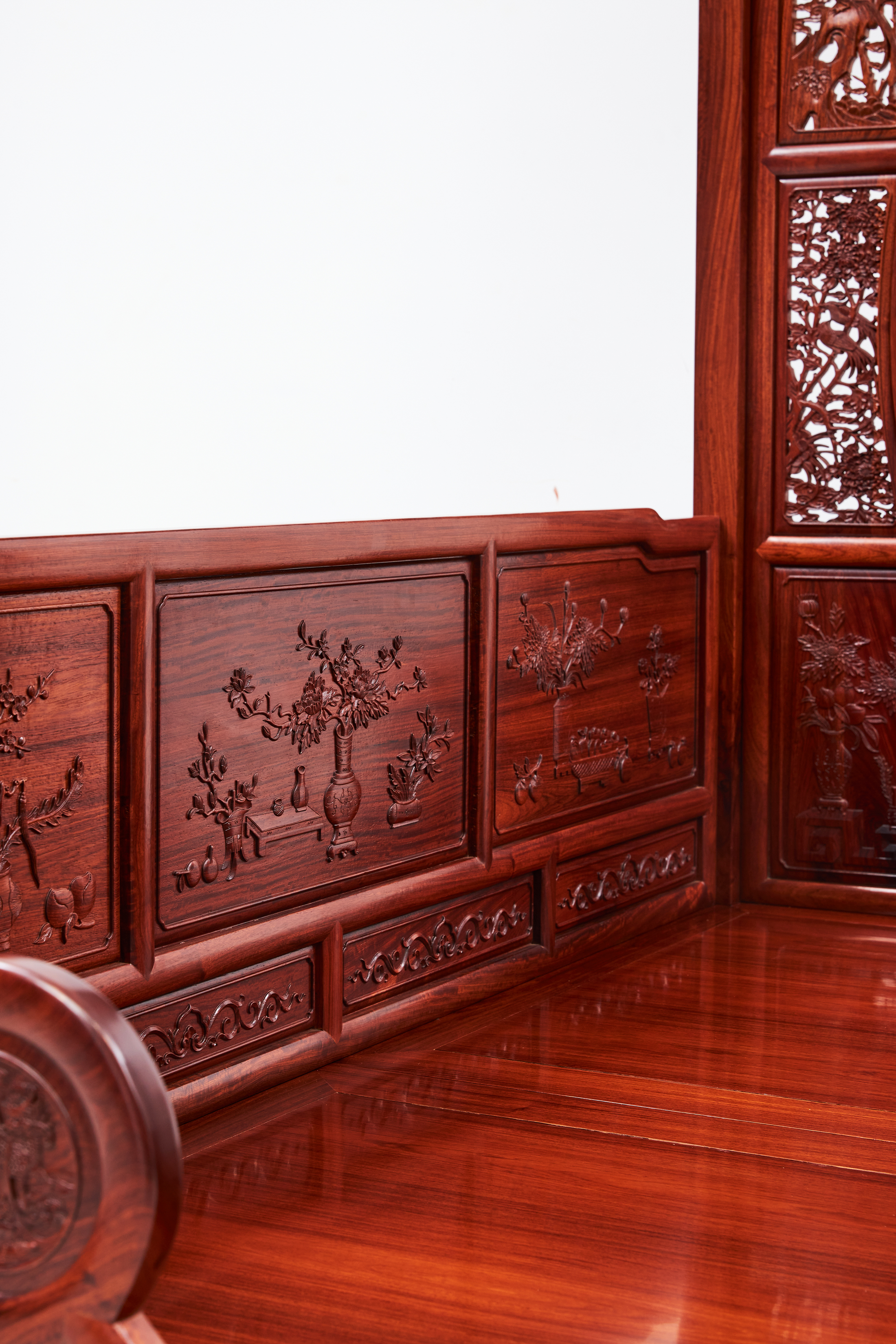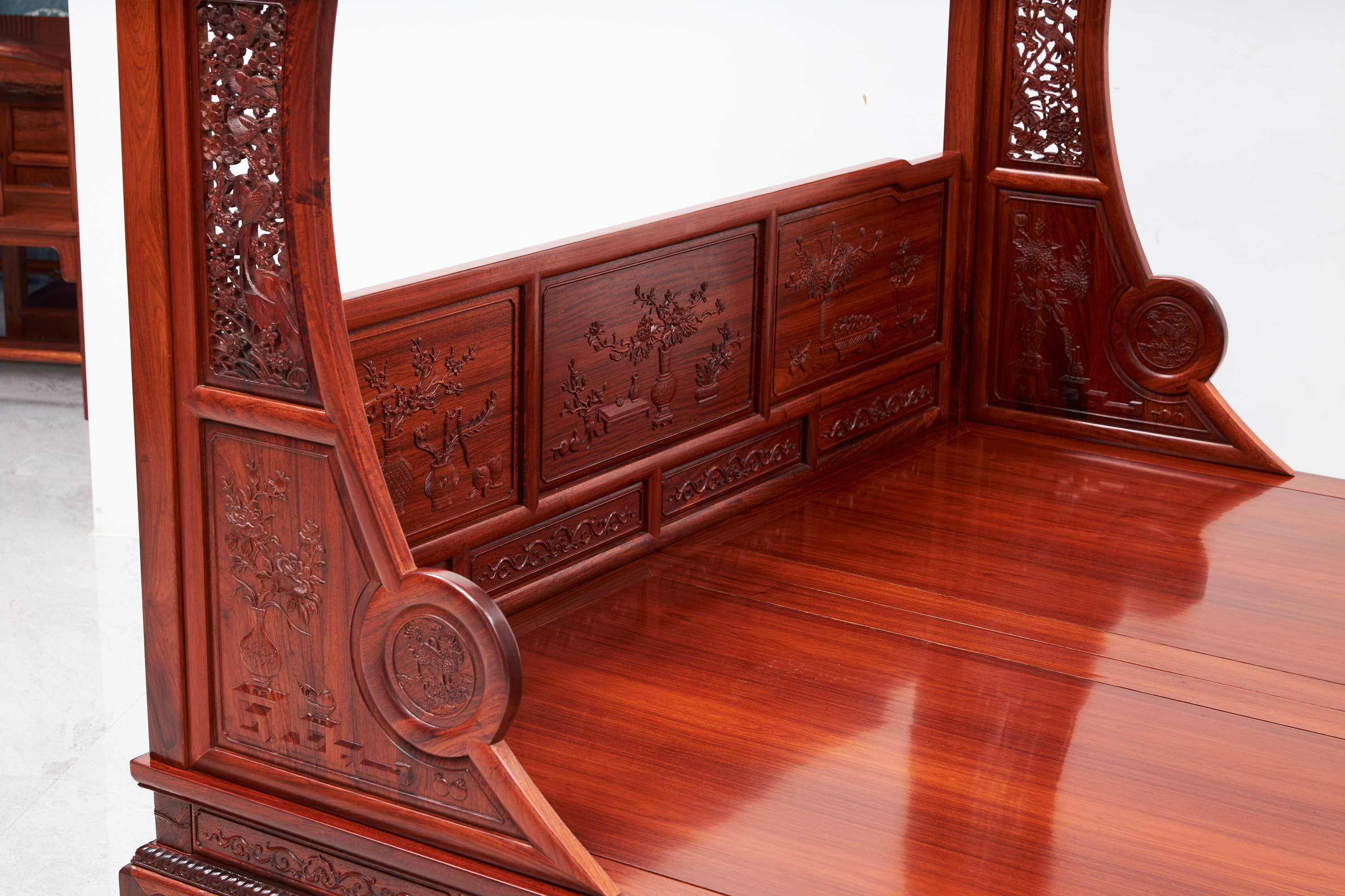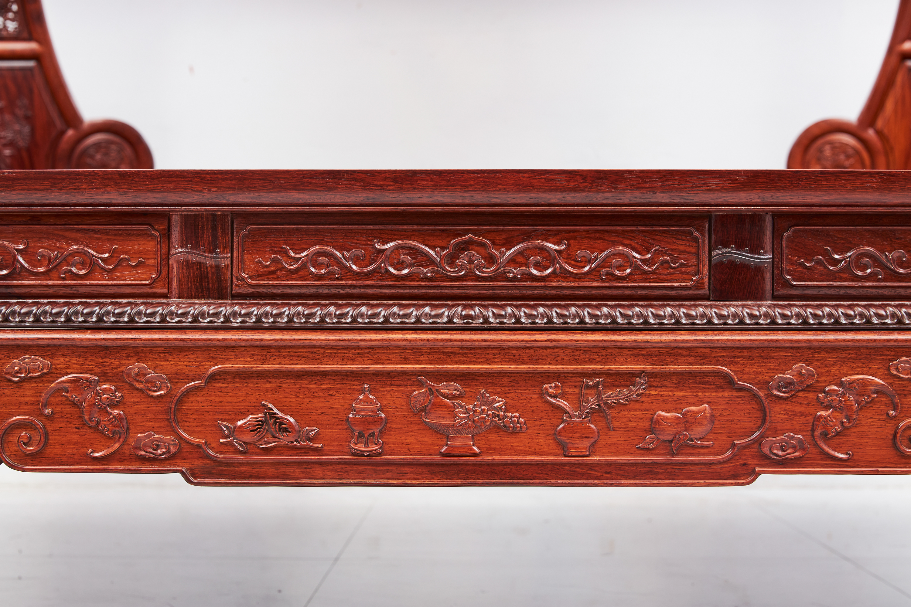 围栏用两根竖材分三截,围板双面浮雕有中国传统吉祥纹样“博古纹”,花卉、果品作为点缀。下截立柱错开装绦环板。