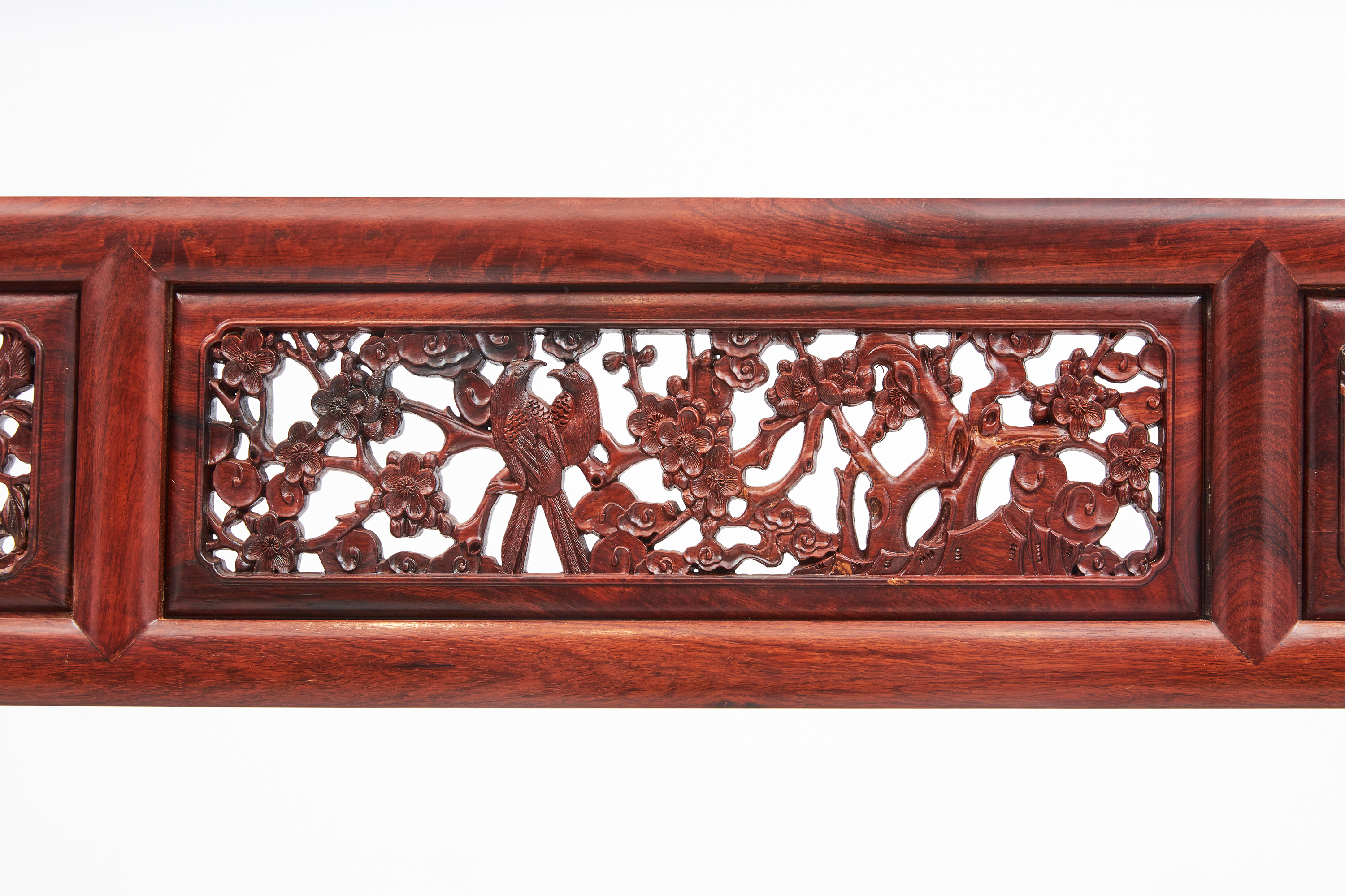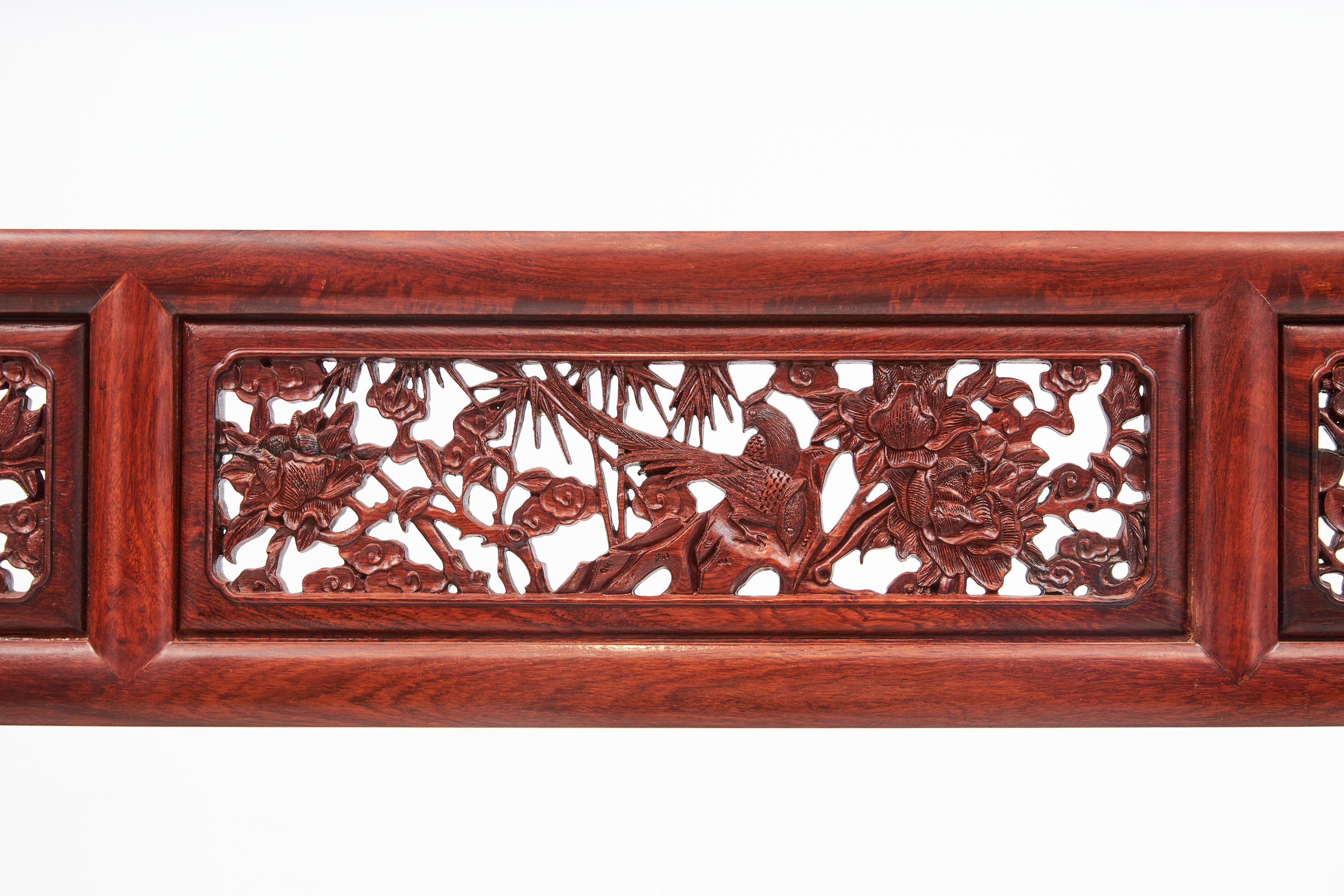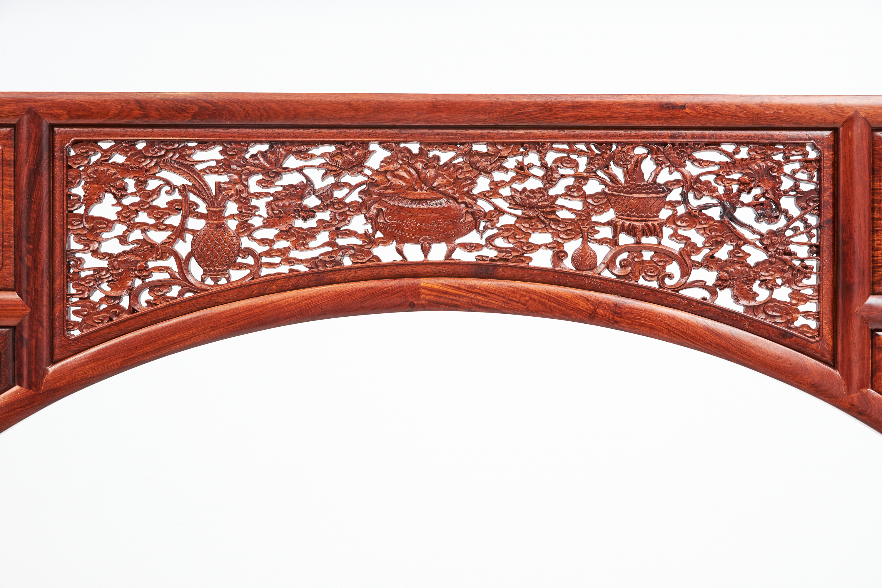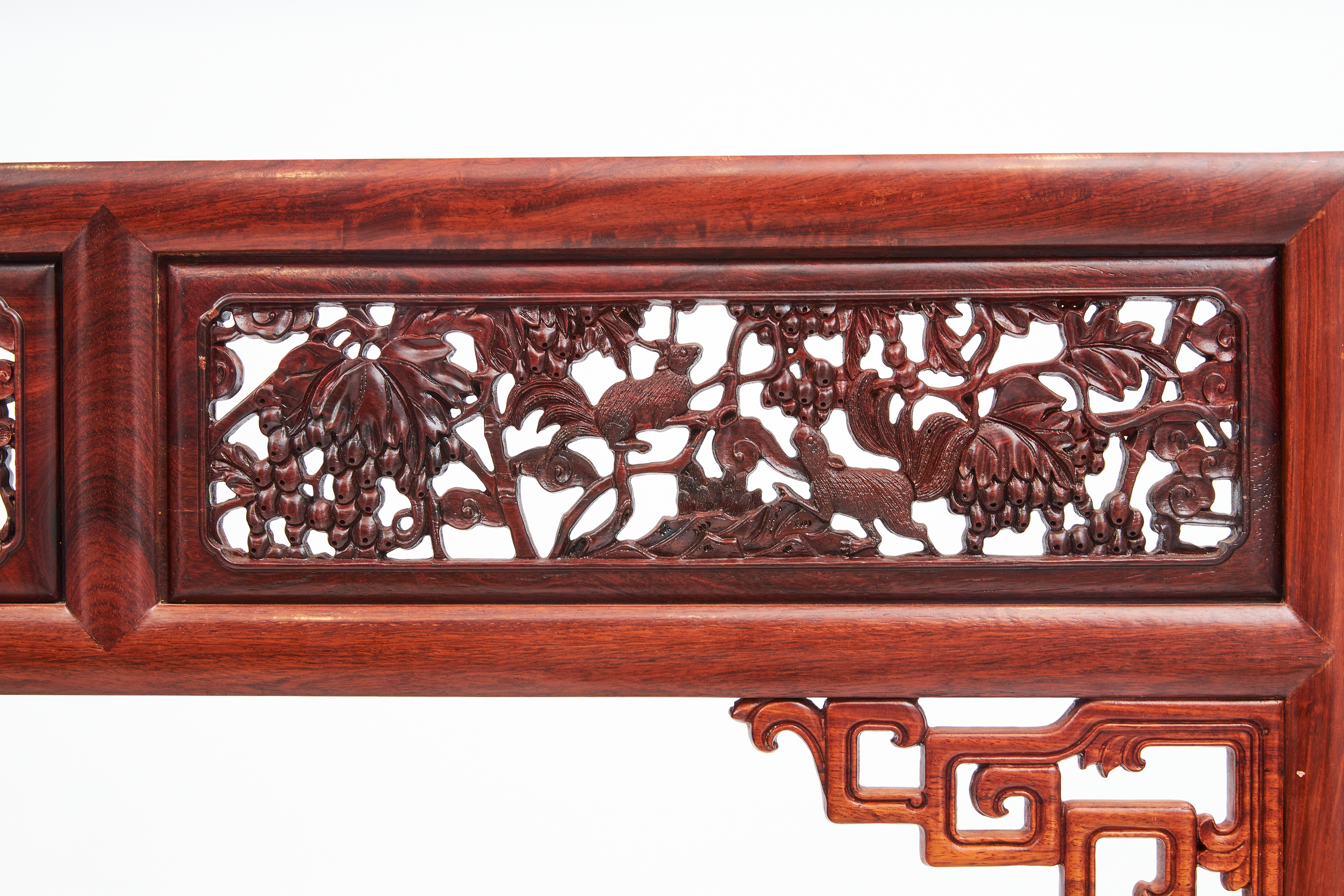 围栏用两根竖材分三截,围板双面浮雕有中国传统吉祥纹样“博古纹”,花卉、果品作为点缀。下截立柱错开装绦环板。