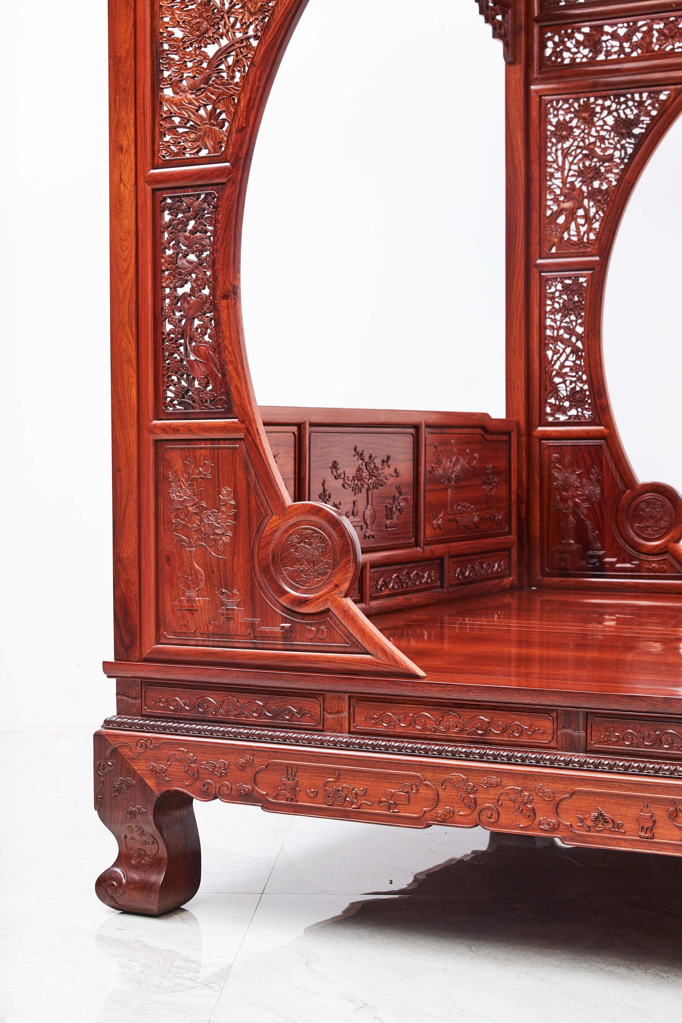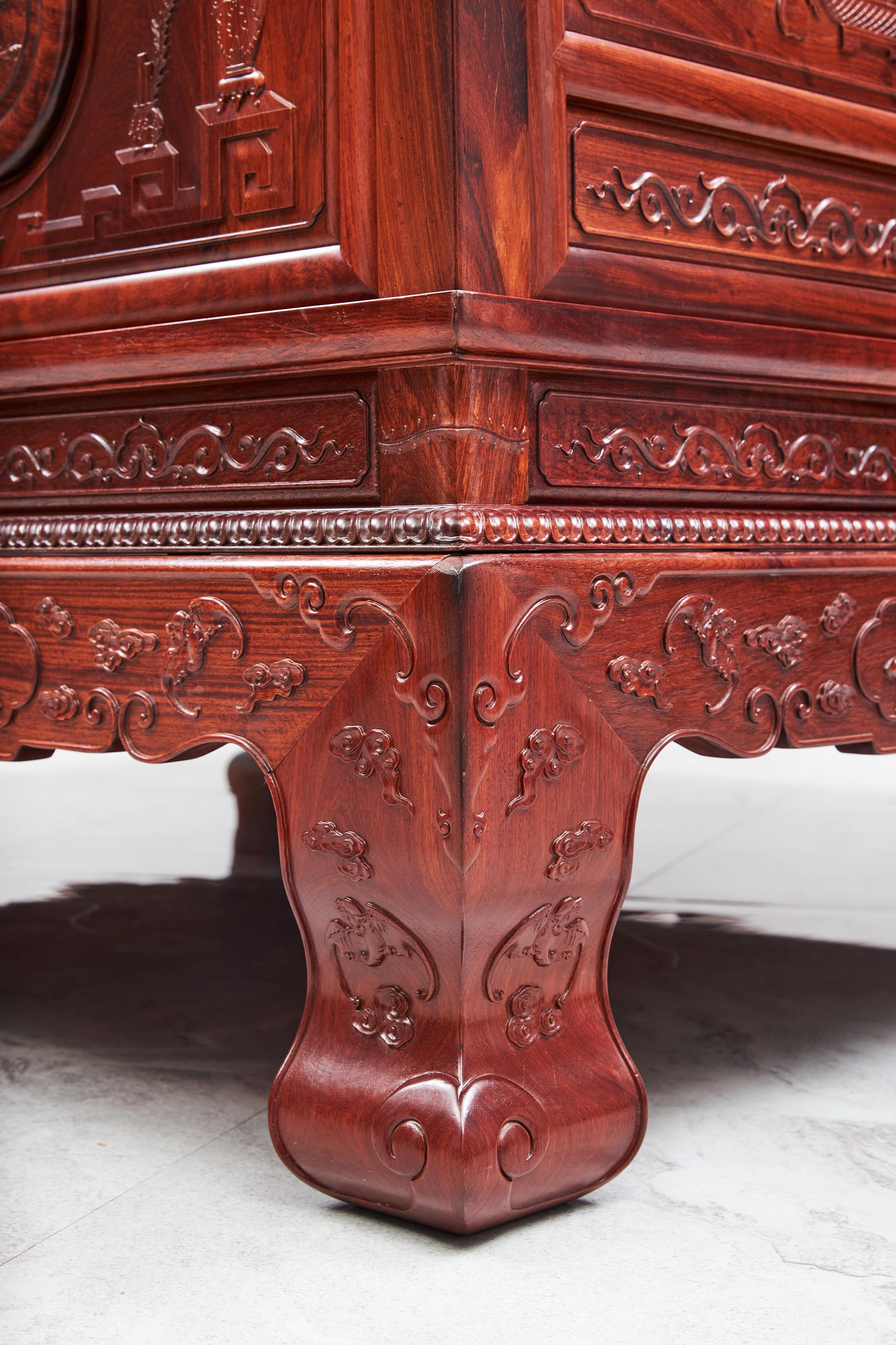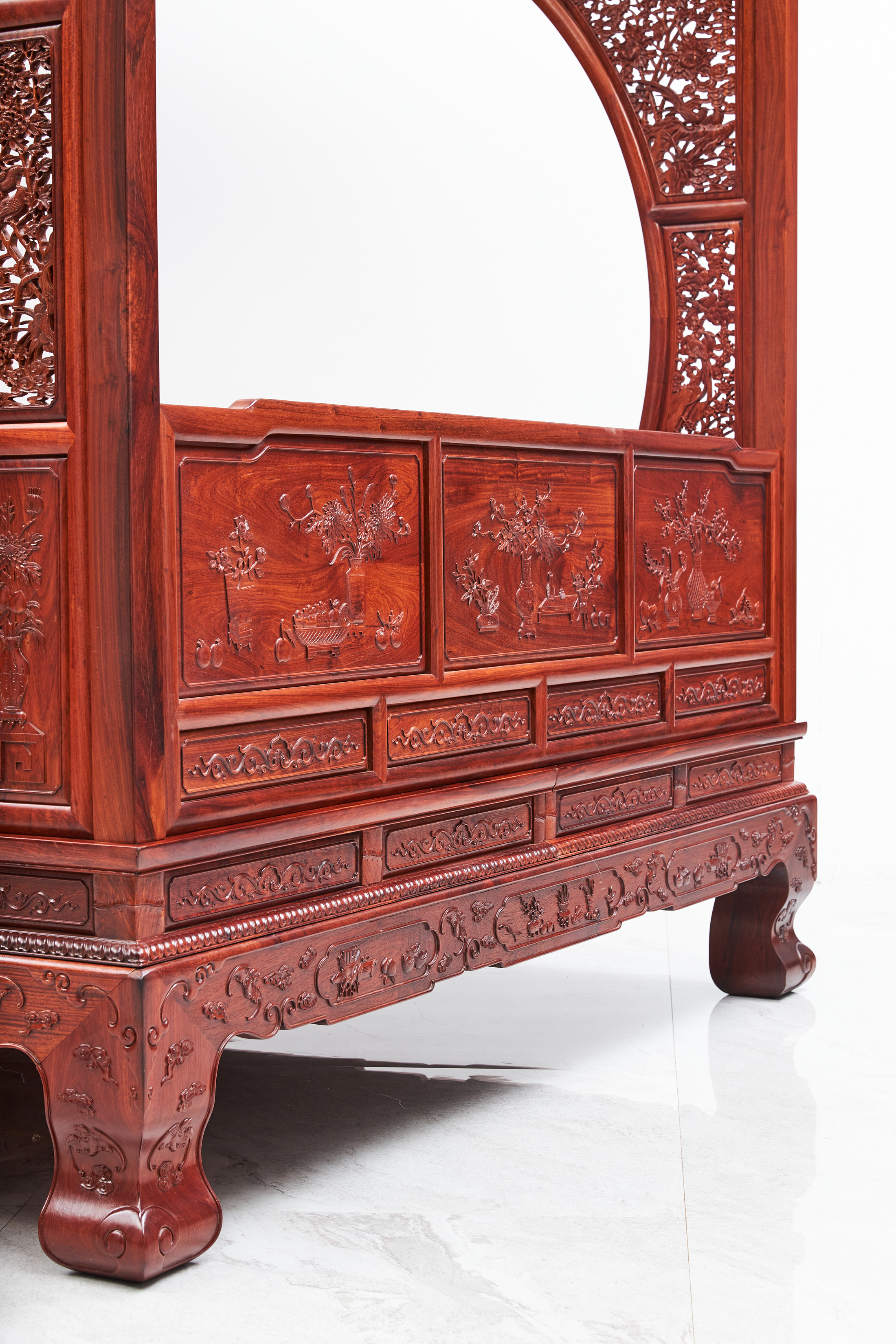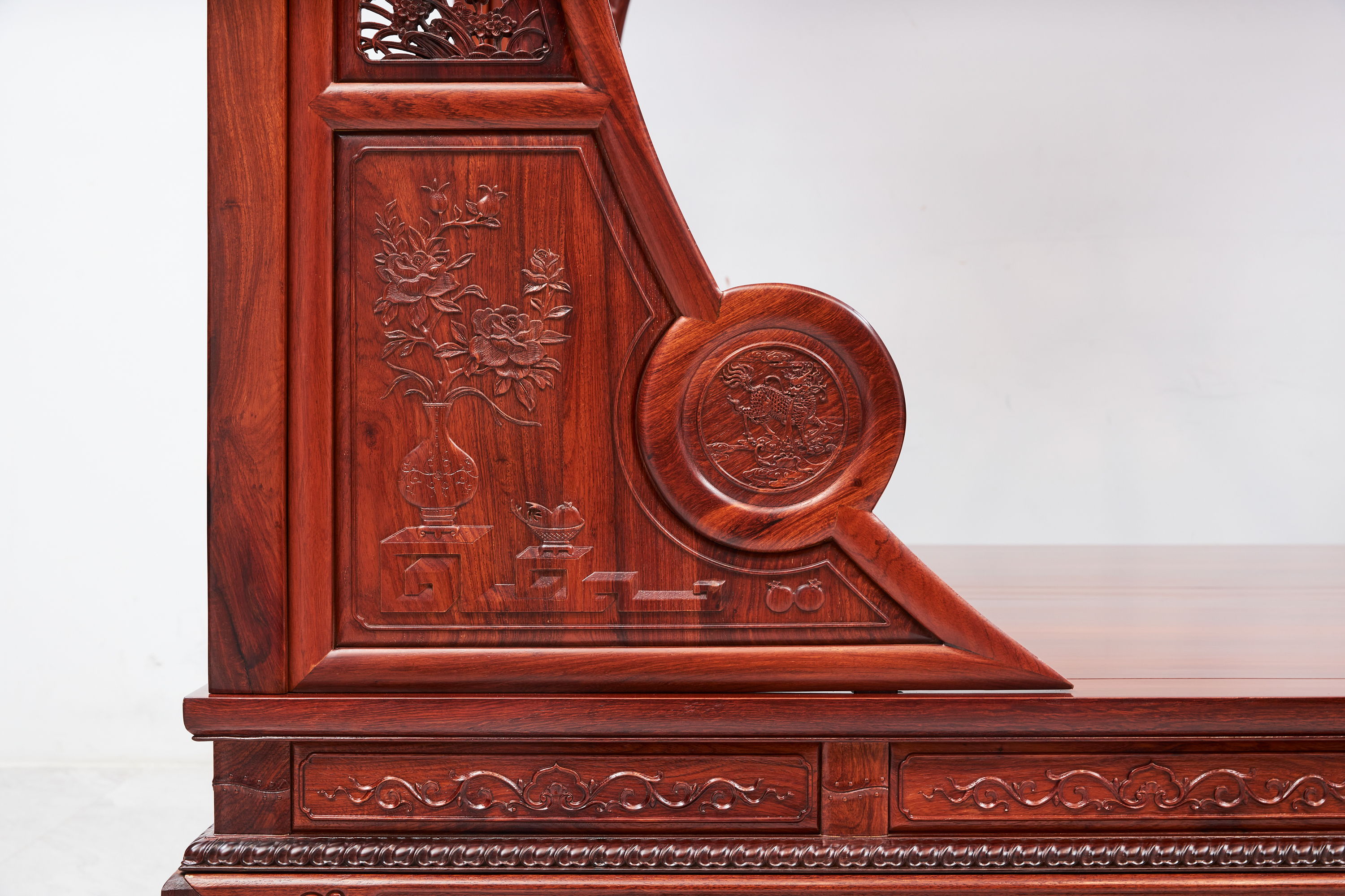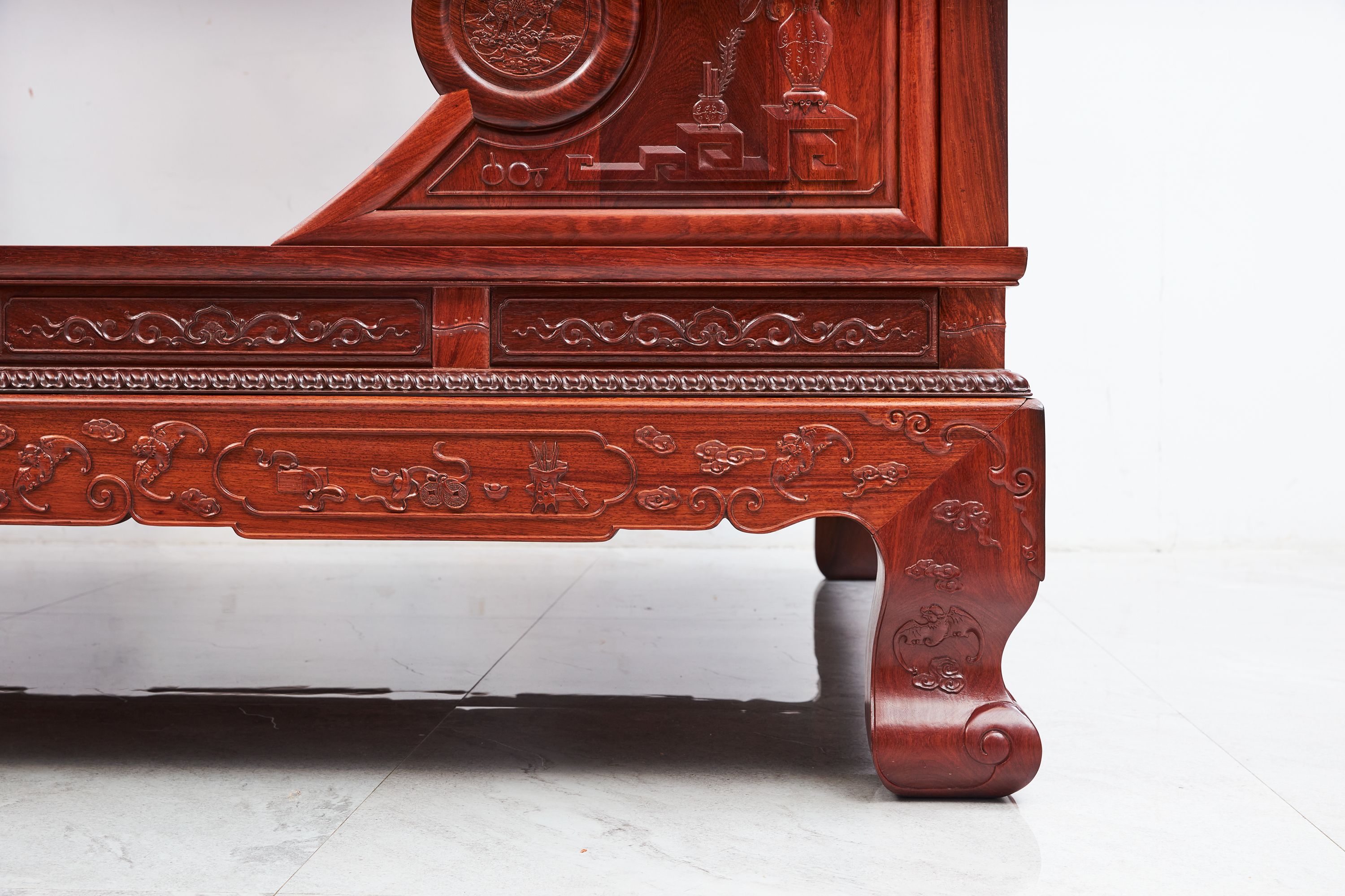 床身高束腰,束腰间立短柱,分段镶装绦环板。牙子雕缠枝花纹,豪华秾丽、富贵气派。虎腿饰瑞兽、祥云,十分厚重,又在内侧造出波折,冲淡过于雄厚的压迫感。