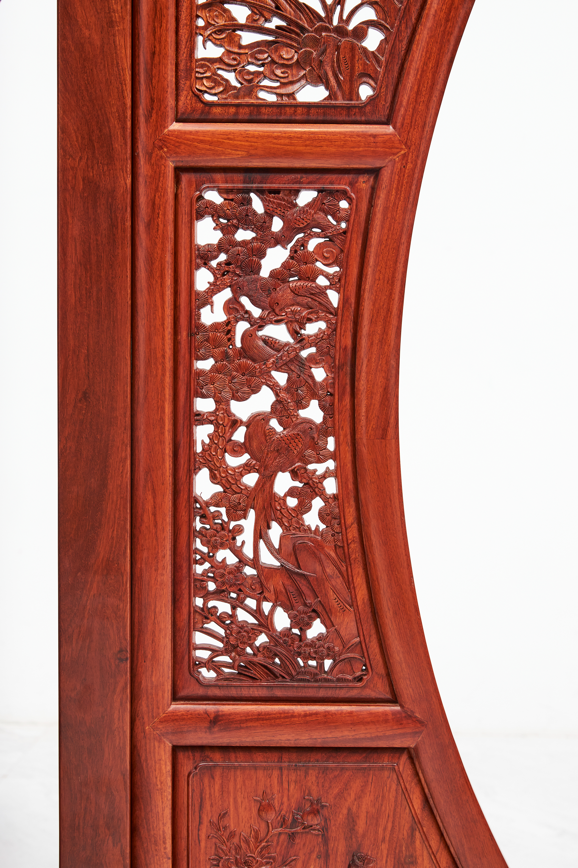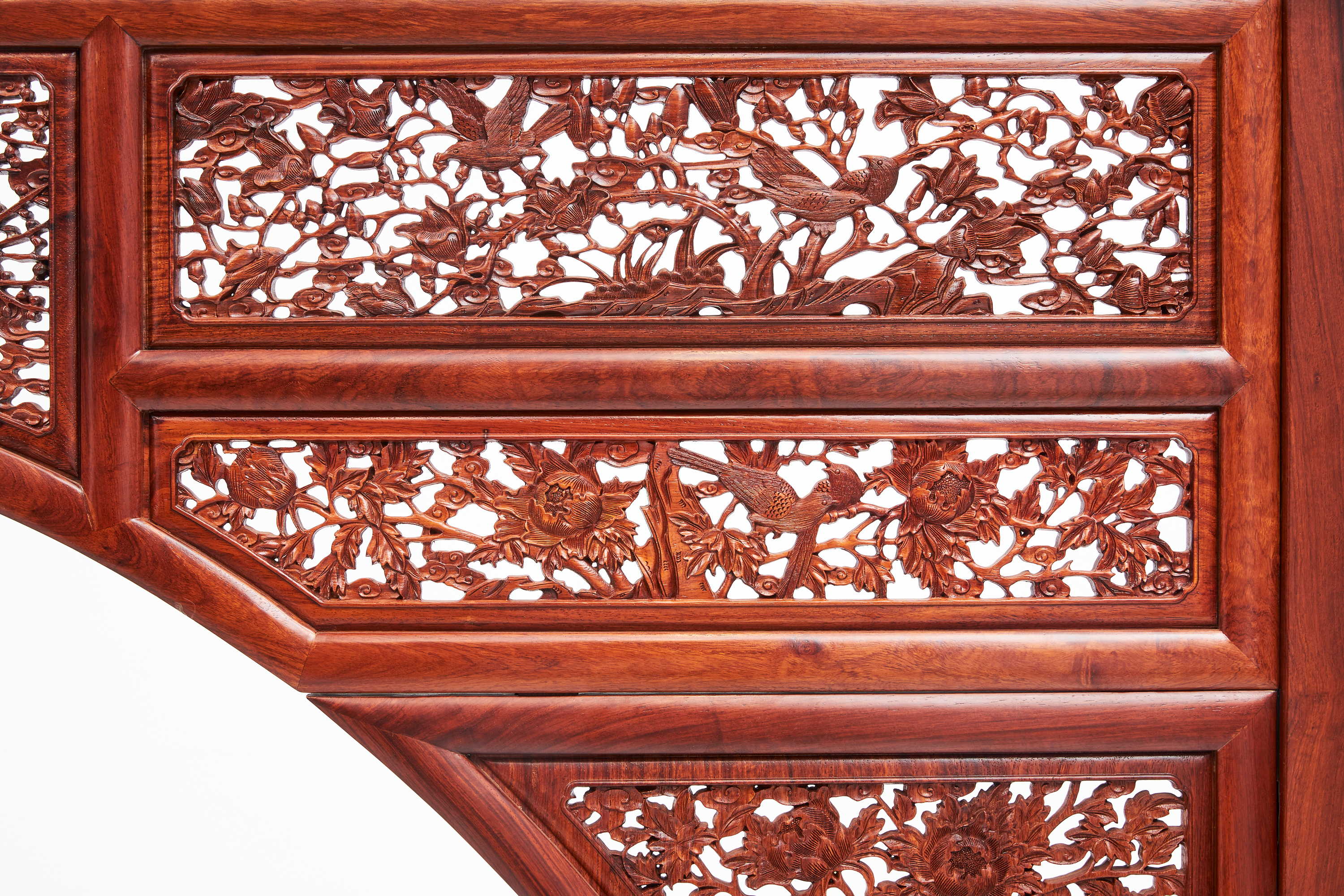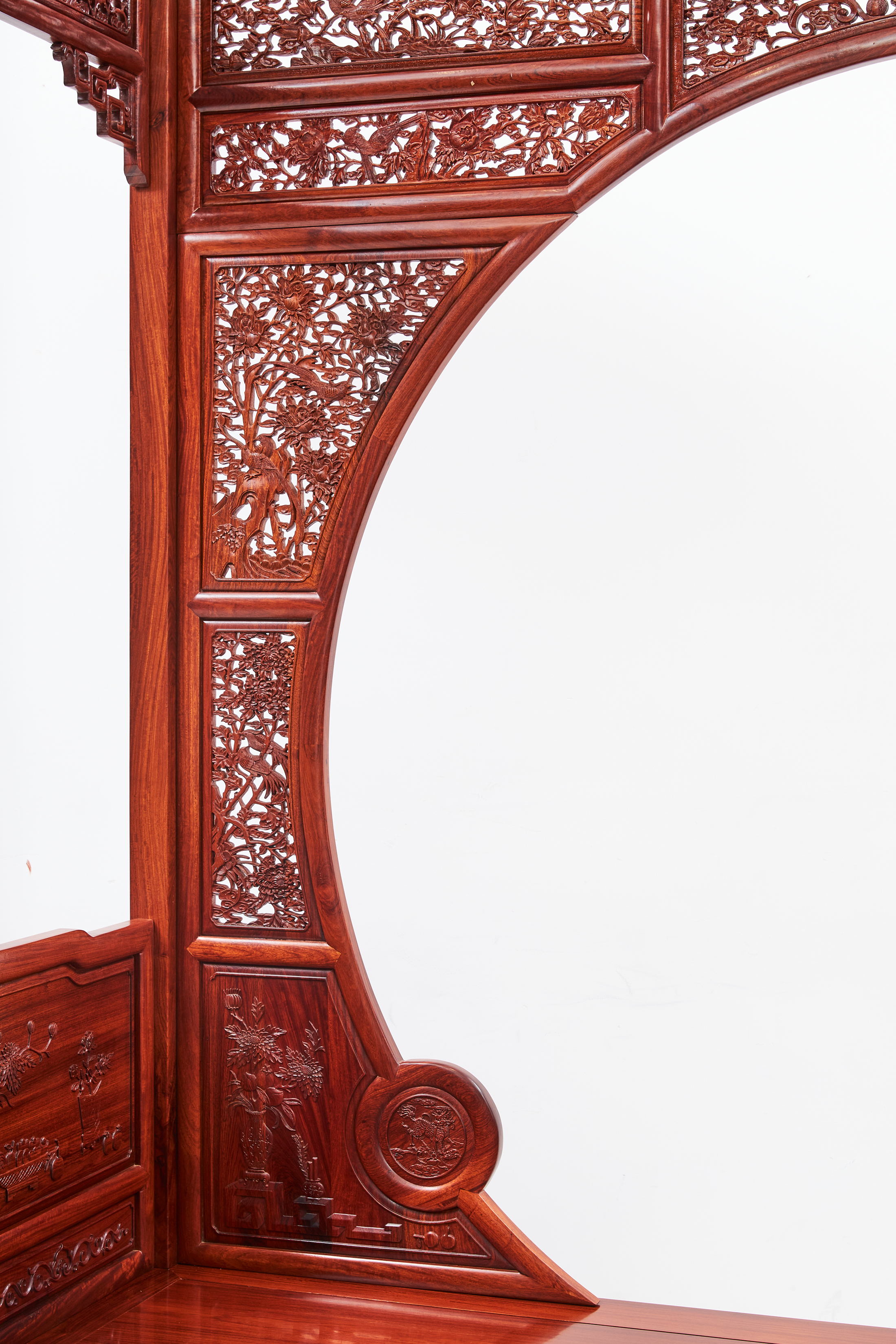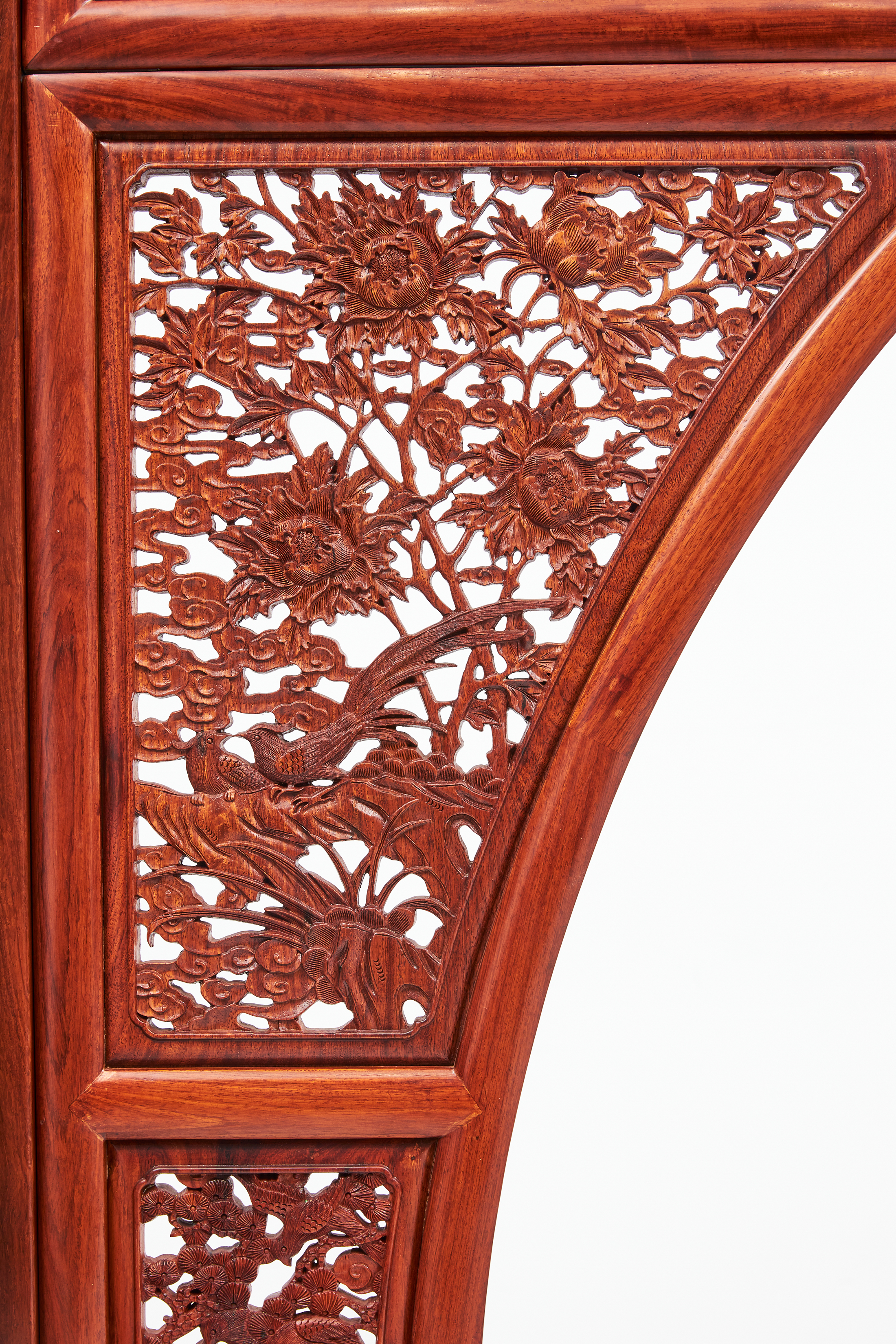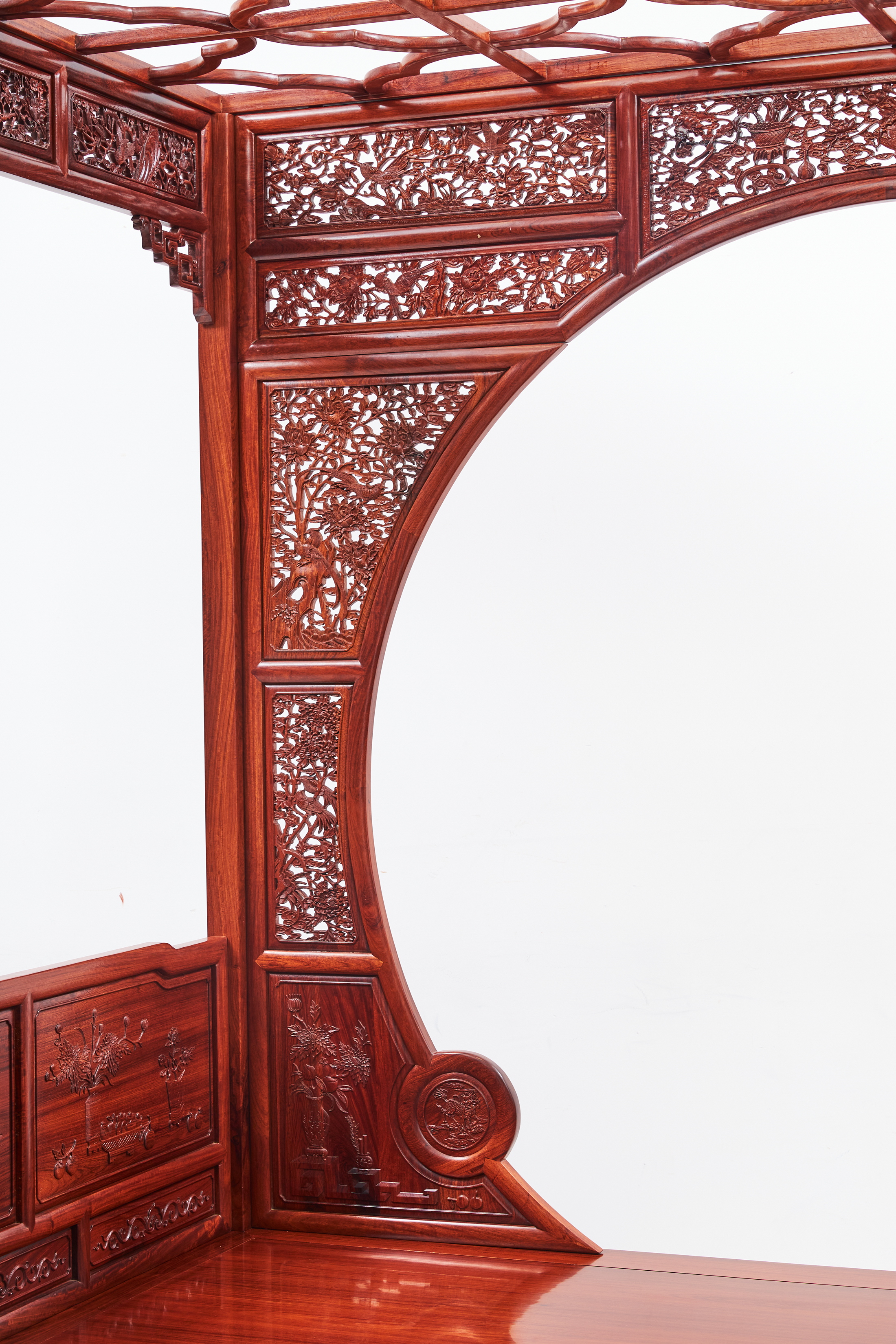 双面门罩用三扇拼成,上半为一扇,下半左右各一扇,连同围子、挂檐满雕见工,图案繁缛。