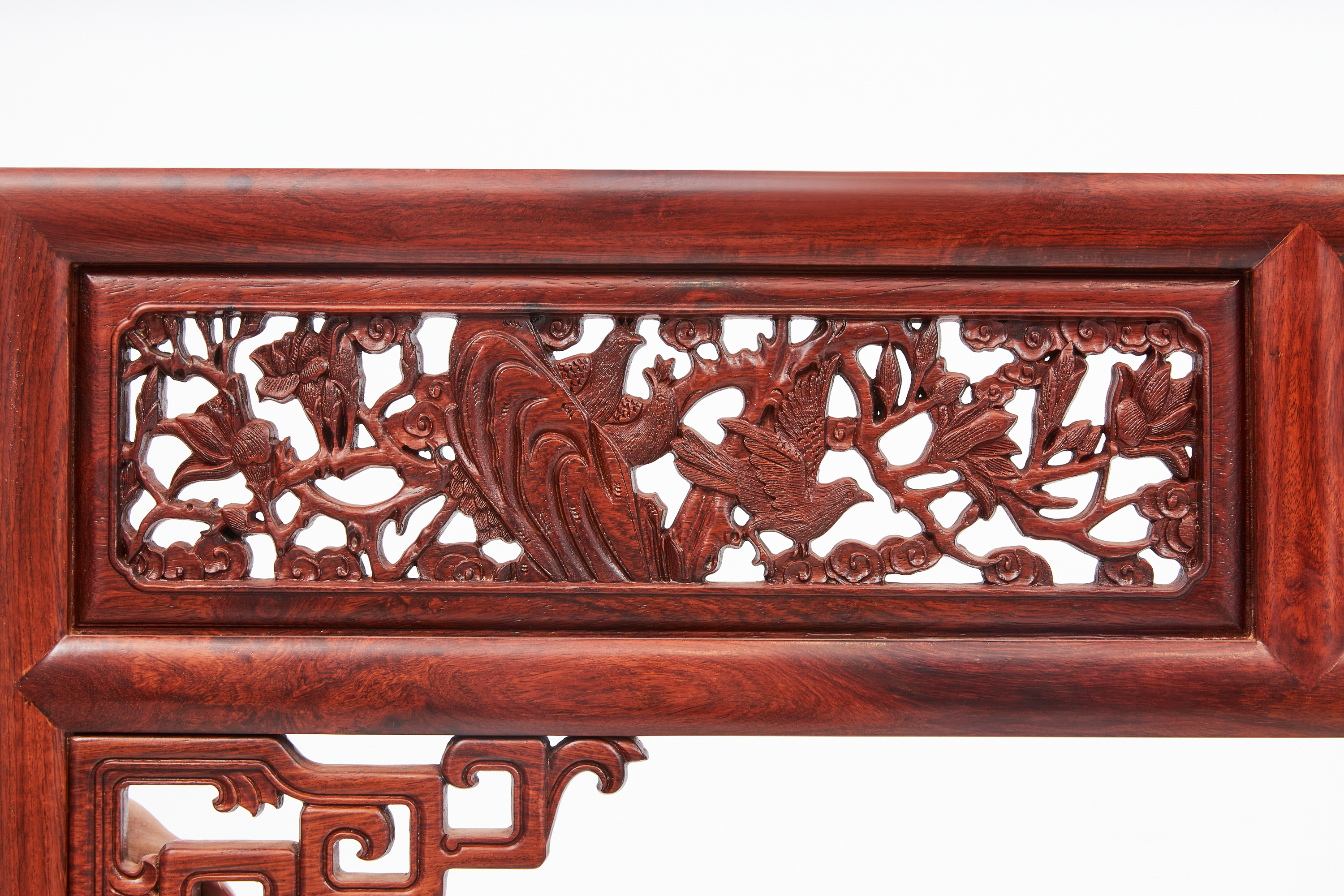 与床身下部浮雕、上部透雕呼应,形成下实上虚的有意识的变化。