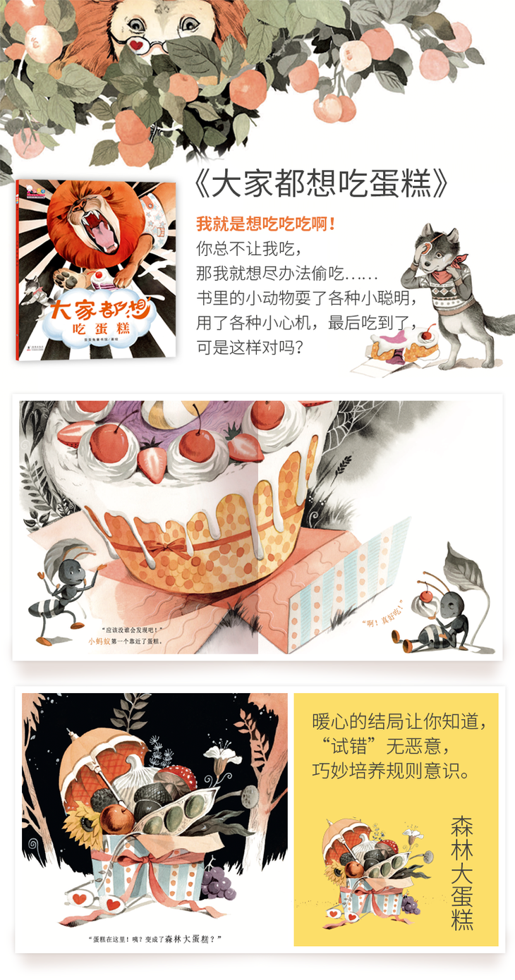 《吃蛋糕》是《大家都想》套装书系之一,本套书共4册,适合2-6岁孩子阅读。森林的草地上,一个不知被谁落下的蛋糕,吸引了很多的动物。小蚂蚁、蜘蛛、变色龙、小壁虎、穿山甲、狐狸、大灰狼等小动物一个接一个靠近蛋糕,利用自身的优势特点或是巧妙的诡计,成功尝到蛋糕的甜美。大动物们更是凭着身强体壮,毫不客气地赶走比自己弱小的动物,想要独自霸占蛋糕:狮子赶走了大灰狼,犀牛赶走了狮子,大象赶走了犀牛。然而等大象转过身,却发现蛋糕不见了。大象已经是陆地上*庞大、*有力量的动物,谁还能从他的鼻子底下抢走蛋糕呢?