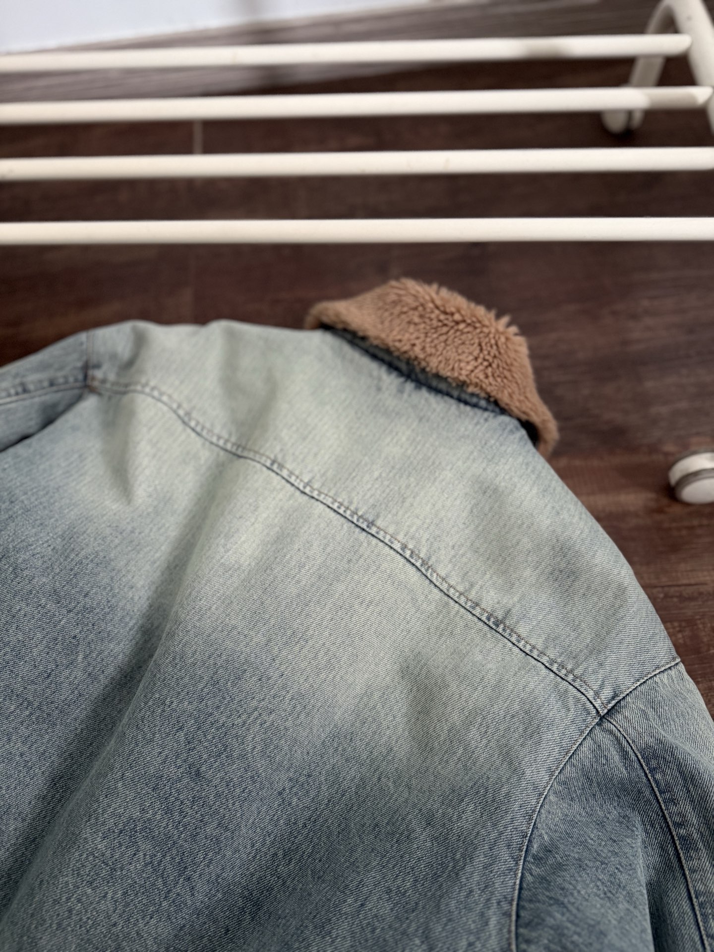 采用羊毛水洗面料打造牛仔外套版型,兼具质感与