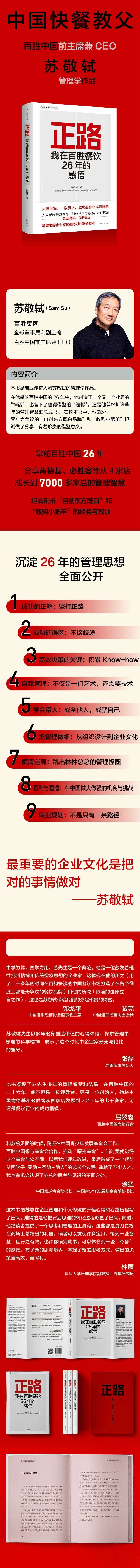 在他掌舵百胜中国的 26 年中,他和团队见证了改革开放带来的巨大机遇,享受了与时俱进的种种红利,但同时也经历了跨国企业都会面临的各种挑战和重重危机的考验。他创造了一个又一个业界的“神话”,也留下了值得借鉴的“遗憾”。这是他首次将这些年的管理智慧汇总成书。 在这本书中,他就外界广为争议的“自创东方既白品牌”和“收购小肥羊”坦诚做了分享,有着珍贵的借鉴意义。
