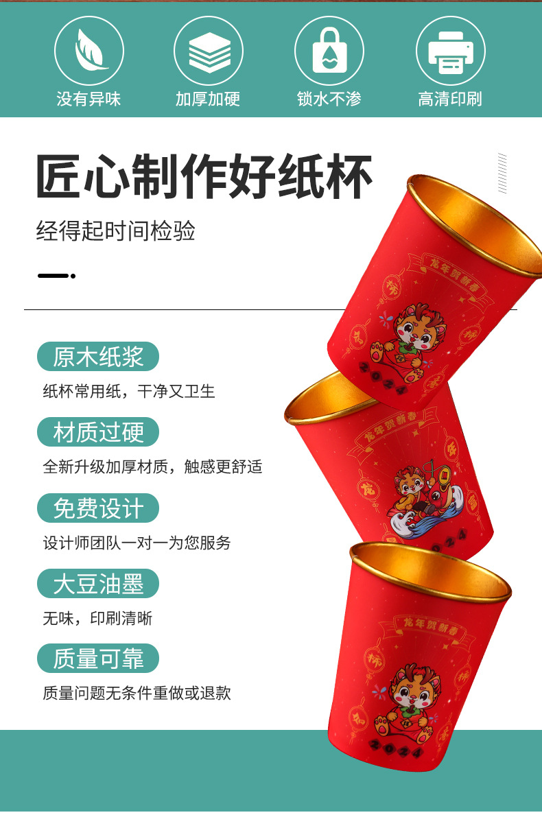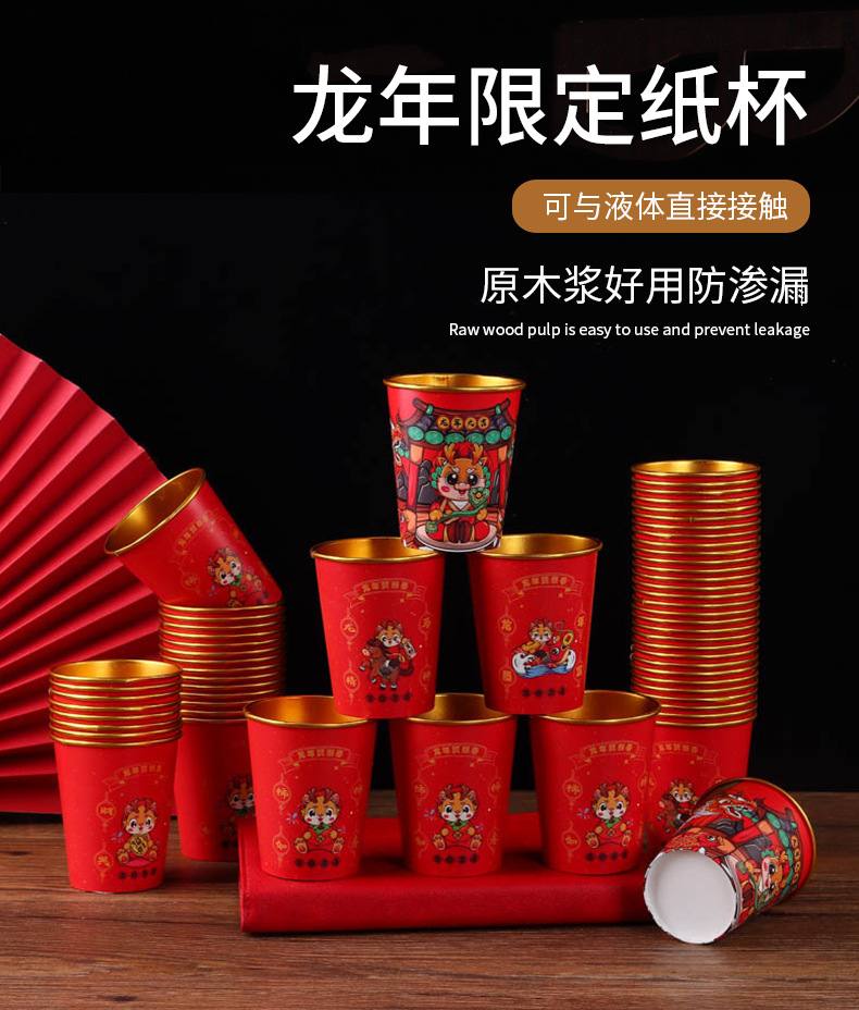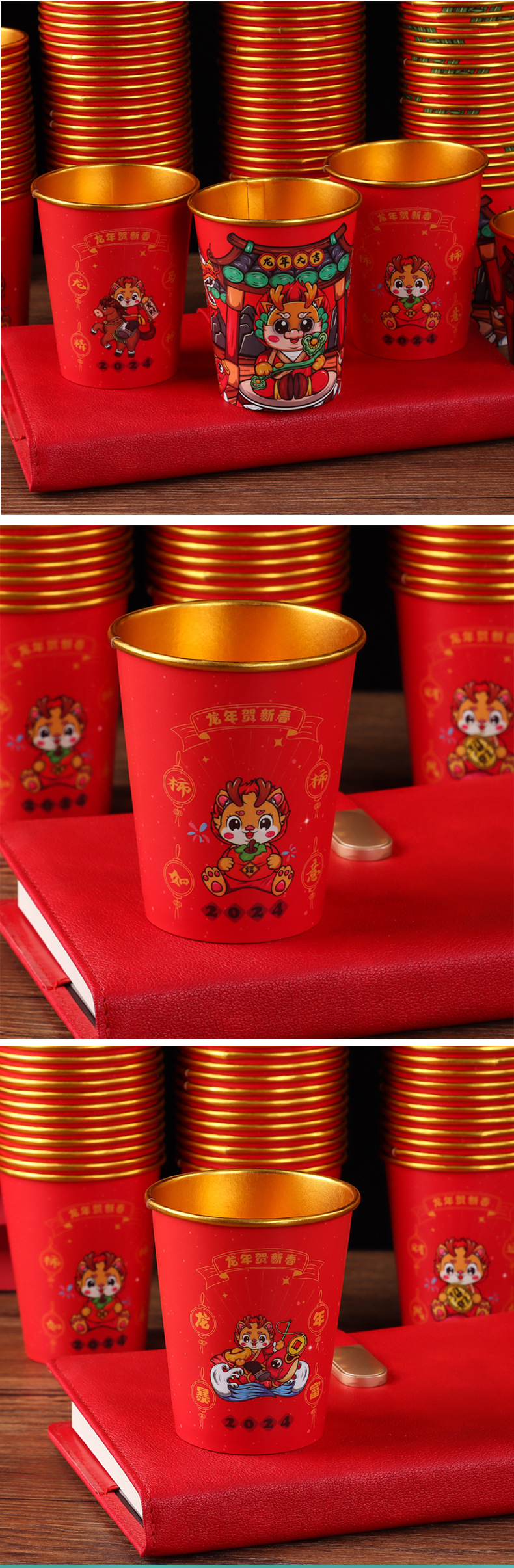 2024龙年新春一次性纸杯批发加厚纸杯家用结婚新年用品纸杯子茶杯
