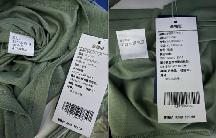 面料:55.5%聚酯纤维 40.9%棉 3.6%桑蚕丝