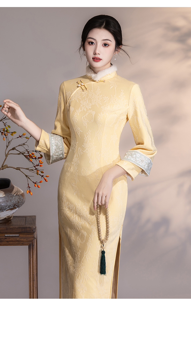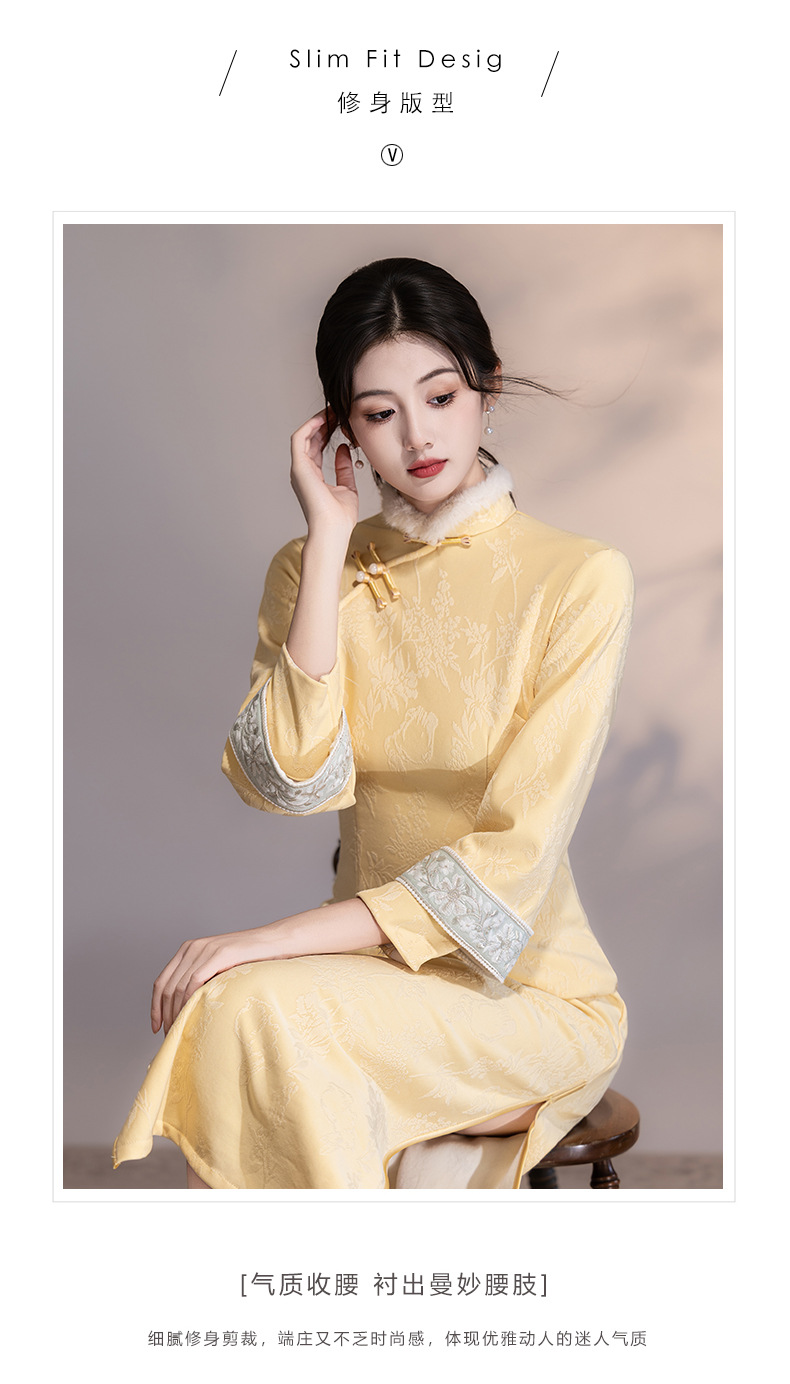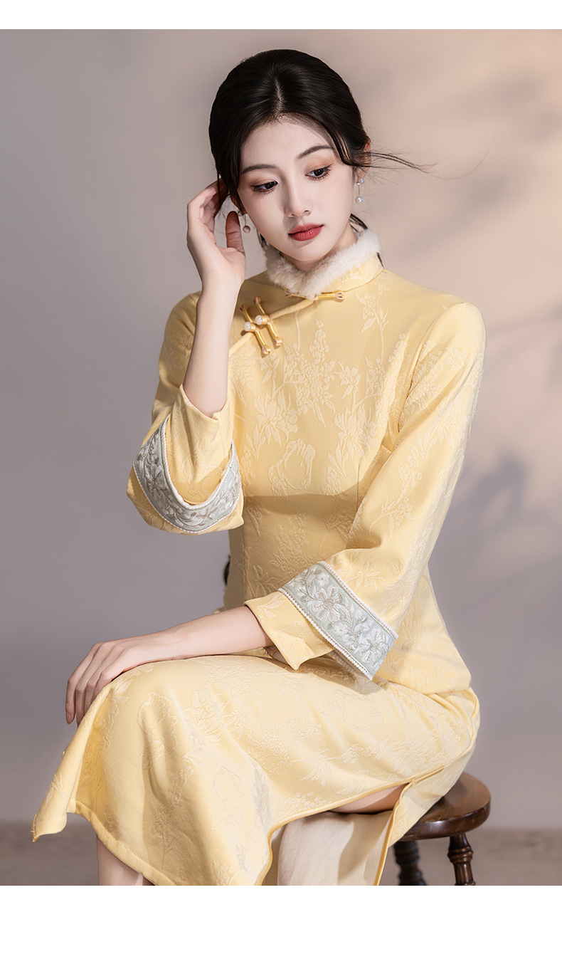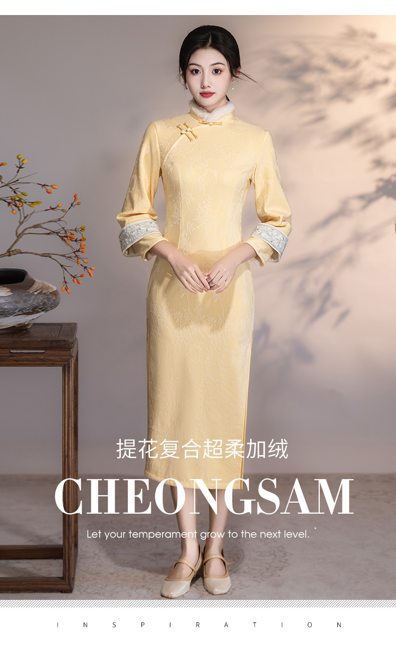 LSB 4158黄色旗袍长袖加绒国风新中式连衣裙