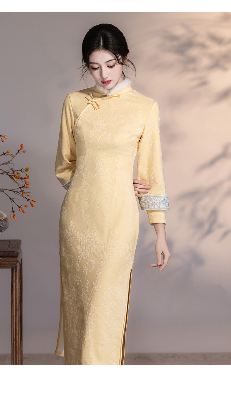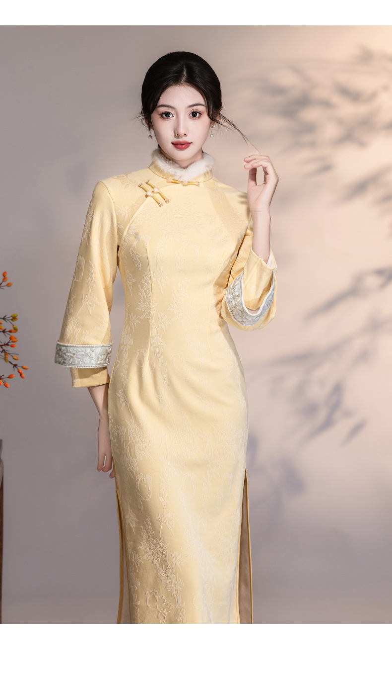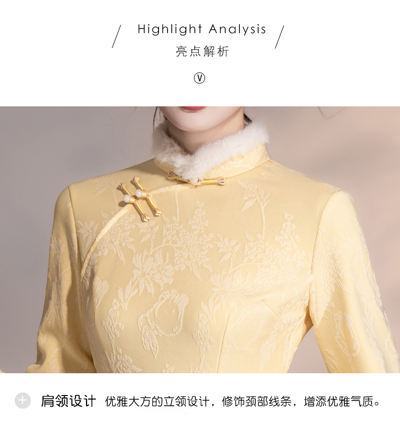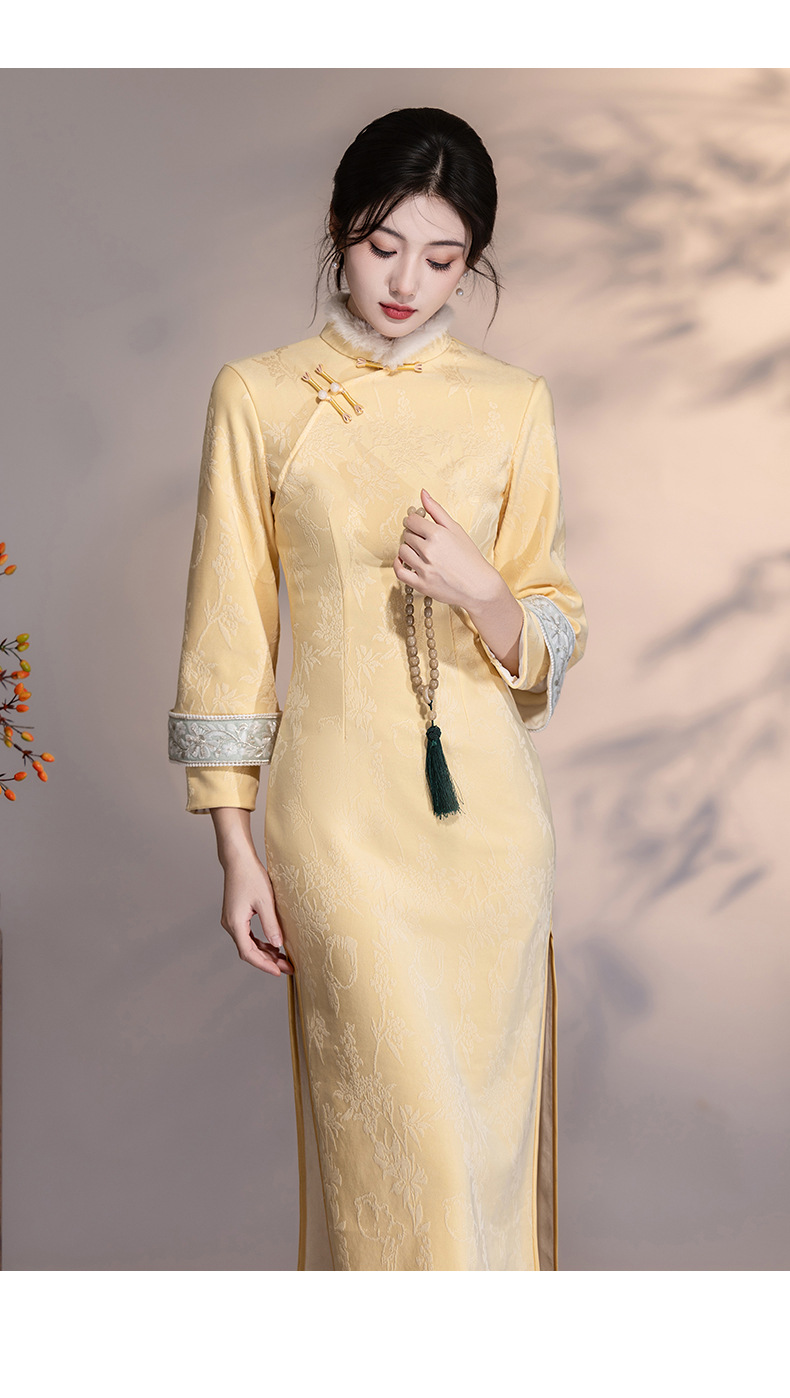LSB 4158黄色旗袍长袖加绒国风新中式连衣裙