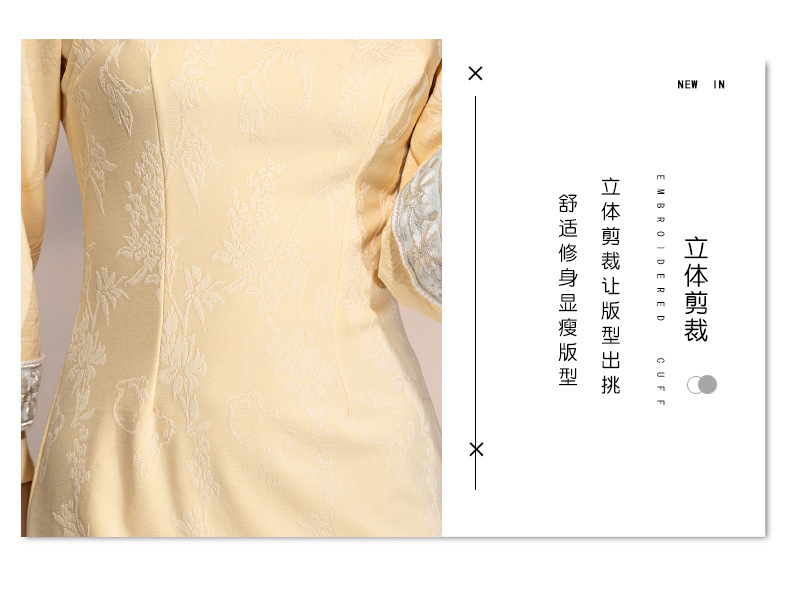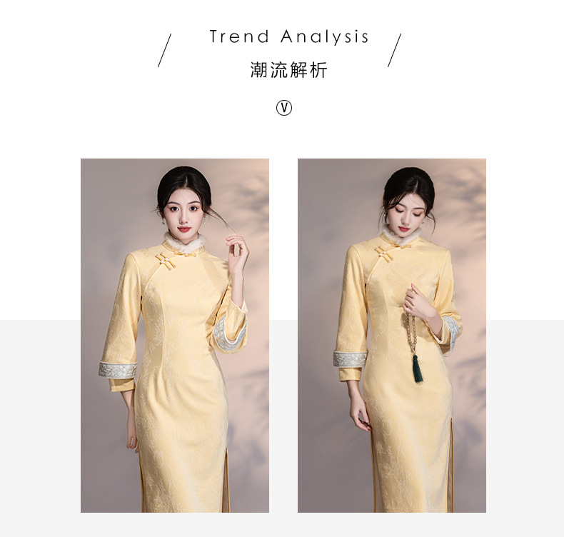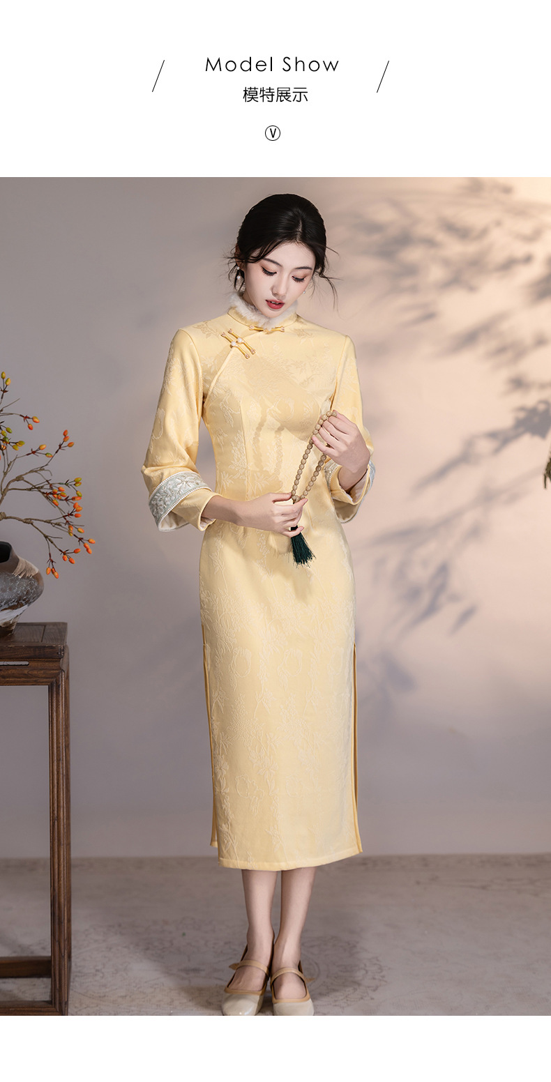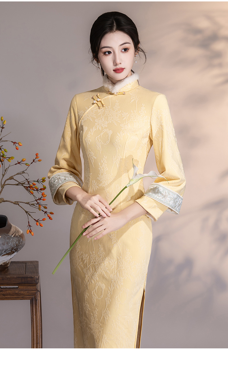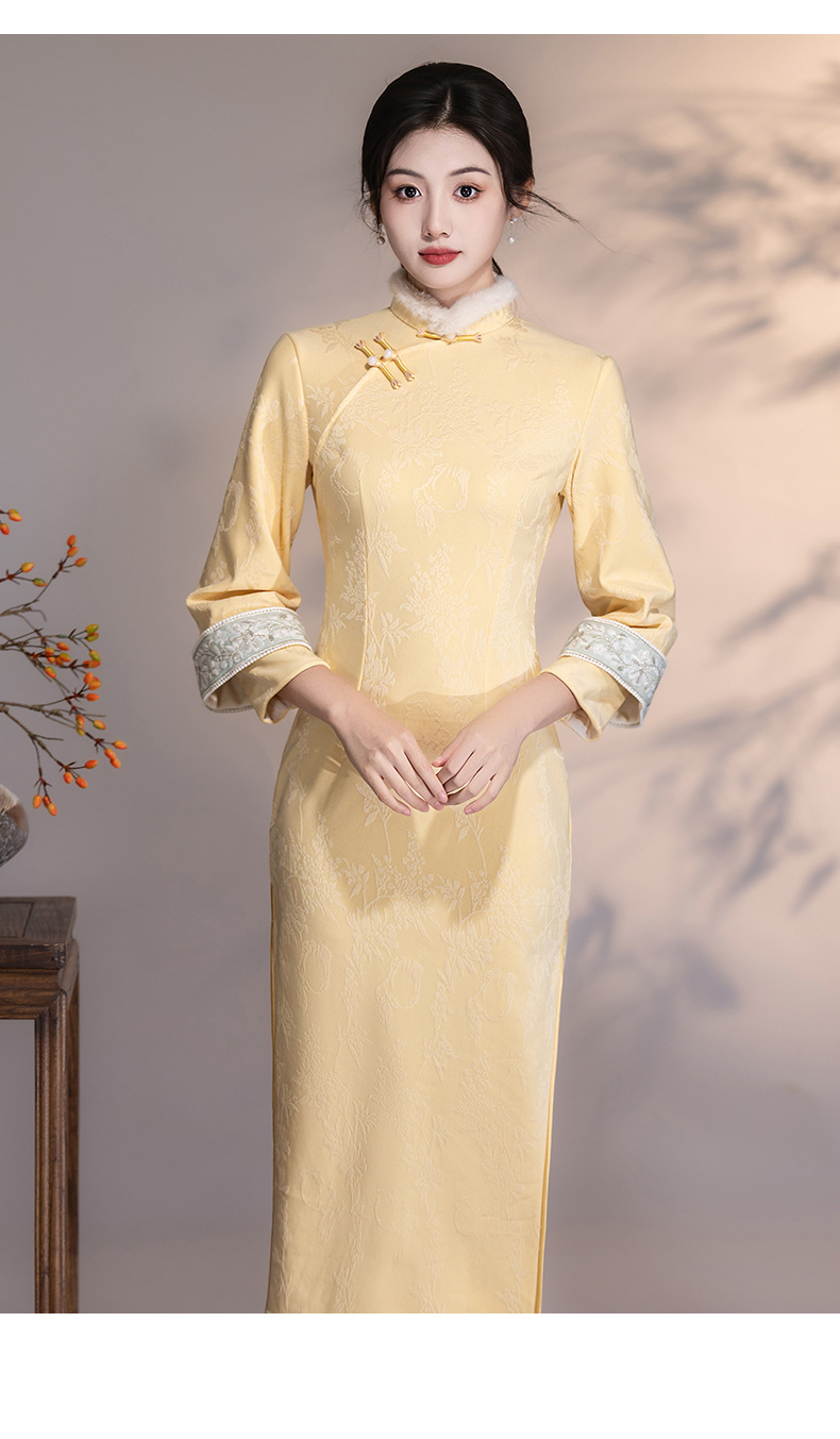 LSB 4158黄色旗袍长袖加绒国风新中式连衣裙