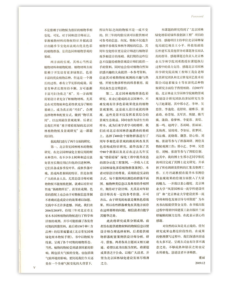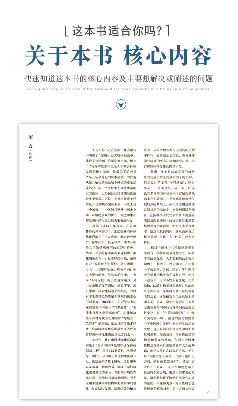 植物是园林绿地景观中具有生命活力的构成要素,植物物候的变化与植被景观动态紧密相关;要设计出具有季相律动的植物景观,要对植物的生态习性、观赏特性及内在生长发育节律——物候有充分的了解。本册即以图文并茂的形式对100余种“增彩延绿”新优木本材料的物候特征、景观特性及适用生境等做详细介绍;以期从植物材料的角度为植物景观规划设计的从业人员及相关兴趣爱好者提供借鉴与参考,并借此将植物物候引入公众视野,启迪其对物候观测的兴趣与热情,开展植物科普,惠及社会民众。