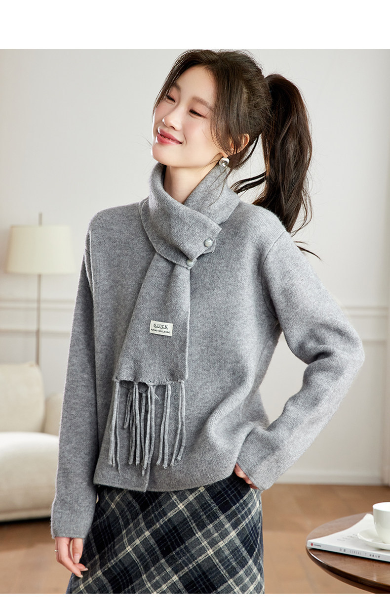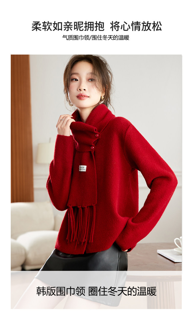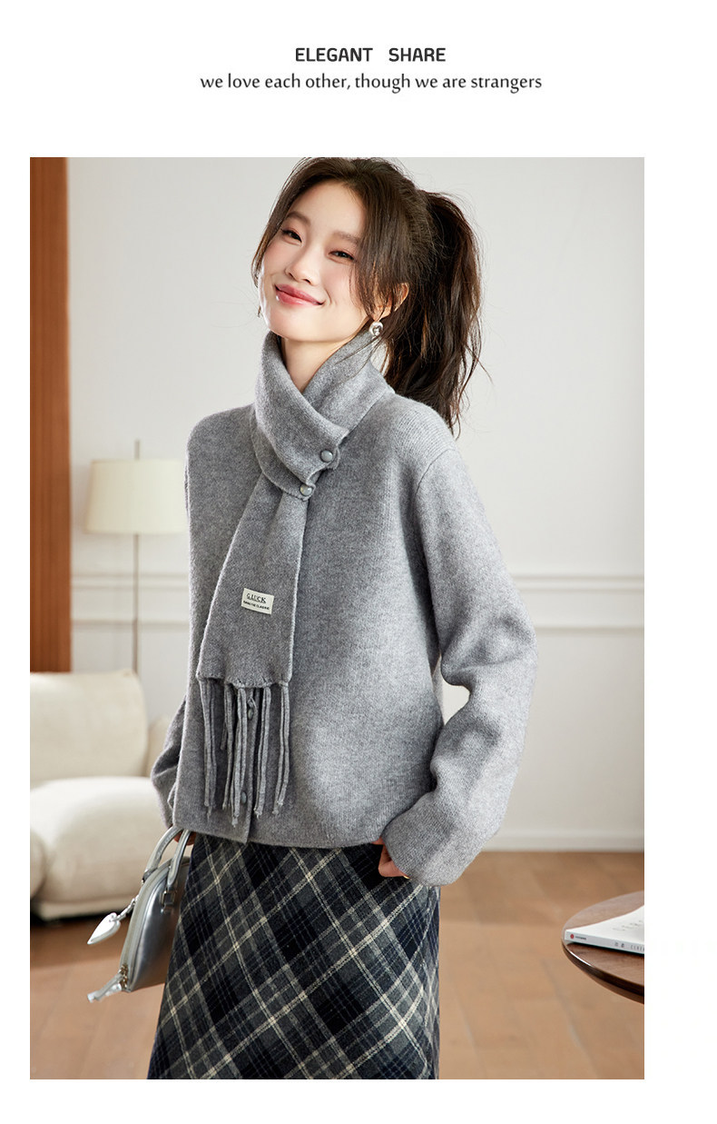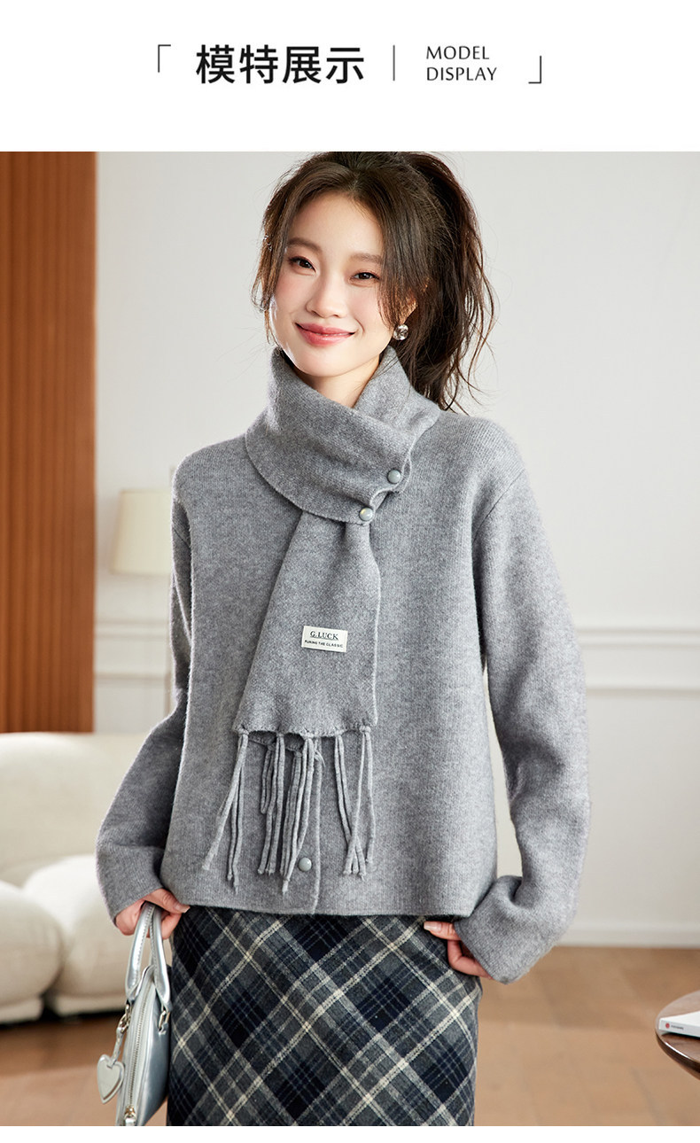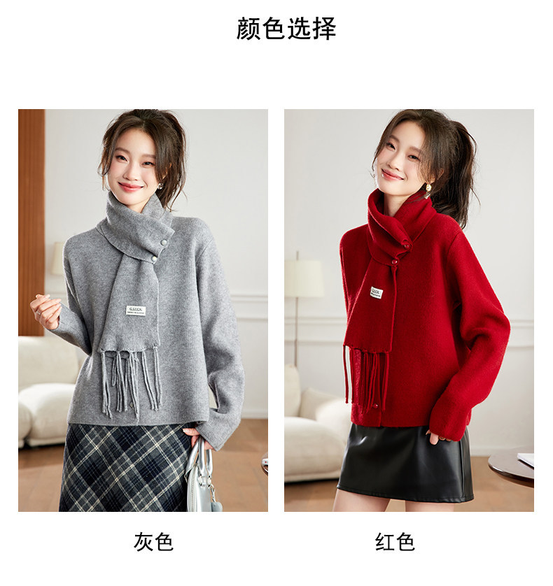 CC 2237韩系圆领毛衣外套流苏围巾宽松针织开衫