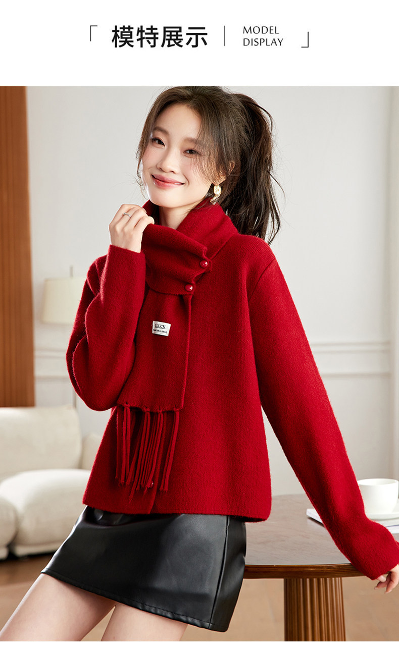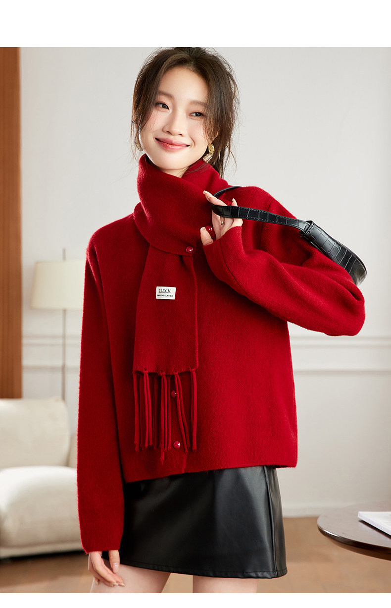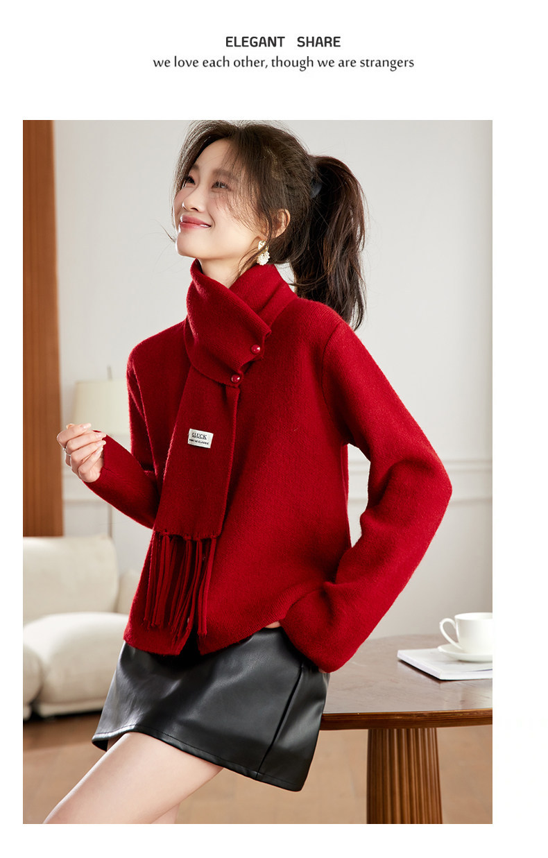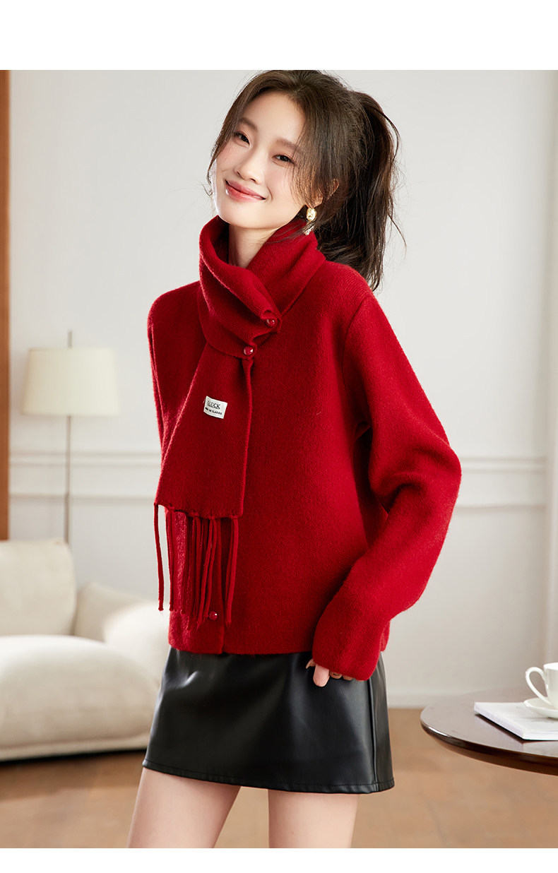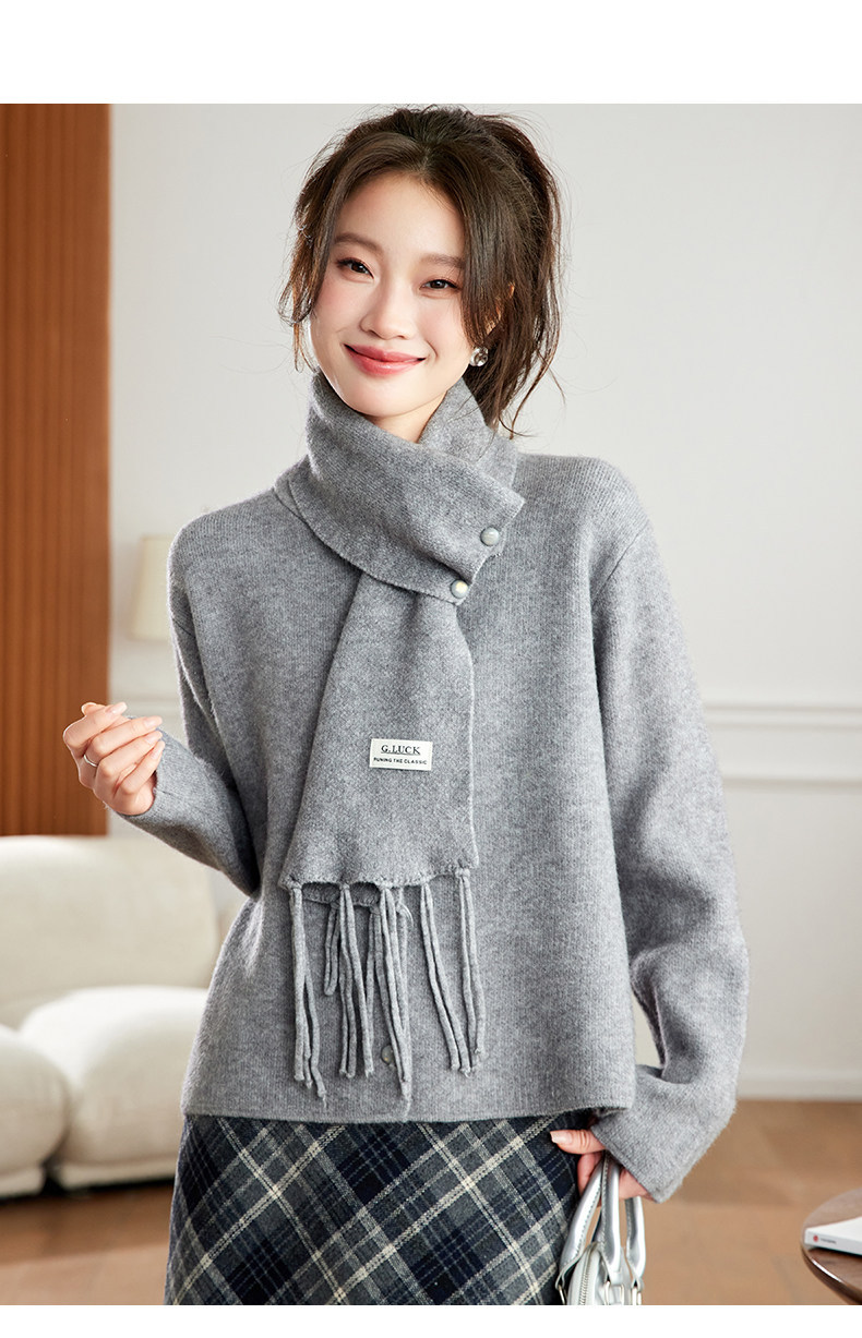 CC 2237韩系圆领毛衣外套流苏围巾宽松针织开衫