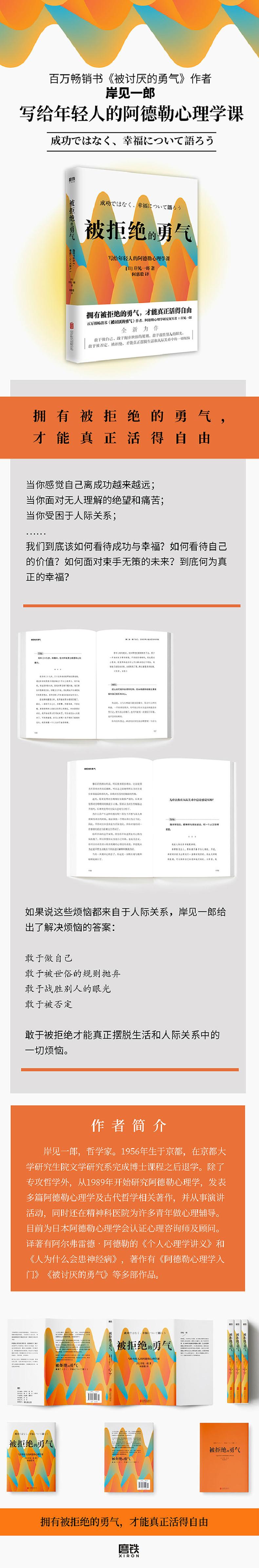 人之所以痛苦,是因为“不敢”幸福。幸福意味着要拒绝他人的期待,肯定自己的价值。正如阿德勒所说,人只有在感觉自己有价值的时候,才能获得勇气! 日本哲学家岸见一郎与阿德勒心理学相遇,自1989年至今逾30年。在《被讨厌的勇气》 中,作者以哲人与年轻人的思想辩论展示了阿德勒心理学的能量。在《被拒绝的勇气》中,作者运用阿德勒心理学为众人解答困惑:成功和幸福到底有什么不同,摆脱社会期待的方法是什么,怎么做才能够克服社交恐惧症、在非理性的情感关系里如何自处。 如果说一切烦恼都来自于人际关系,岸见一郎用《被拒绝的勇气》给出了解决烦恼的答案:想要真正的幸福,唯有用艰难的拒绝代替简单的从众。