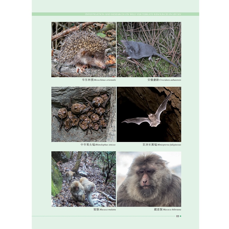 天目山脉是华东地区长江与钱塘江流域的分水岭,具有重要的地理标志意义,生物多样丰富,在全省生态保护和自然保护地保护管理领域地位显著、成效突出。本书根据最新区域野生动物资源调查以及最新的动物分类研究成果,全面记录了该区域39目144科655种野生脊椎动物,其中兽类76种, 鸟类382种,爬行类58种,两栖35种,鱼类104种。在编写时,按最新的分类系统进行归类,每种动物介绍其中文名、拉丁学名、简单形态描述、生境、适生范围等,并配彩色照片数幅。全书内容丰富、新颖,图文并茂,对兽类、两栖类、爬行类、鱼类资源调查具有实践意义。