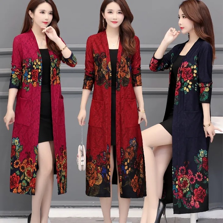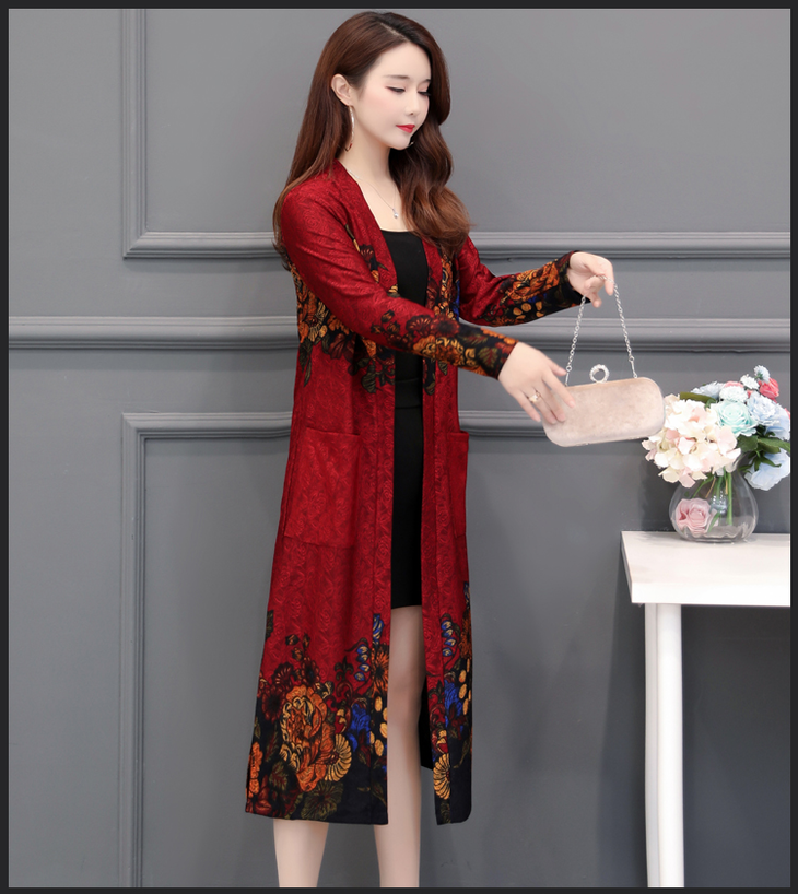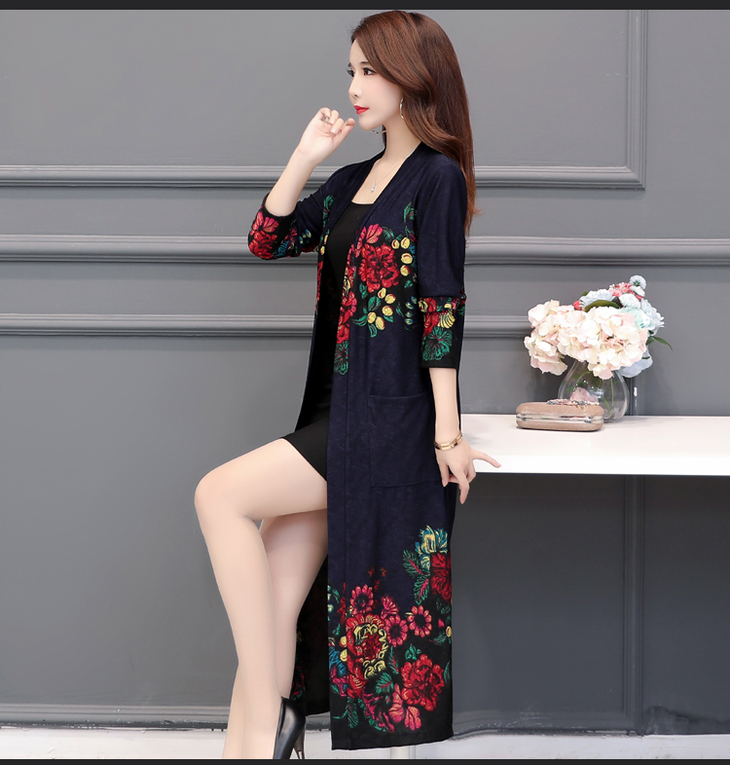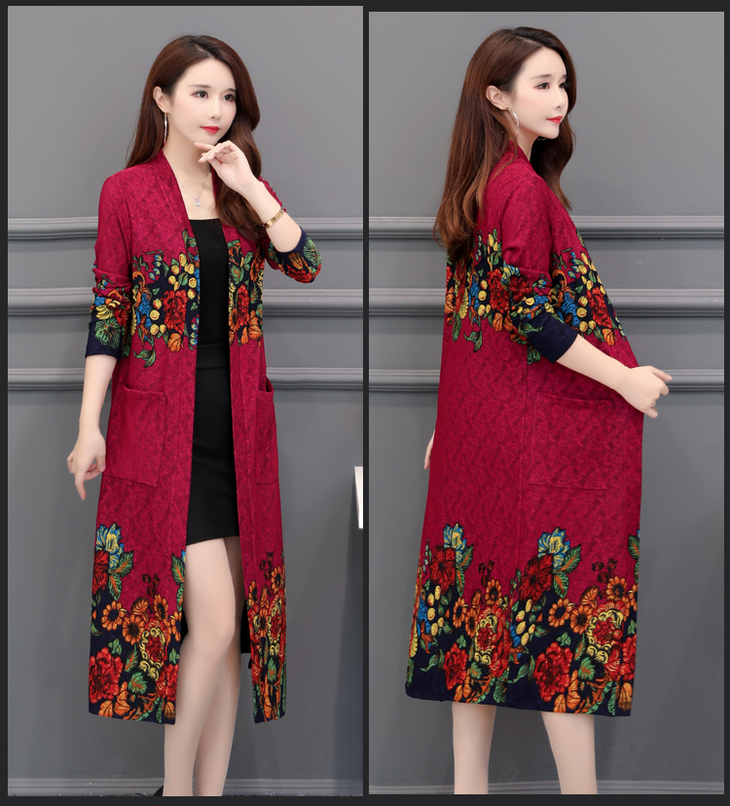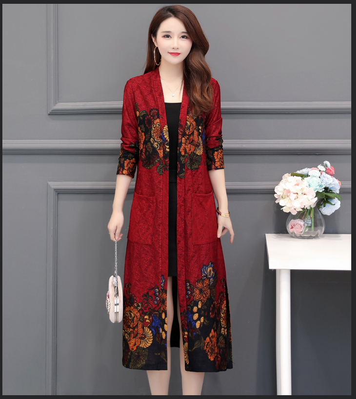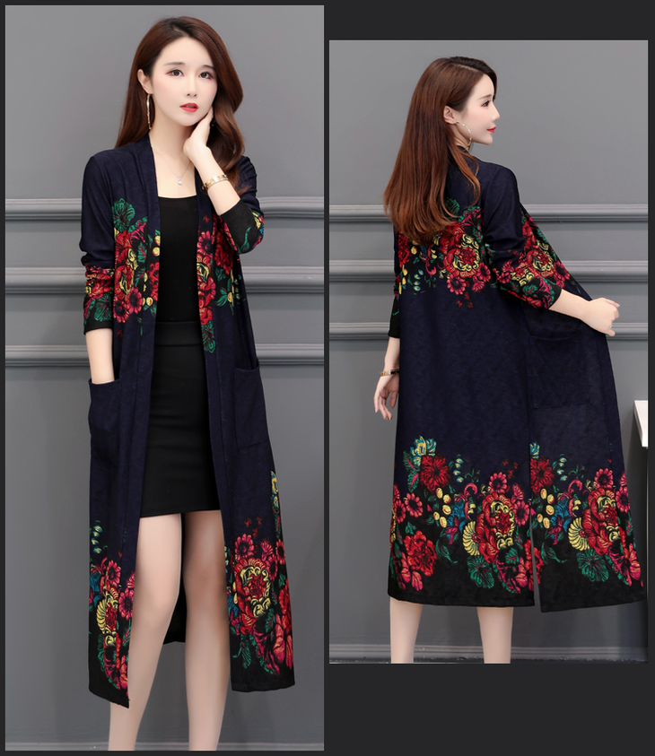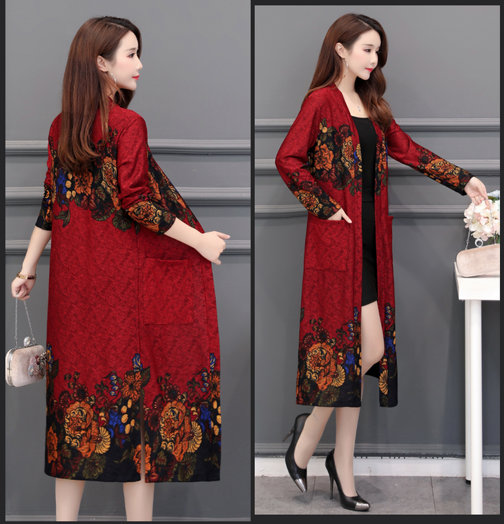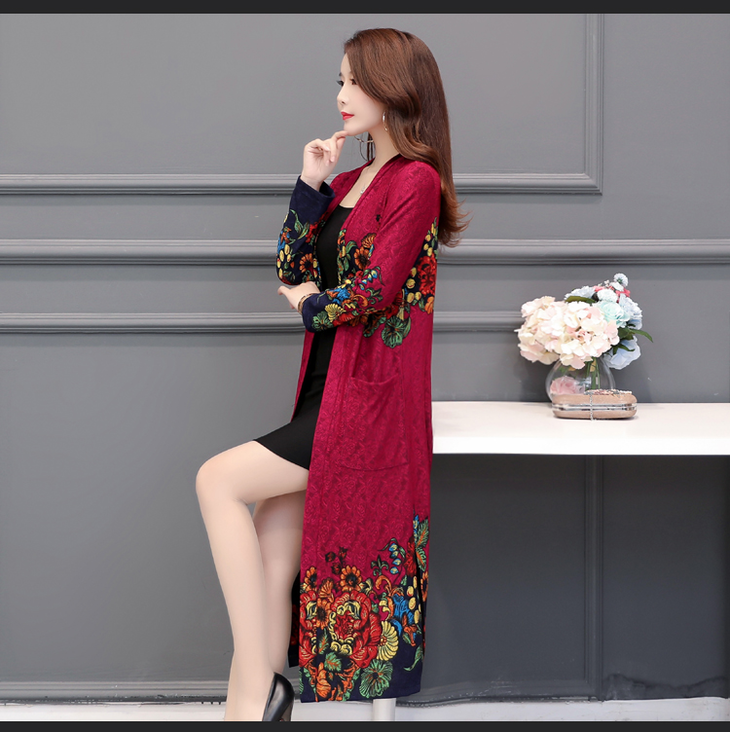 JXG-春季外套女长款过膝印花民族风外搭中老年宽松大码开衫春秋天披肩
