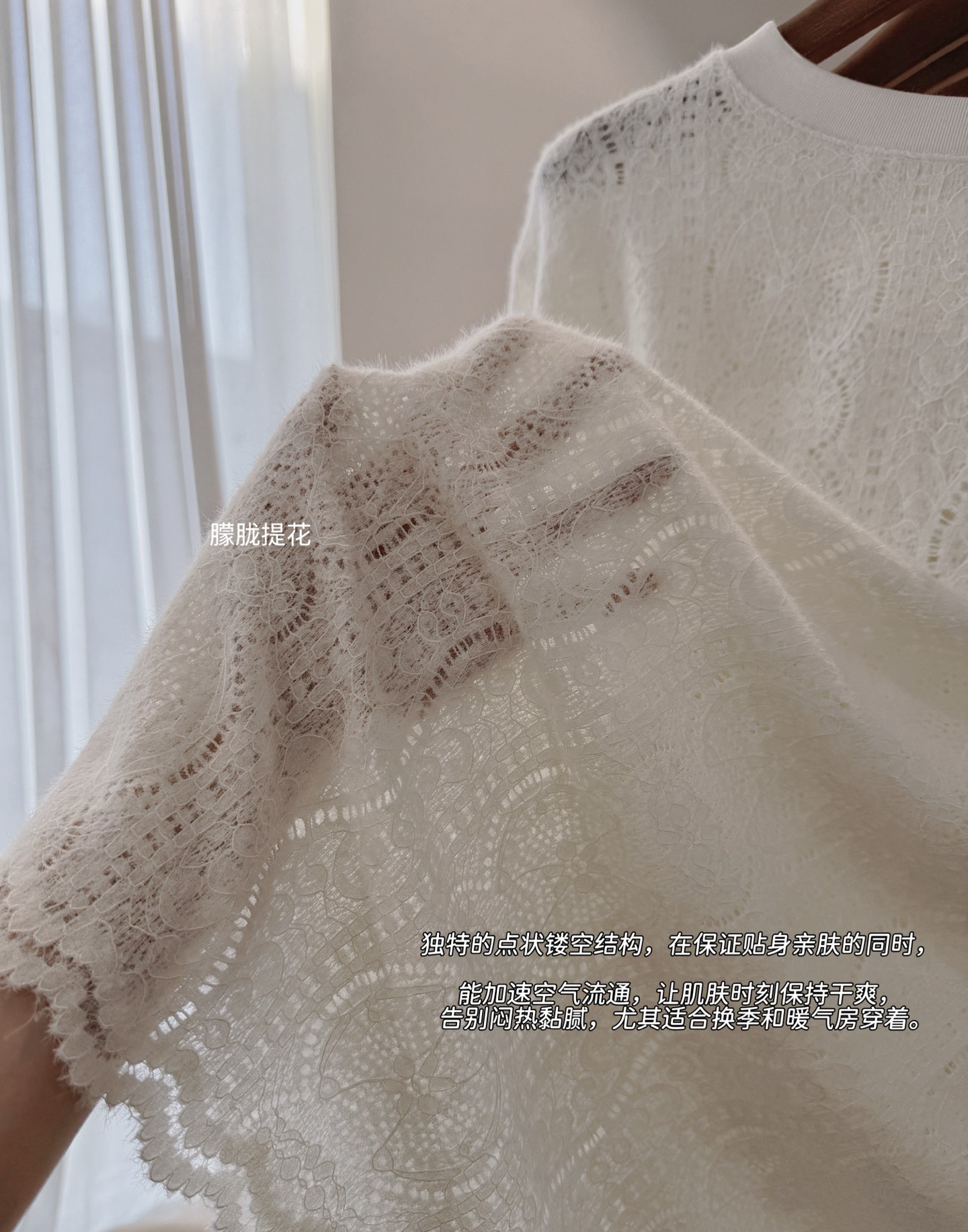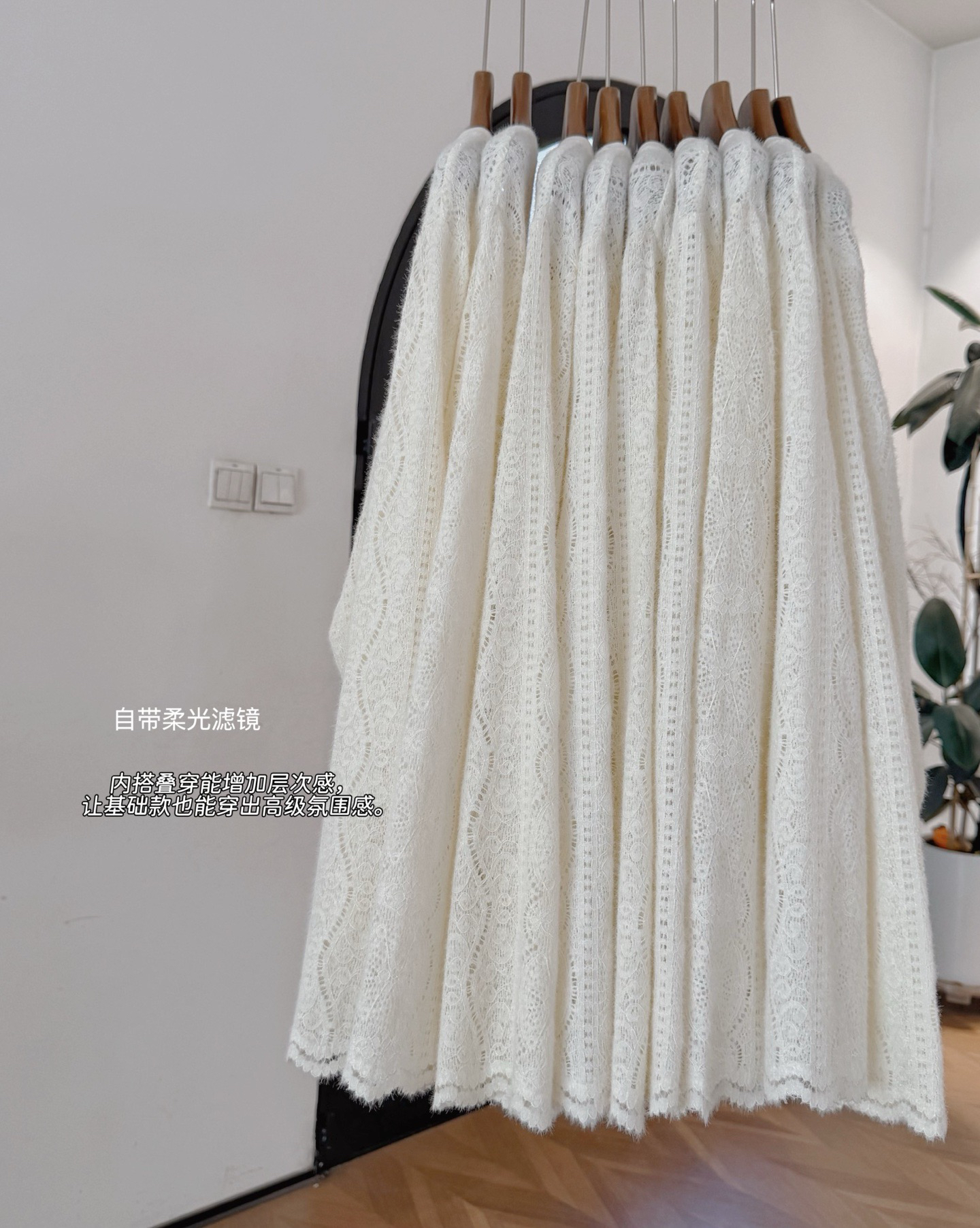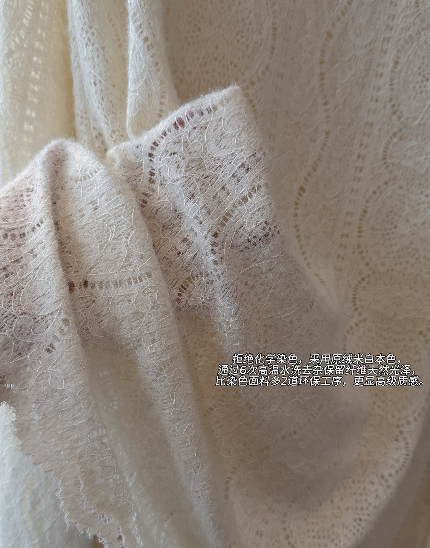 运用镂空机织和睫毛蕾丝的工艺,既有柔软的触感 同时具备蕾丝花型的筋骨!表层模拟兔绒感的毛丝纤维 丰盈且亲肤,毛绒绒的触感 完全不扎!!