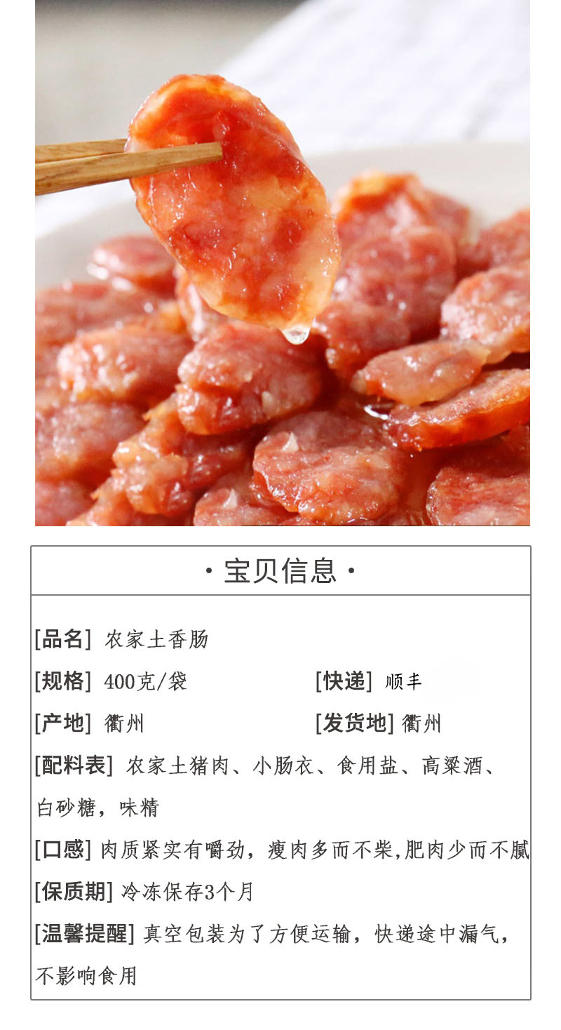 【农家土香肠】400克/袋*2,每袋8根左右,纯土猪肉现做,70%瘦肉+30%肥肉,还得用土猪肉来做,新鲜的后腿肉、夹心肉再配上脊梁部位的肥肉,灌肠后需要9天的时间烘烤晾晒,才有鲜香紧实的土香肠!~