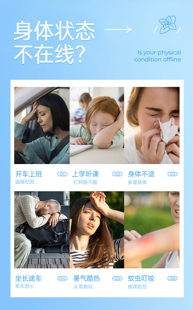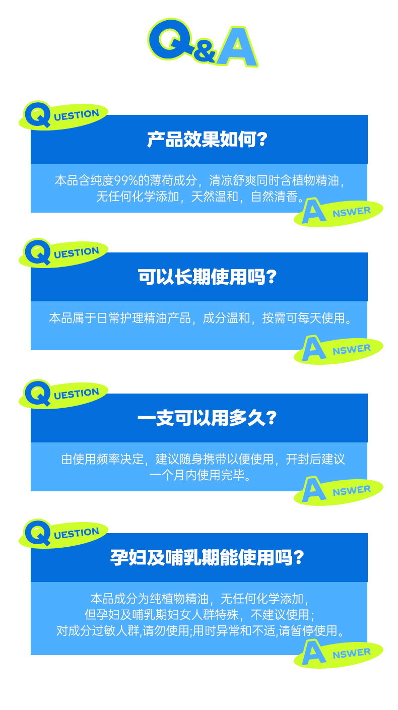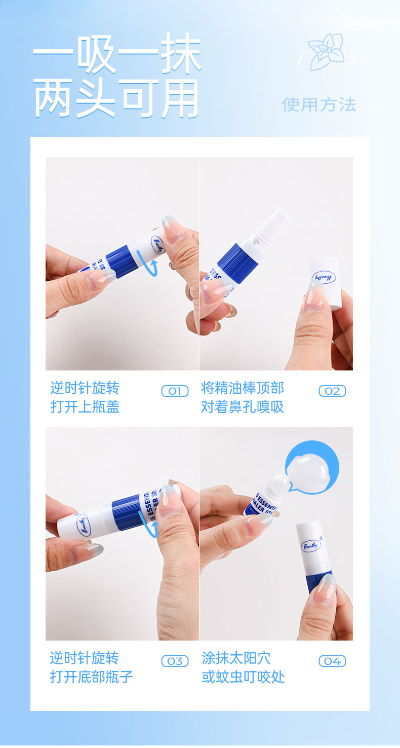 【使用方法】旋开上瓶盖,将本品靠近鼻子来回吸闻数次,可根据需要增加次数;旋开底部瓶子,将精油涂抹于所需部位