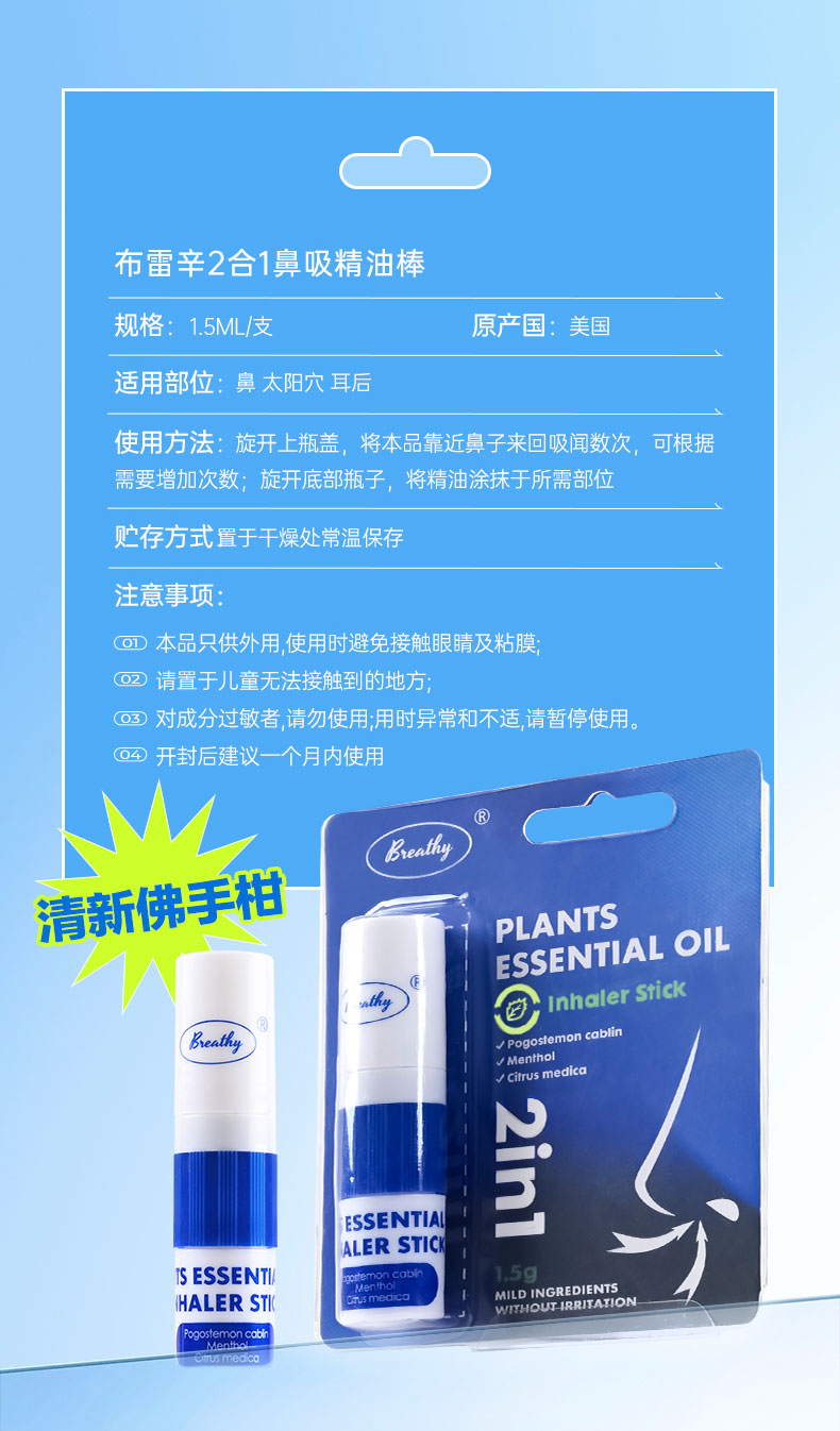 【产品名称】布雷辛2合1鼻吸精油棒(清爽佛手柑)