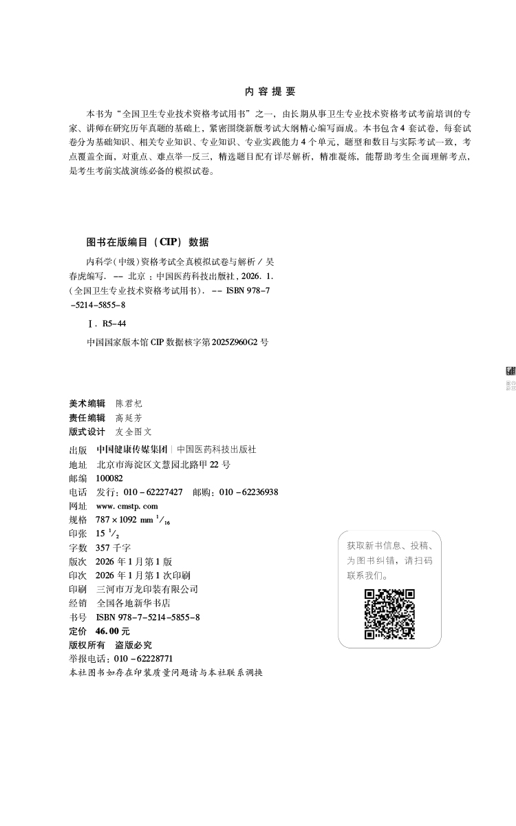 内科学(中级)资格考试全真模拟试卷与解析 全国卫生专业技术资格考试用书 吴春虎 主编 中国医药科技出版社