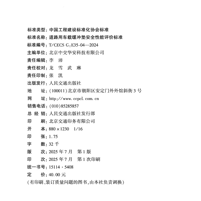 书名:道路用车载缓冲垫安全性能评价标准(T/CECS G:E35-04—2024)