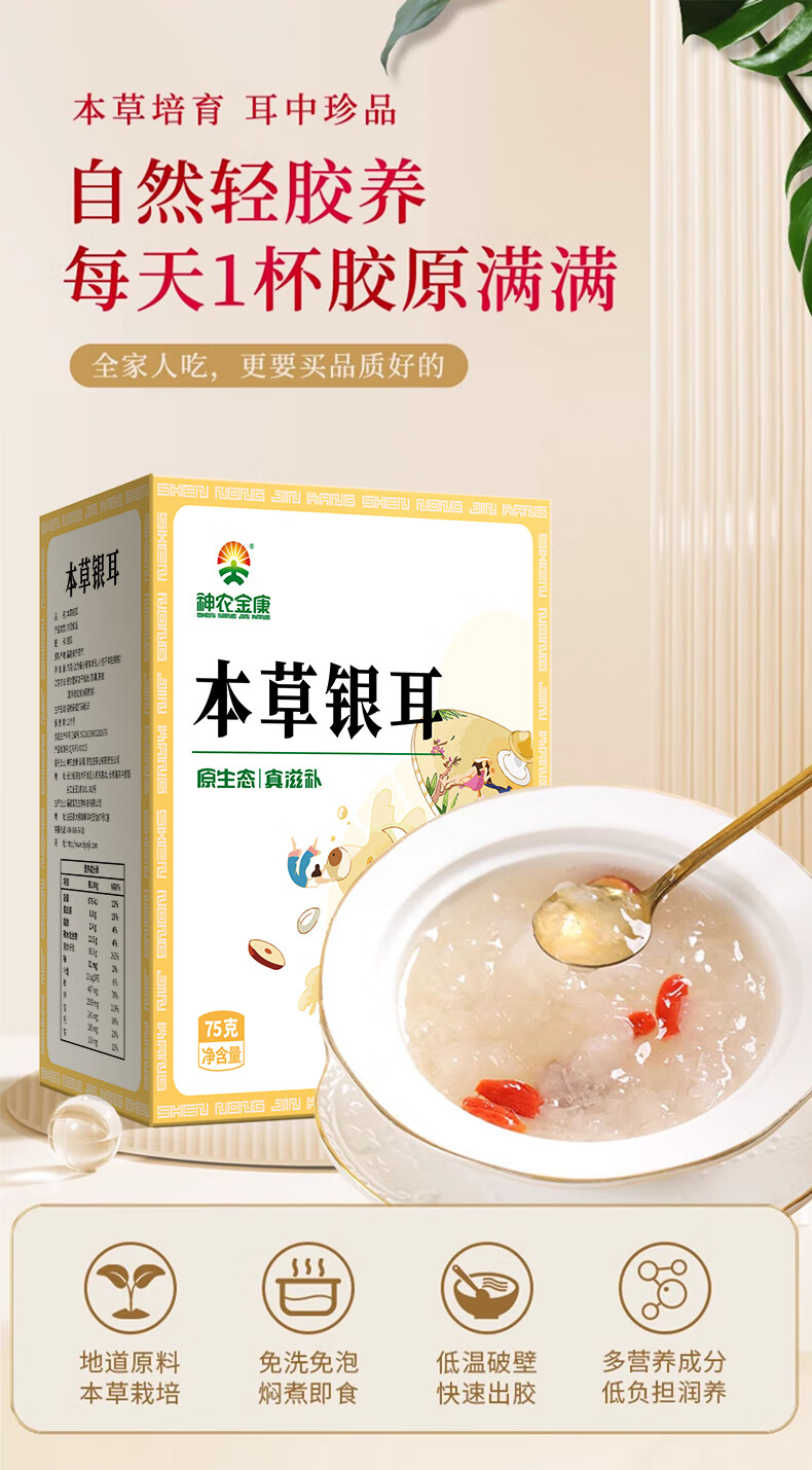 【下单即送280g银耳伴侣】神农金康 本草银耳75g 免洗免泡即食易出胶 独立小包 原生态真滋补 喝护家人健康