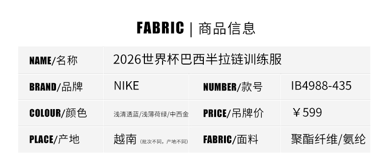 SFS耐克Nike巴西2026世界杯半拉链长袖训练服运动热身 IB4988-435