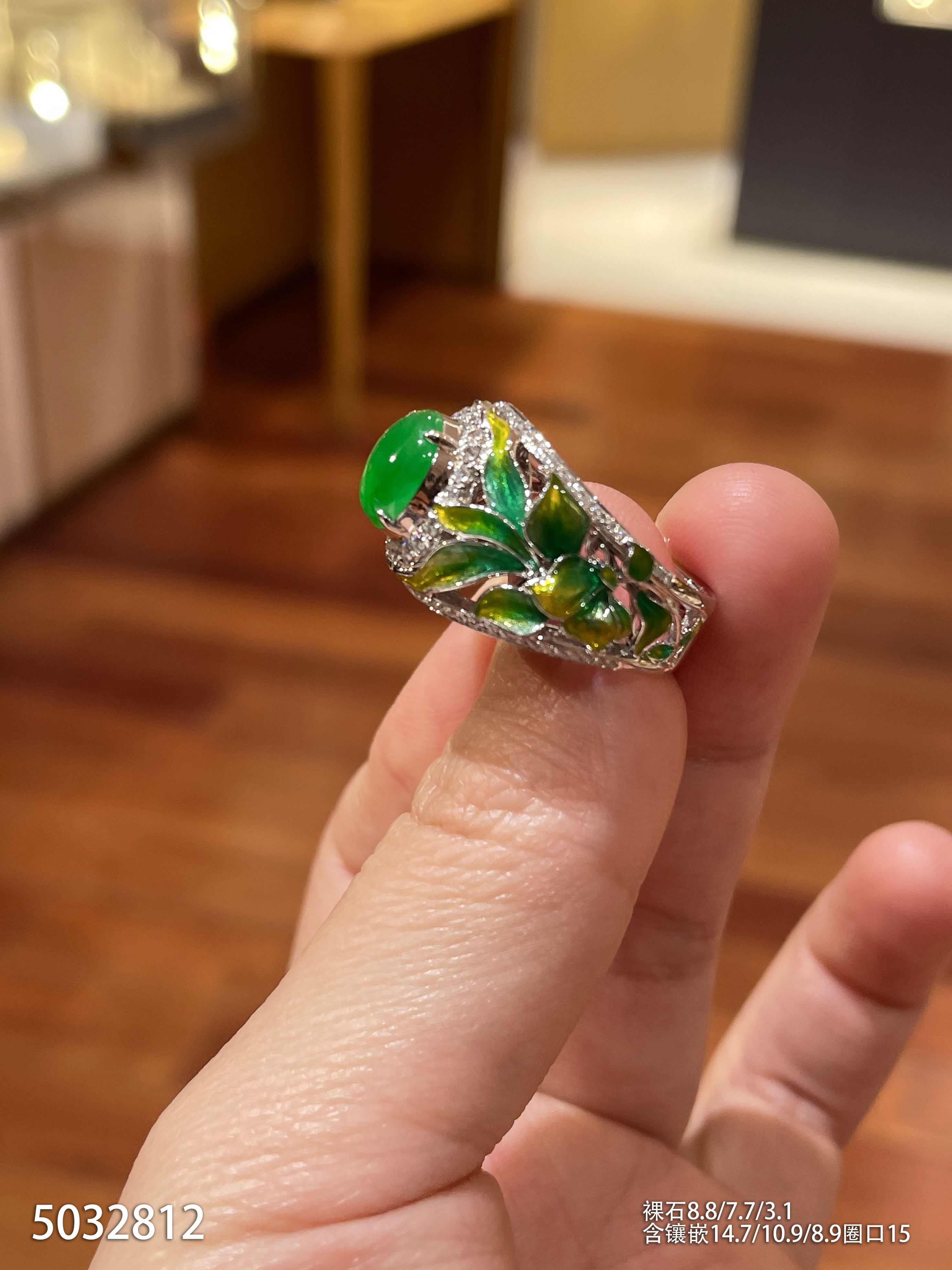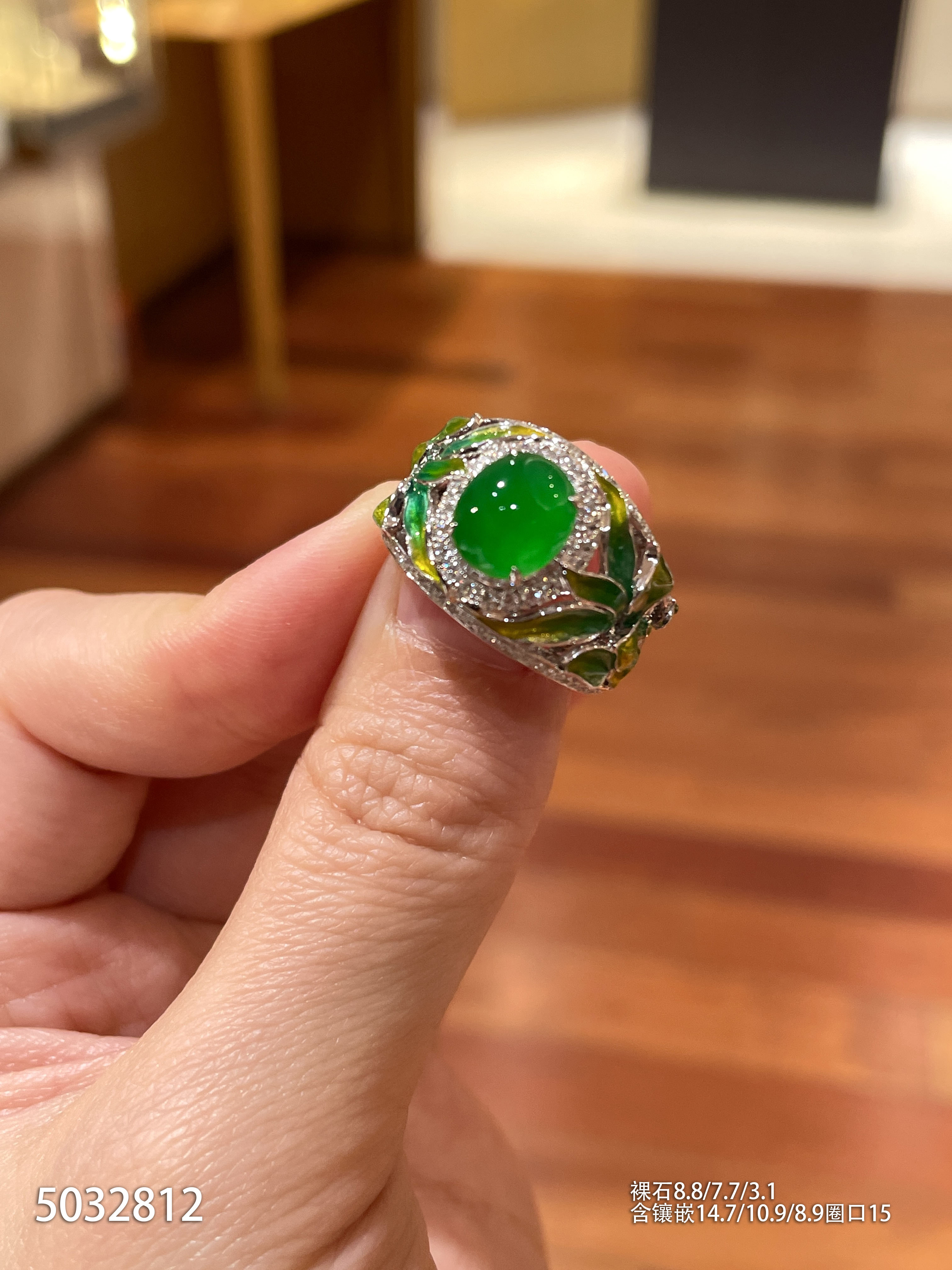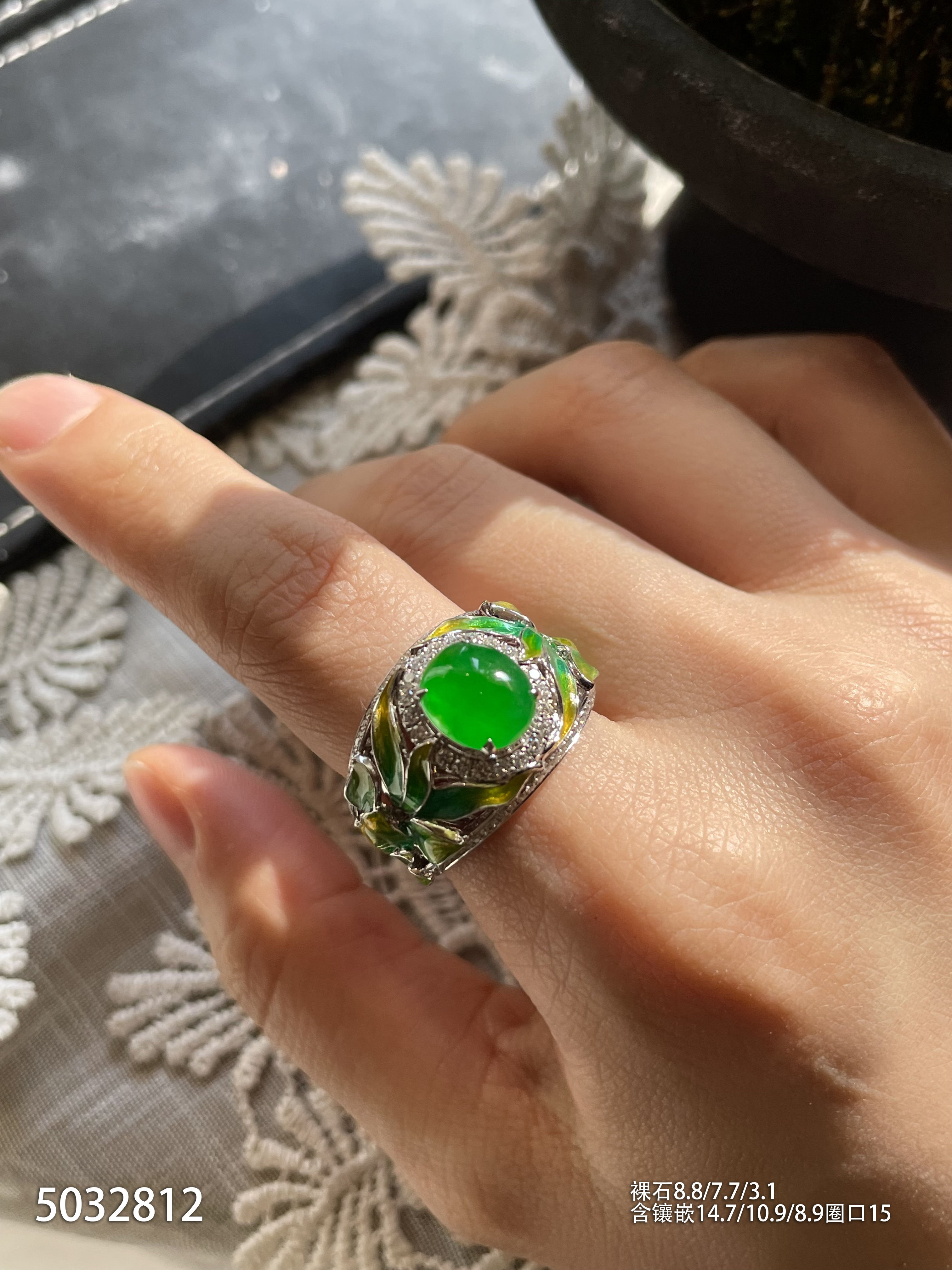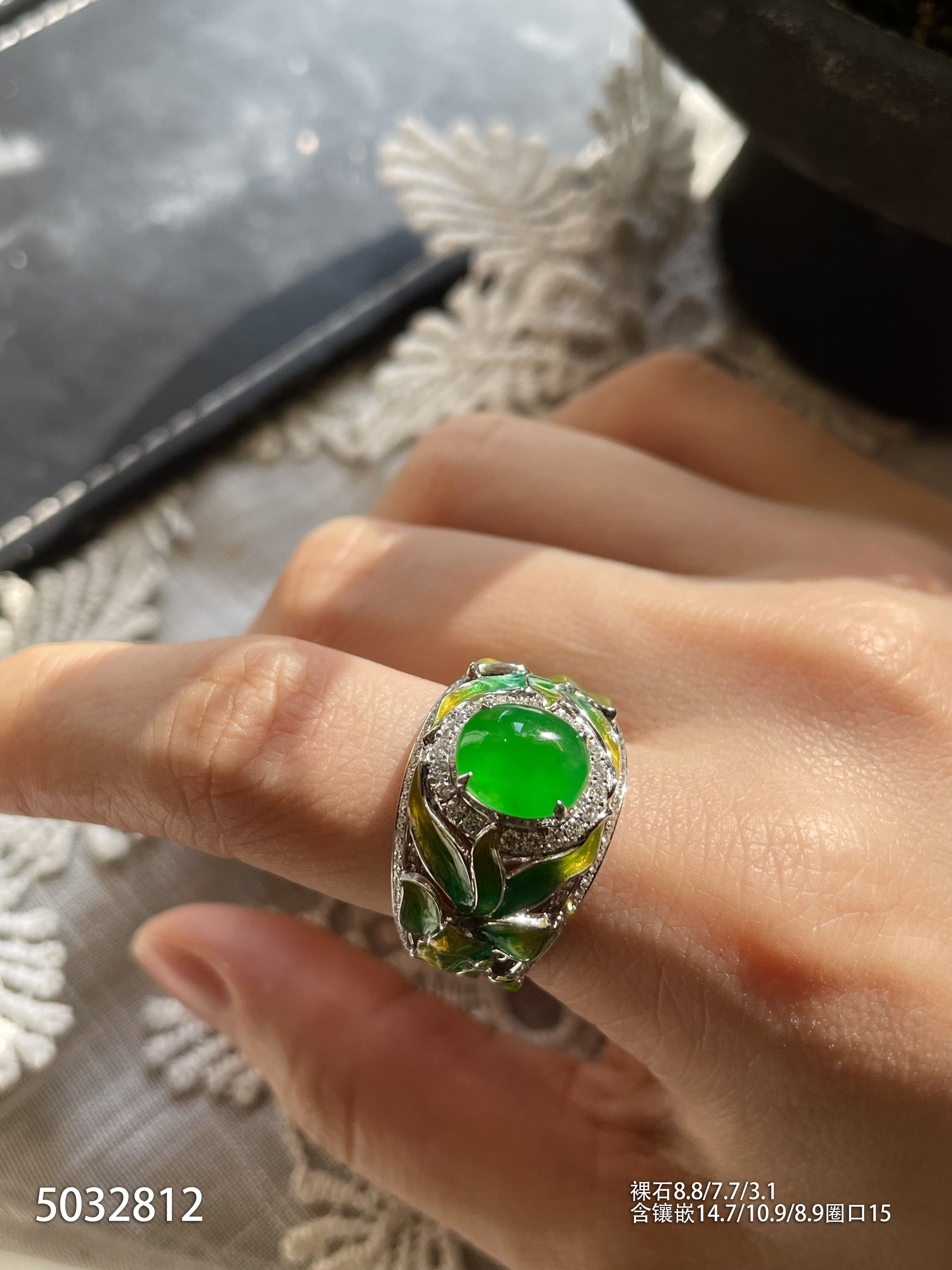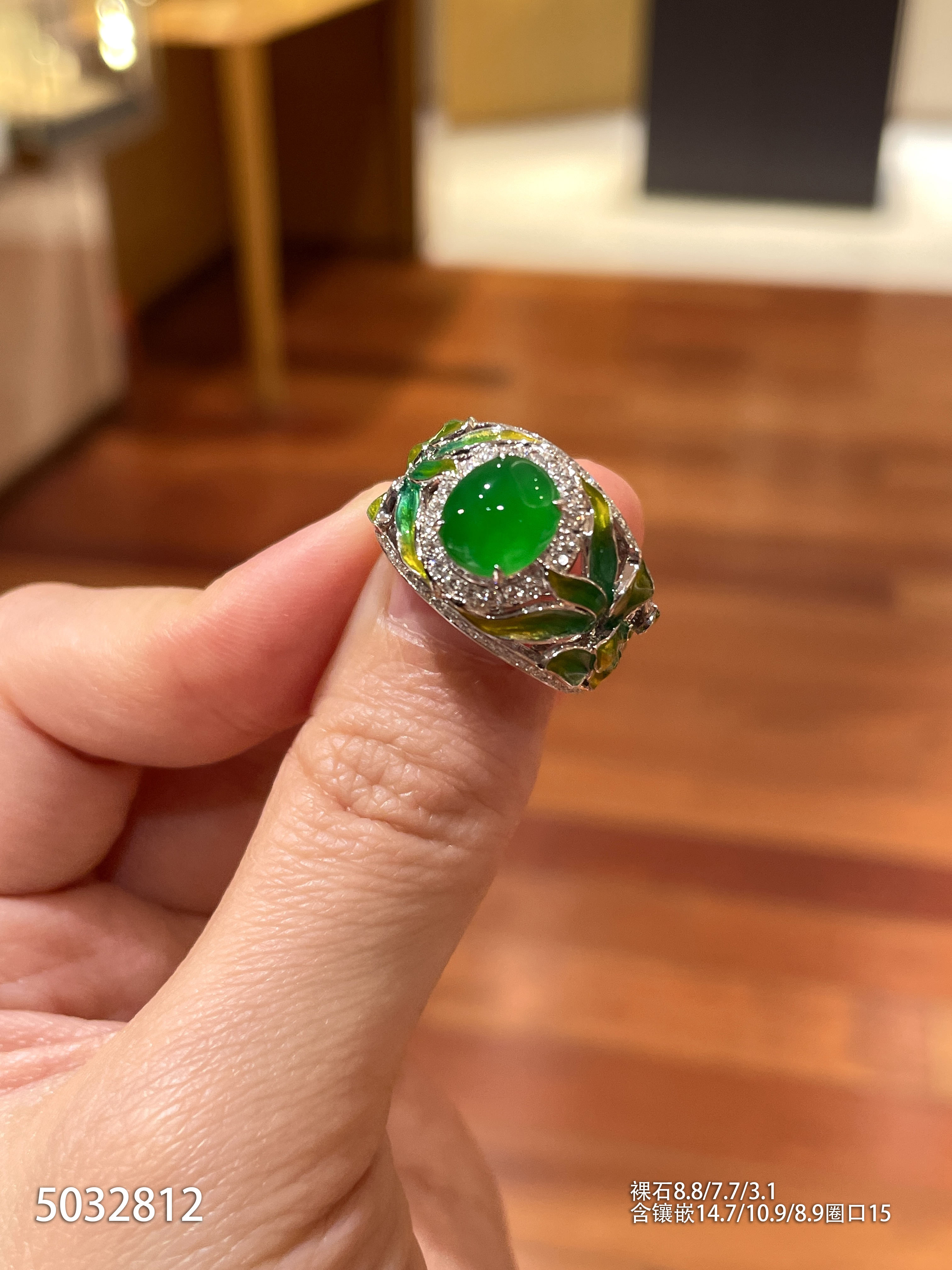 120-1232908,玻璃种木那艳绿蛋面戒指,具体价格微信咨询