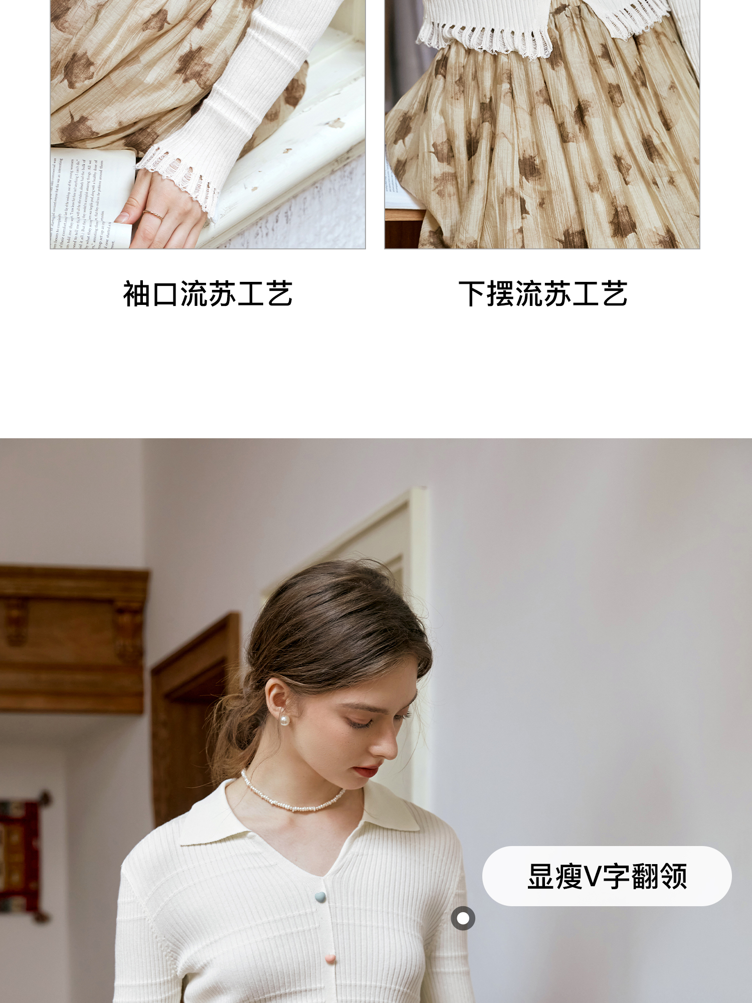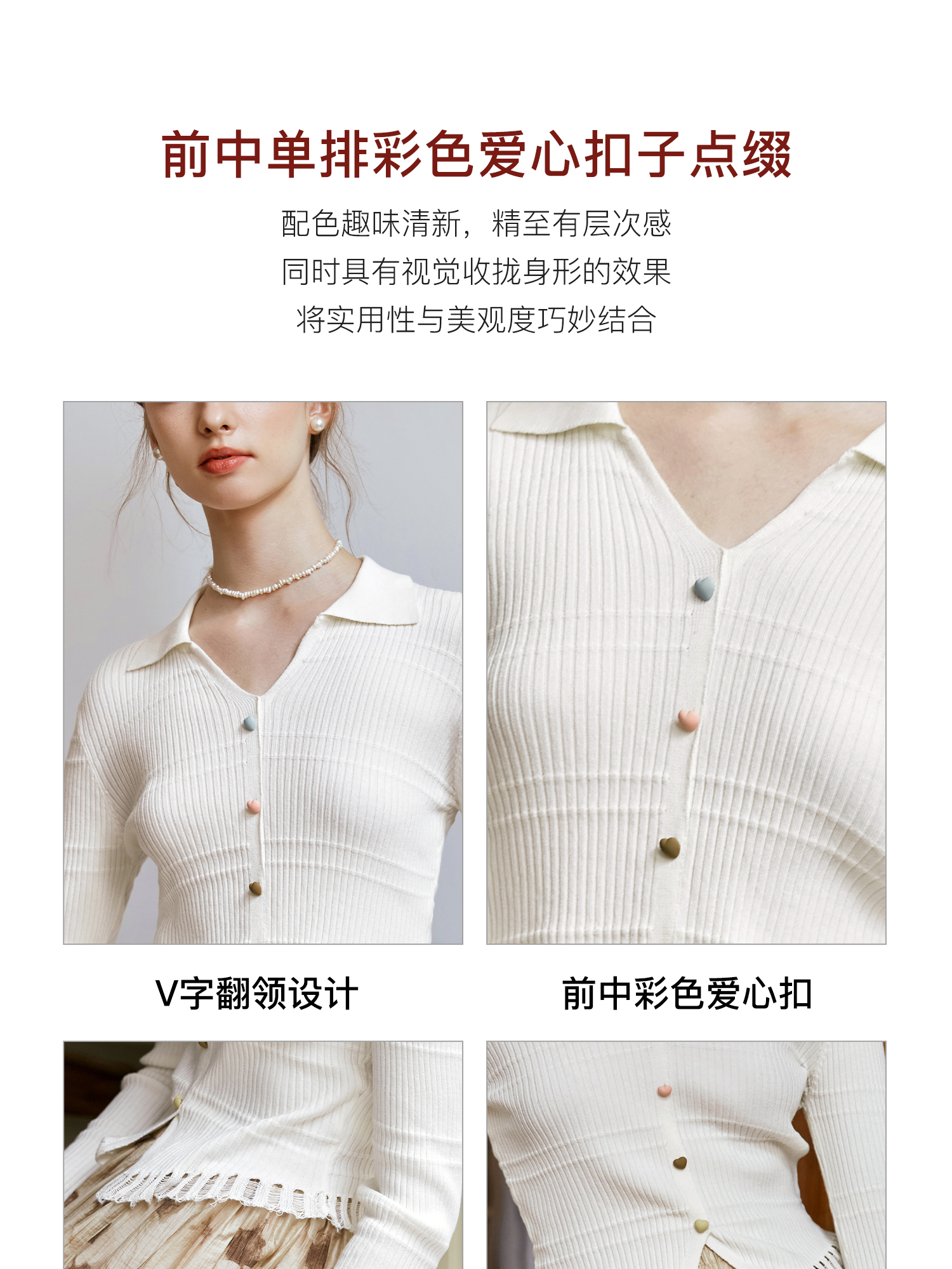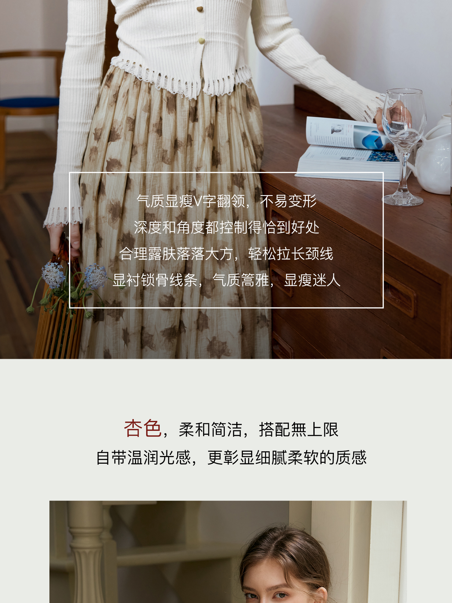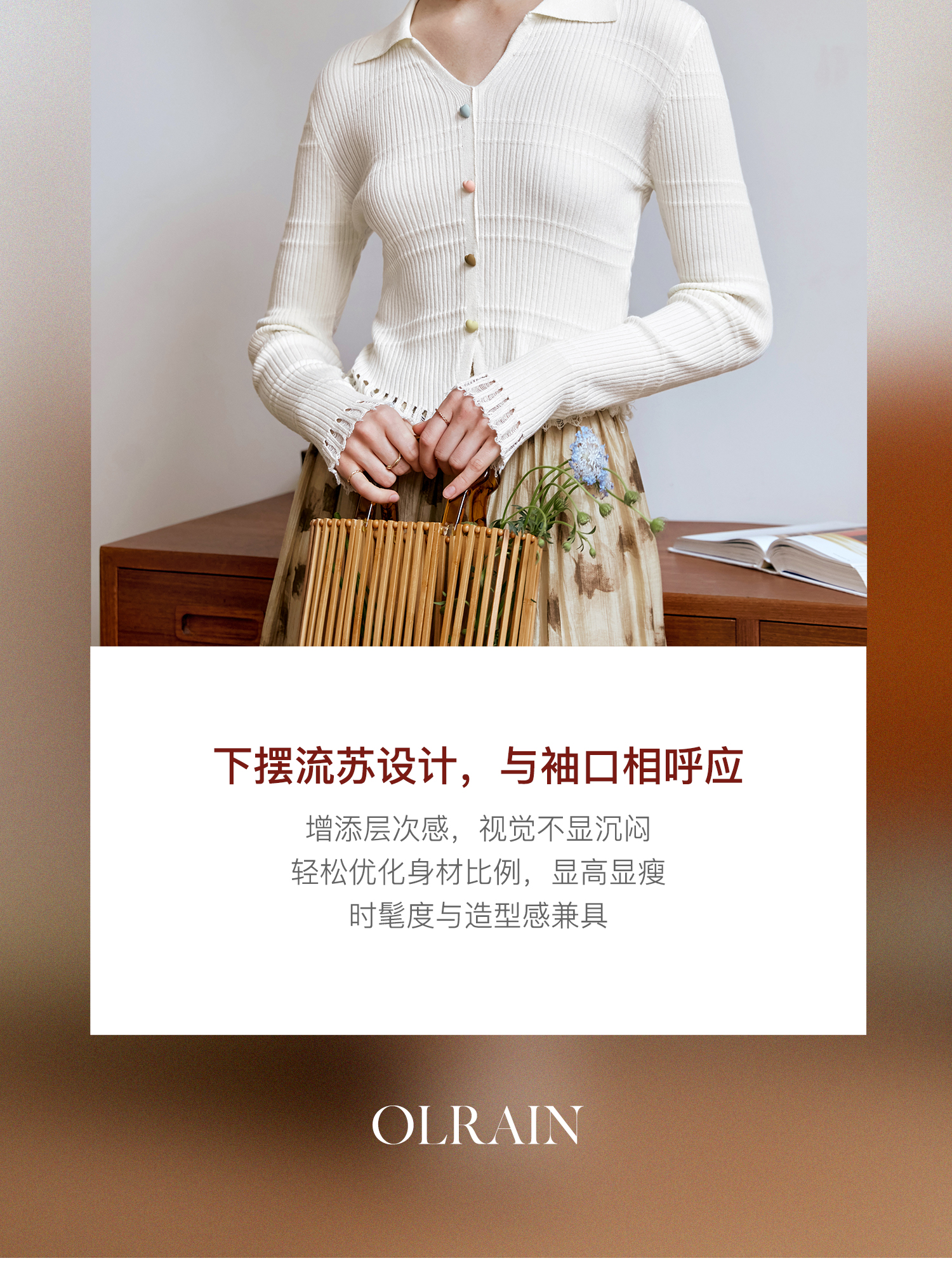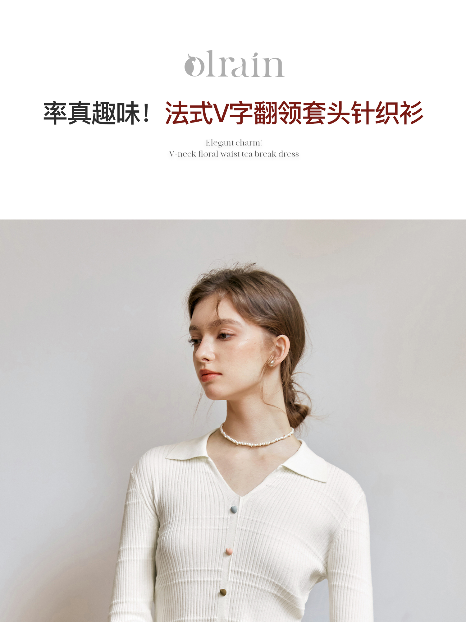 OLrain欧芮儿法式杏色v领针织衫女秋季2024新款修身收腰翻领上衣