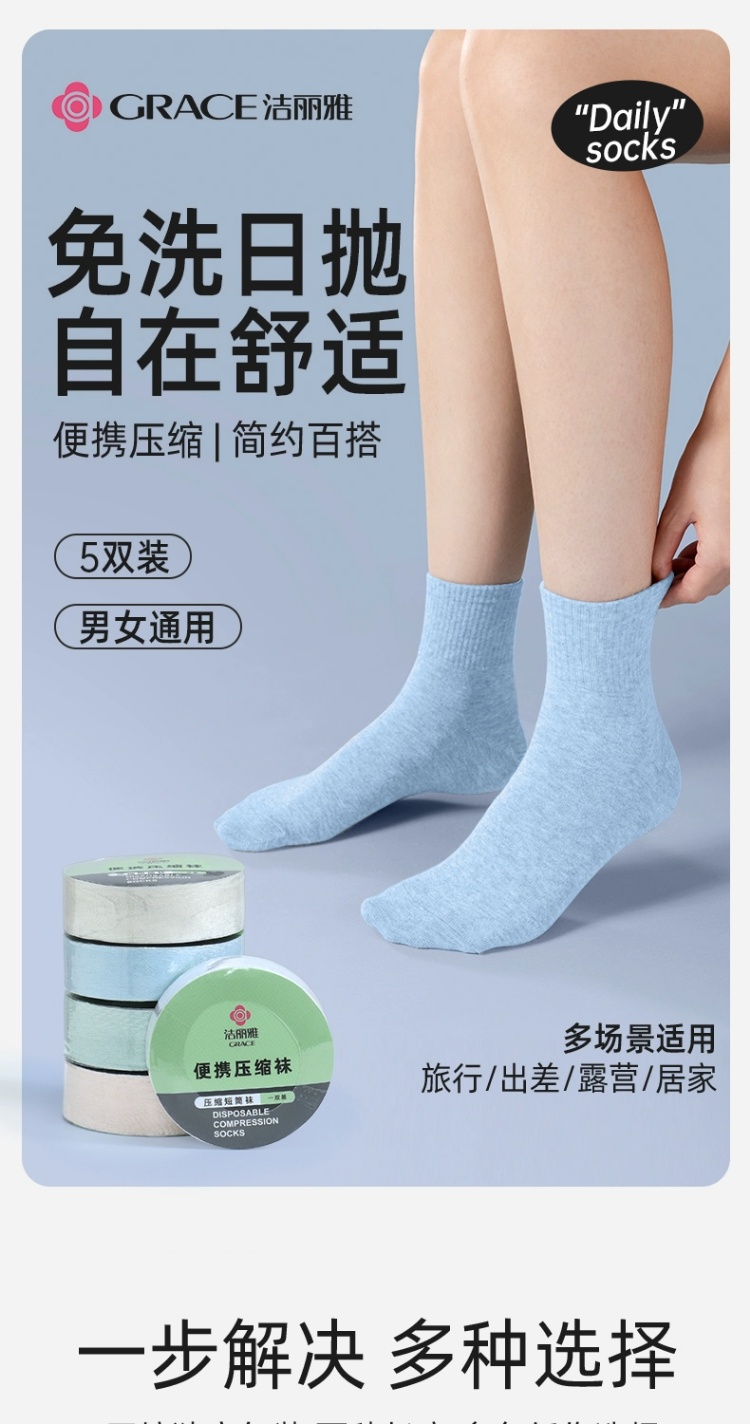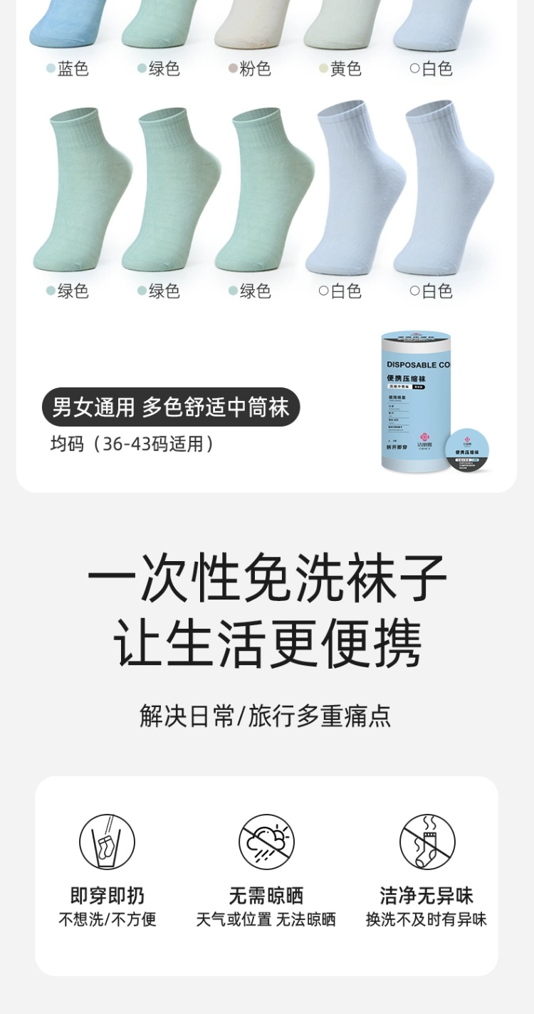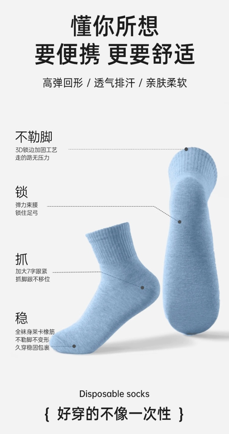 洁丽雅压缩一次性女彩色袜子男士日抛短中筒袜纯色免水洗旅行便携