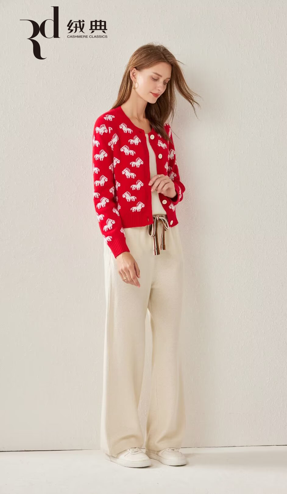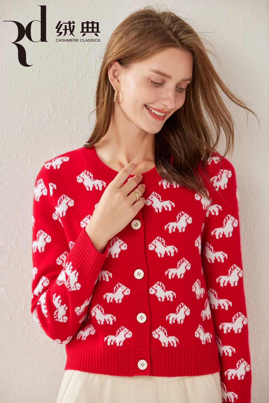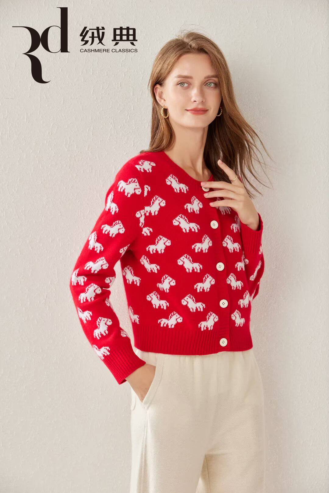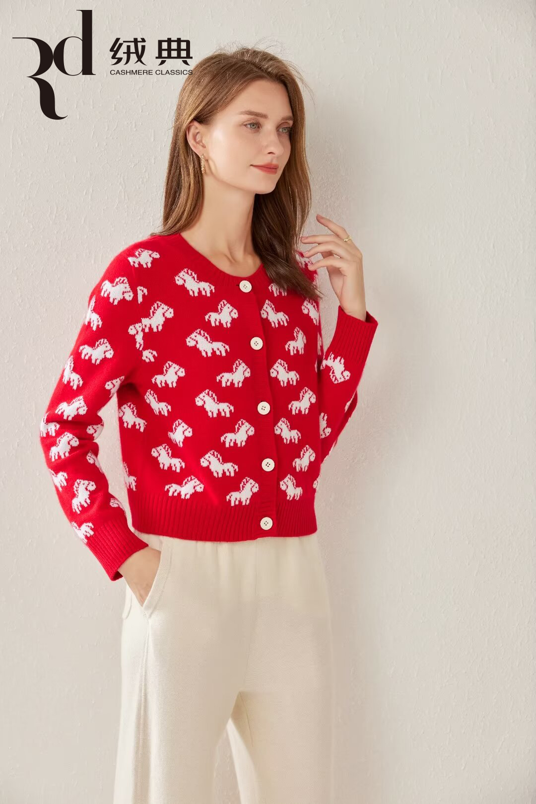 绒典圆领加厚提花女开衫