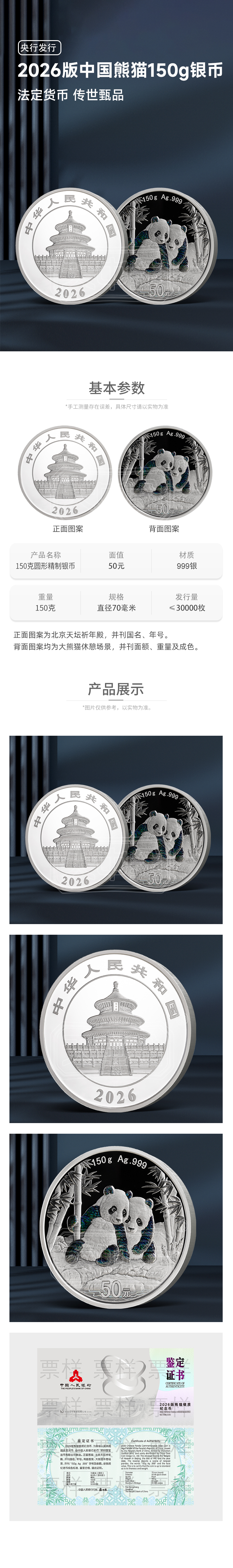 【精制币】2026年熊猫150克精致银币 幻彩效果 Ag999