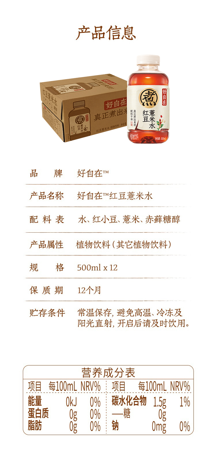 【官方直发】元气森林好自在红豆薏米水500ml*12瓶