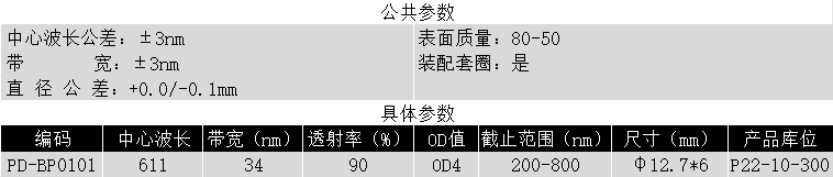 BP611/34K OD4@200-800 T>90% Φ12.7*6 带通滤光片 (带套圈)