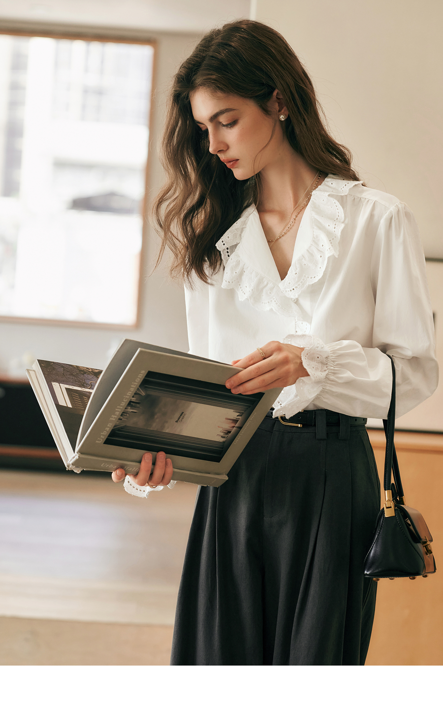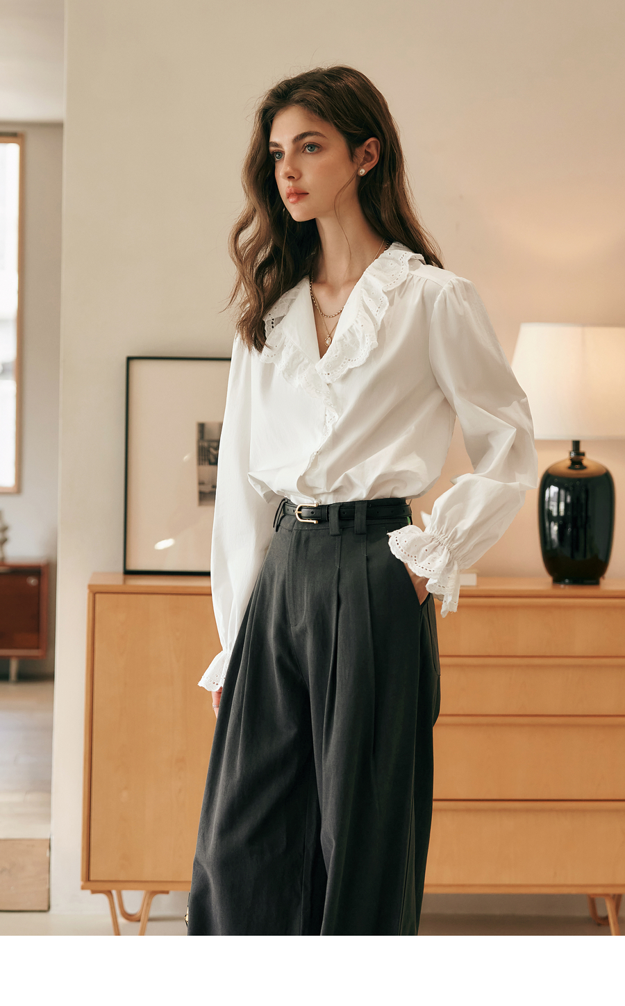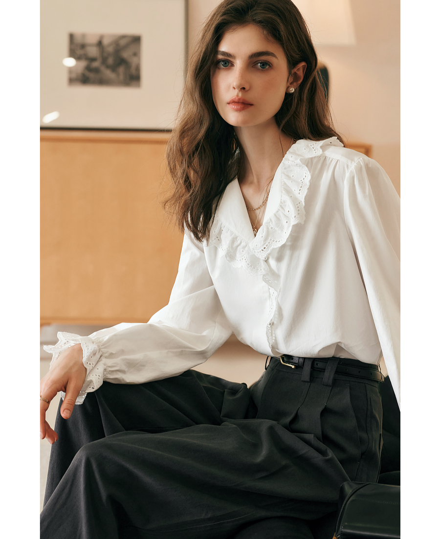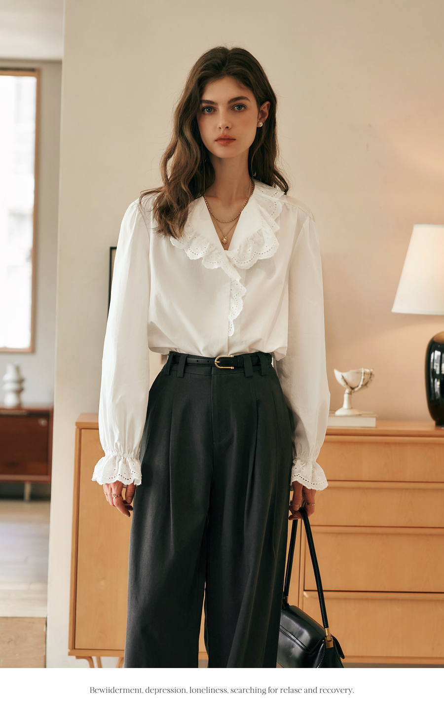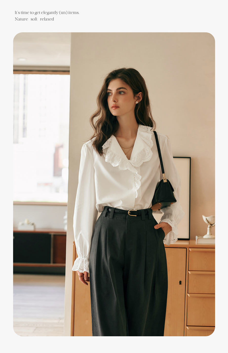 OLrain欧芮儿法式蕾丝衬衫女冬季2024年新款气质通勤木耳边领衬衣